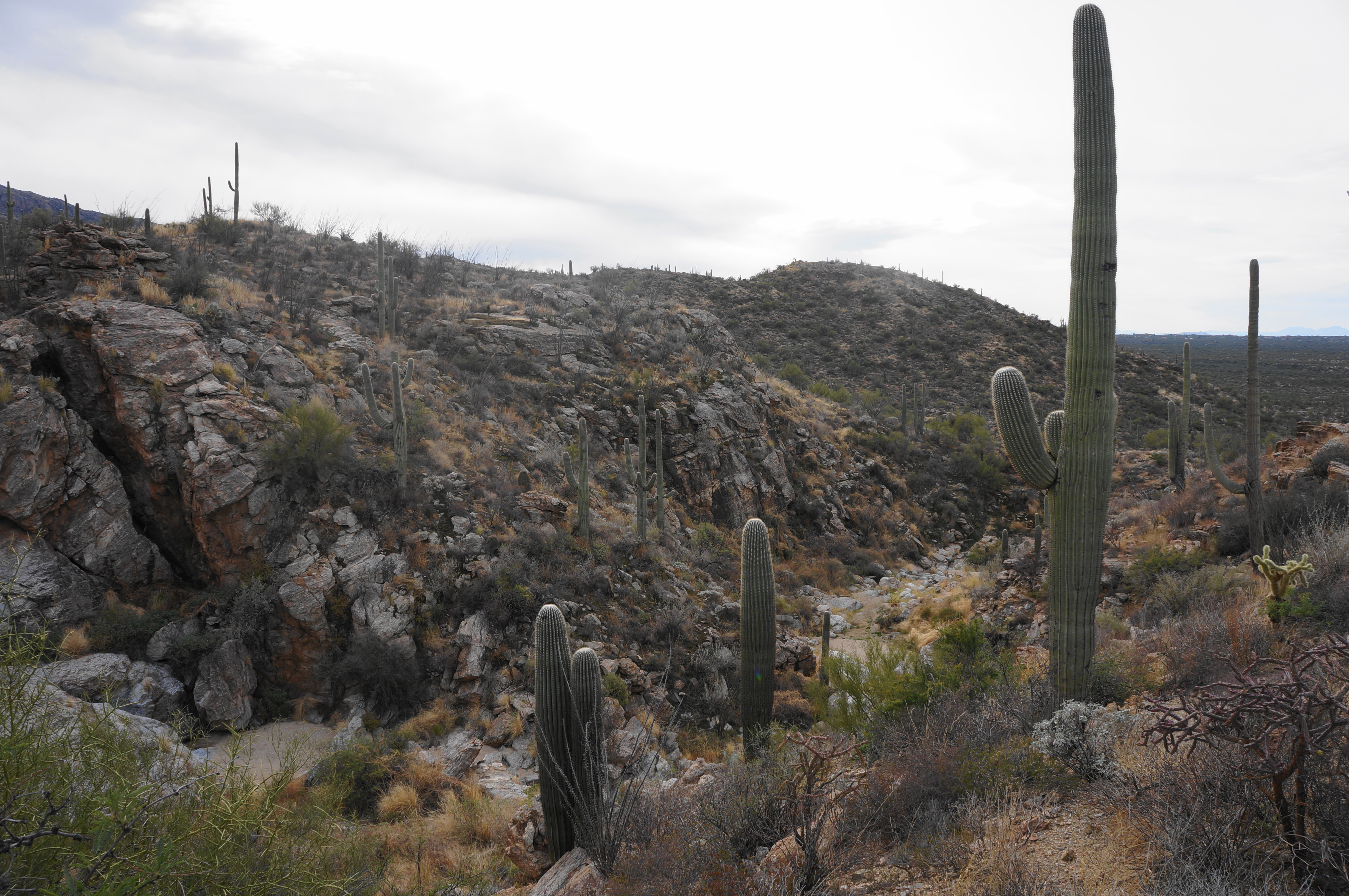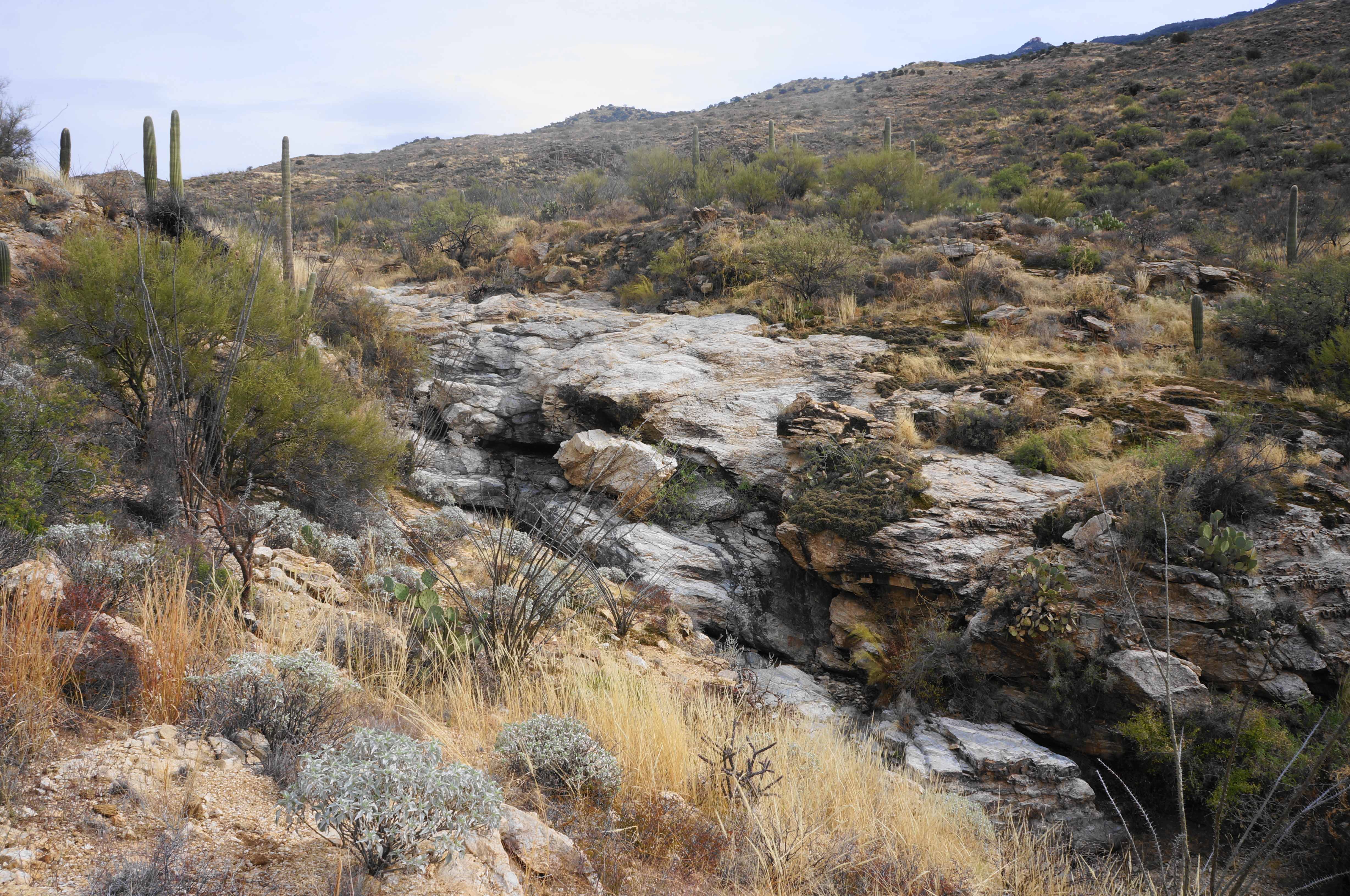 From here the Three Tank Trail begins a lengthy descent, with nice views much of the way. Cross a minor drainage at around 4.25 miles, then descend to a larger one, which forms an interesting canyon flanked in some area by relatively high, craggy walls. Hidden amid the brush is Mica Tank, down in the wash on your left; below the tank, the trail briefly enters the wash but then quickly exits off to the right. Now paralleling the wash below, the Three Tank Trail edges westward amid another large stand of saguaros, bypassing a series of pouroffs on the left.