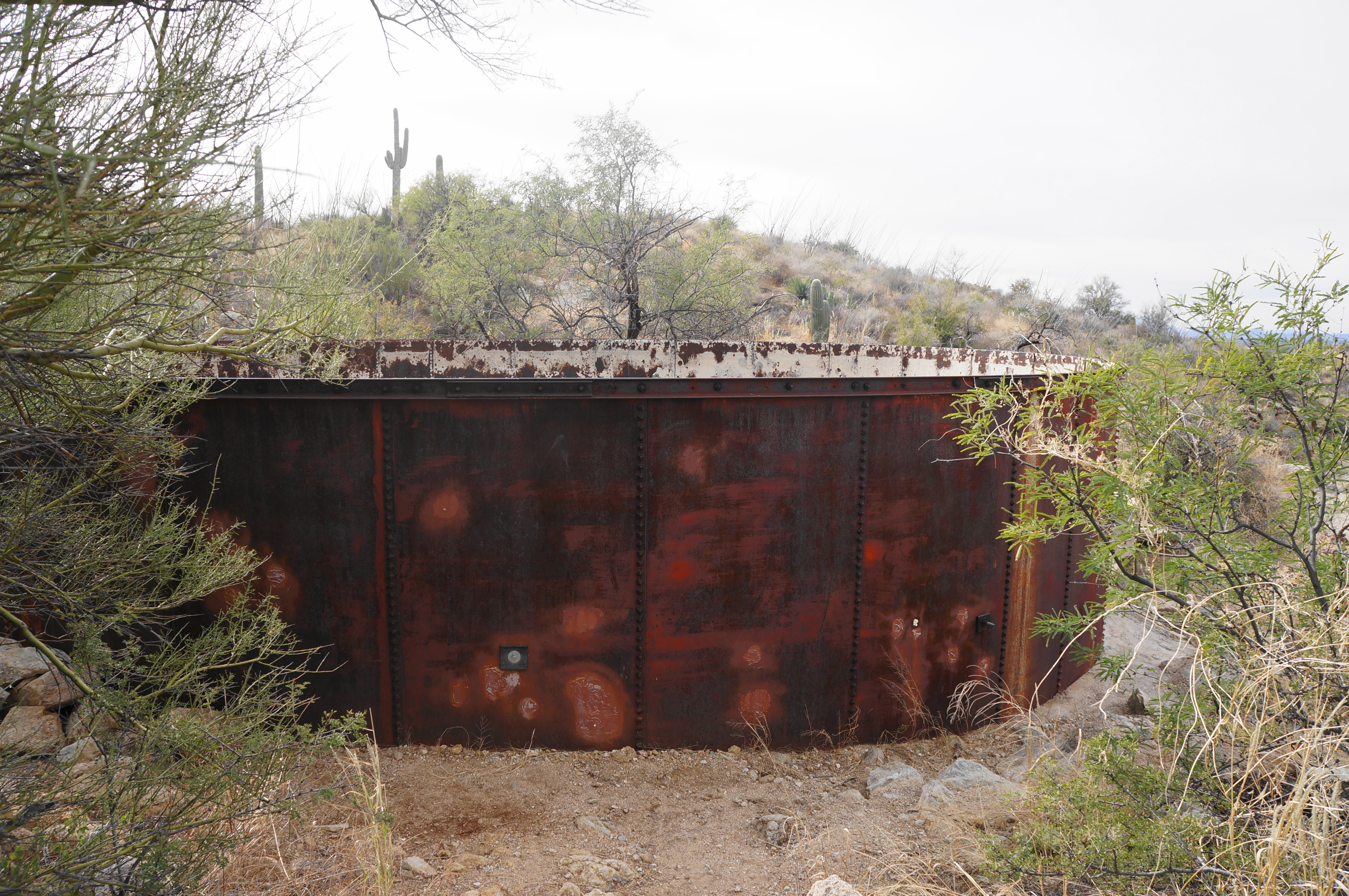 Soon the Three Tanks Trail drops precipitously to a confluence of two drainages and a somewhat confusing intersection of hiking trails. Visible ahead is the large Steel Tank, a manmade water basin that is now deeply rusted, with several holes in the base. Here hikers heading for Little Wildhorse Tank will want to take a hard left, skirting around to the west side of the tank. Briefly follow the lesser drainage eastward, then follow the Carrillo Trail as it exits right. (Note: You should not have to descend to the main wash.)