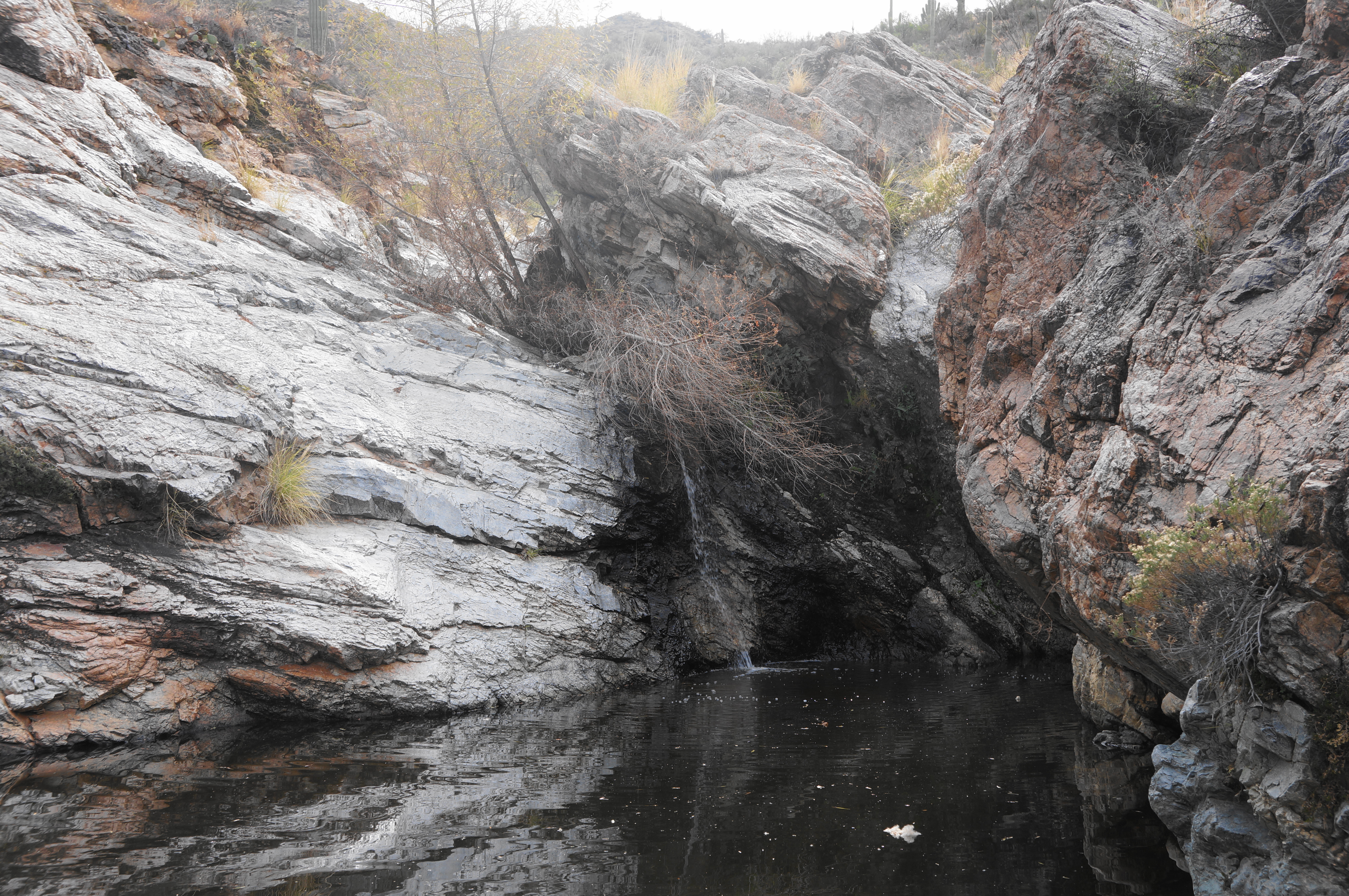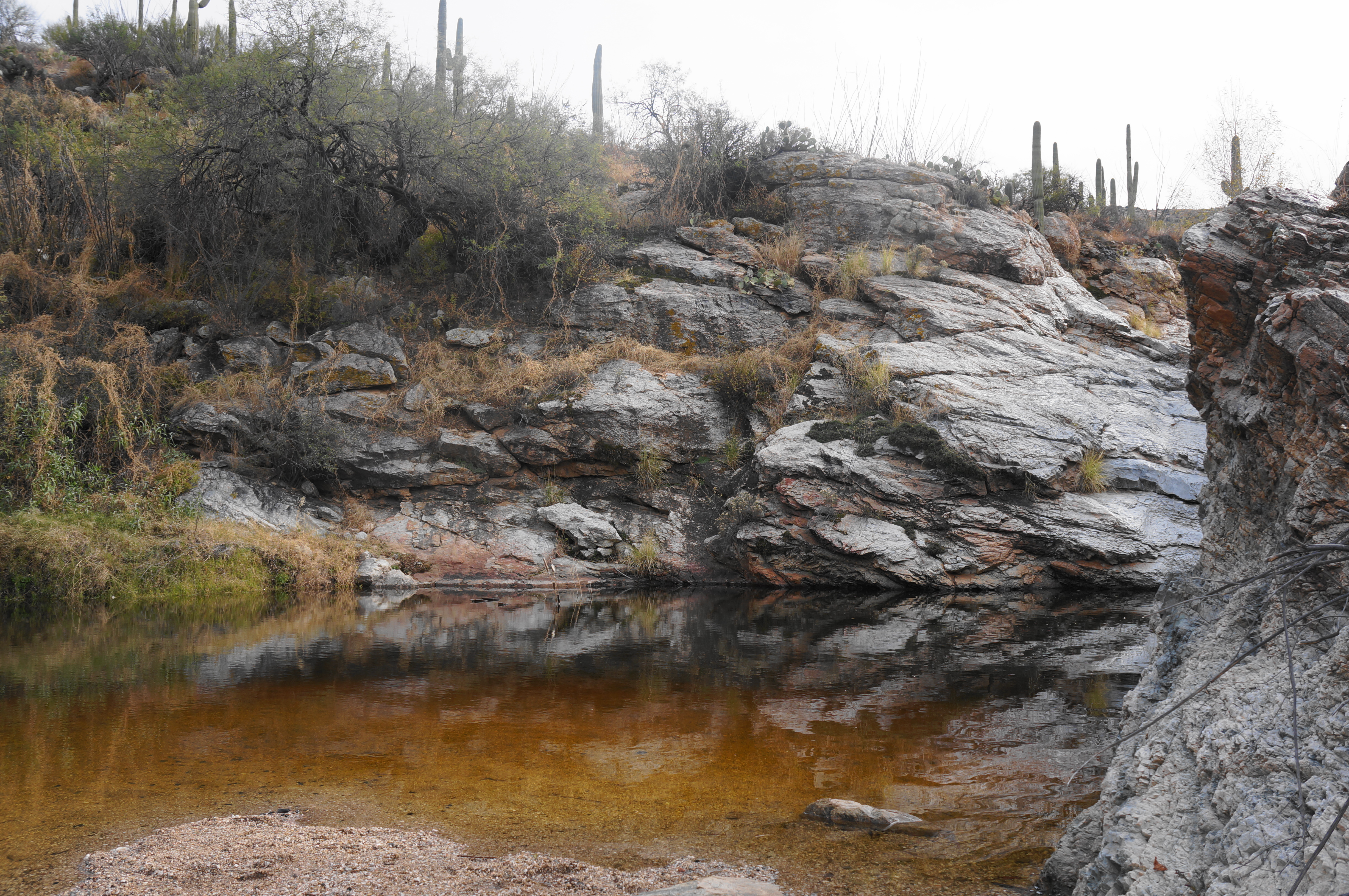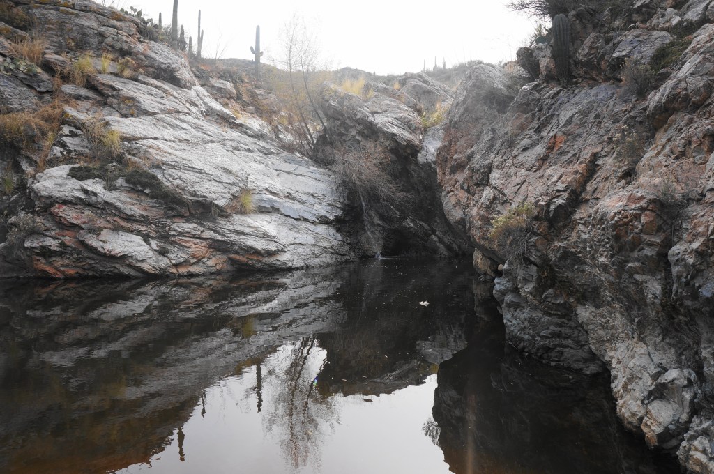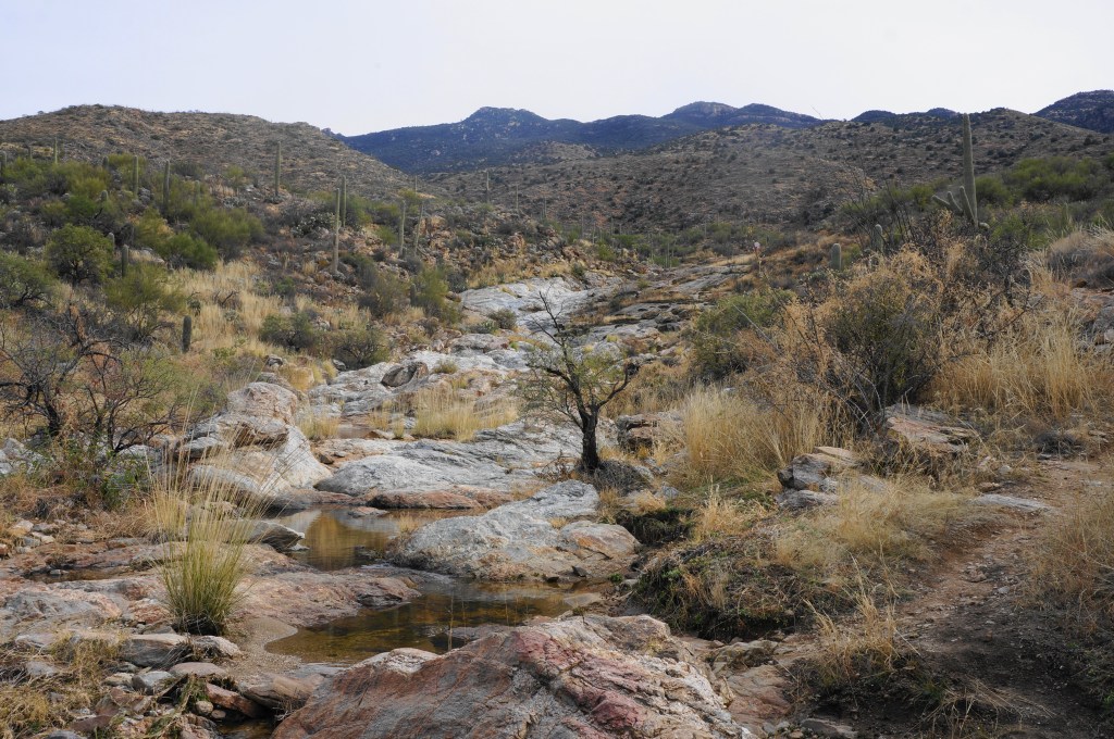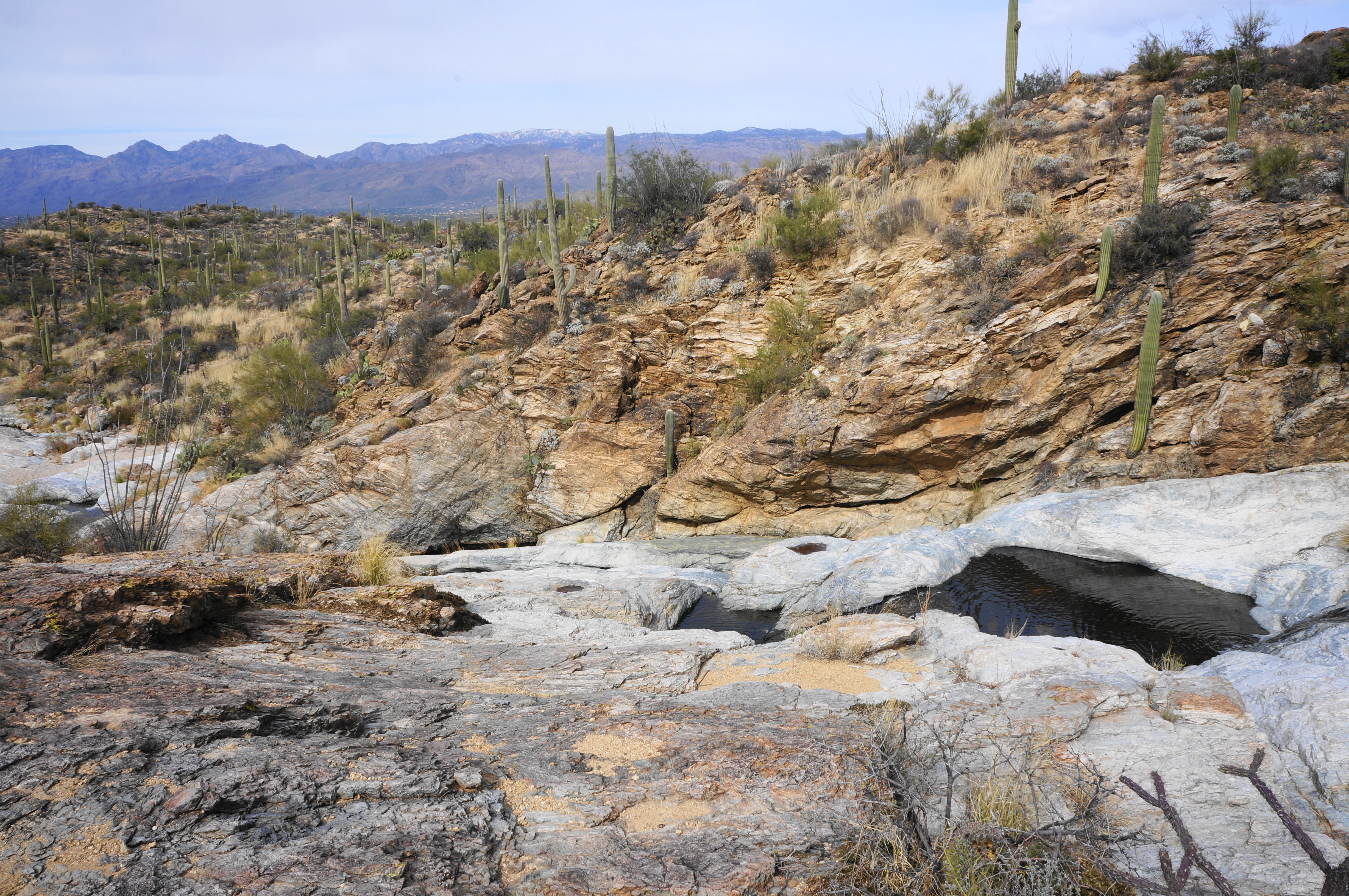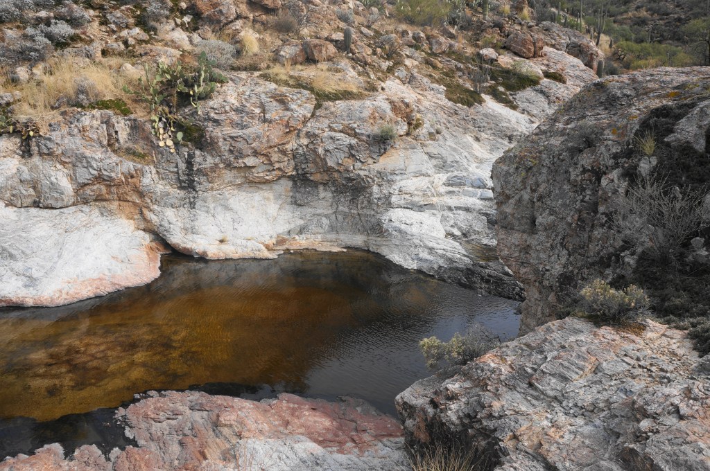 Follow the trail as it approaches a grey- and red-hued wash, where puddles of water may be present. Cross the drainage and climb steeply up the other side as the trail narrows further. From here the undulating path passes high above some pretty pools, sometimes connected by thin streams of water. In the heat of summer, many of these pools will dry completely—but after recent rains they are filled with water and play host to desert frogs, turtles, and other species.