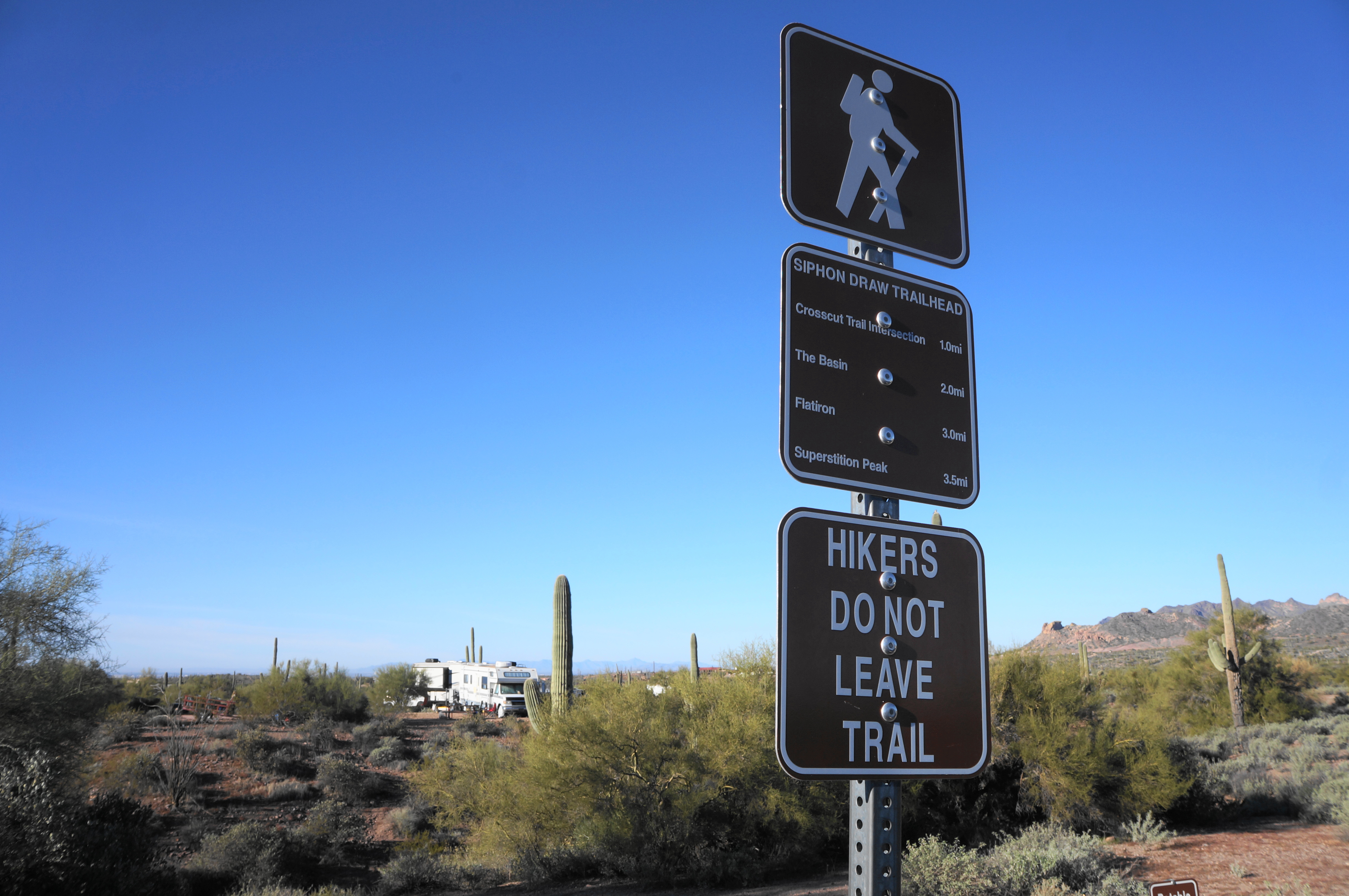 To reach Siphon Draw, first drive into Lost Dutchman State Park, bear left at the first intersection past the entrance station, and follow the road to its end, where there is a moderately-sized parking lot at the Siphon Draw Trailhead. (Note: If this lot is full, park at the Saguaro Day Use Area, about 1/10 mile back toward the entrance.) Look for the modest sign on the south side of the lot for the start of the trail.