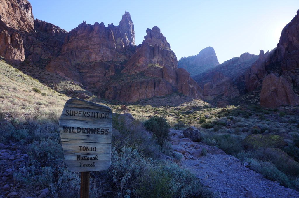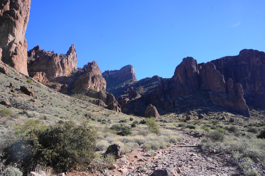 The Siphon Draw Trail quickly passes a sign for the Superstition Wilderness (although hikers have not technically entered it yet) and then rises to a pair of junctions at around 8/10 mile. Stay right at the first and straight at the second, then begin a long, gravelly climb toward Siphon Draw. By now, the saguaros have largely given way to stubbly brush and grasses, and hikers can clearly make out the contours of Flatiron, the imposing, striated peak ahead.