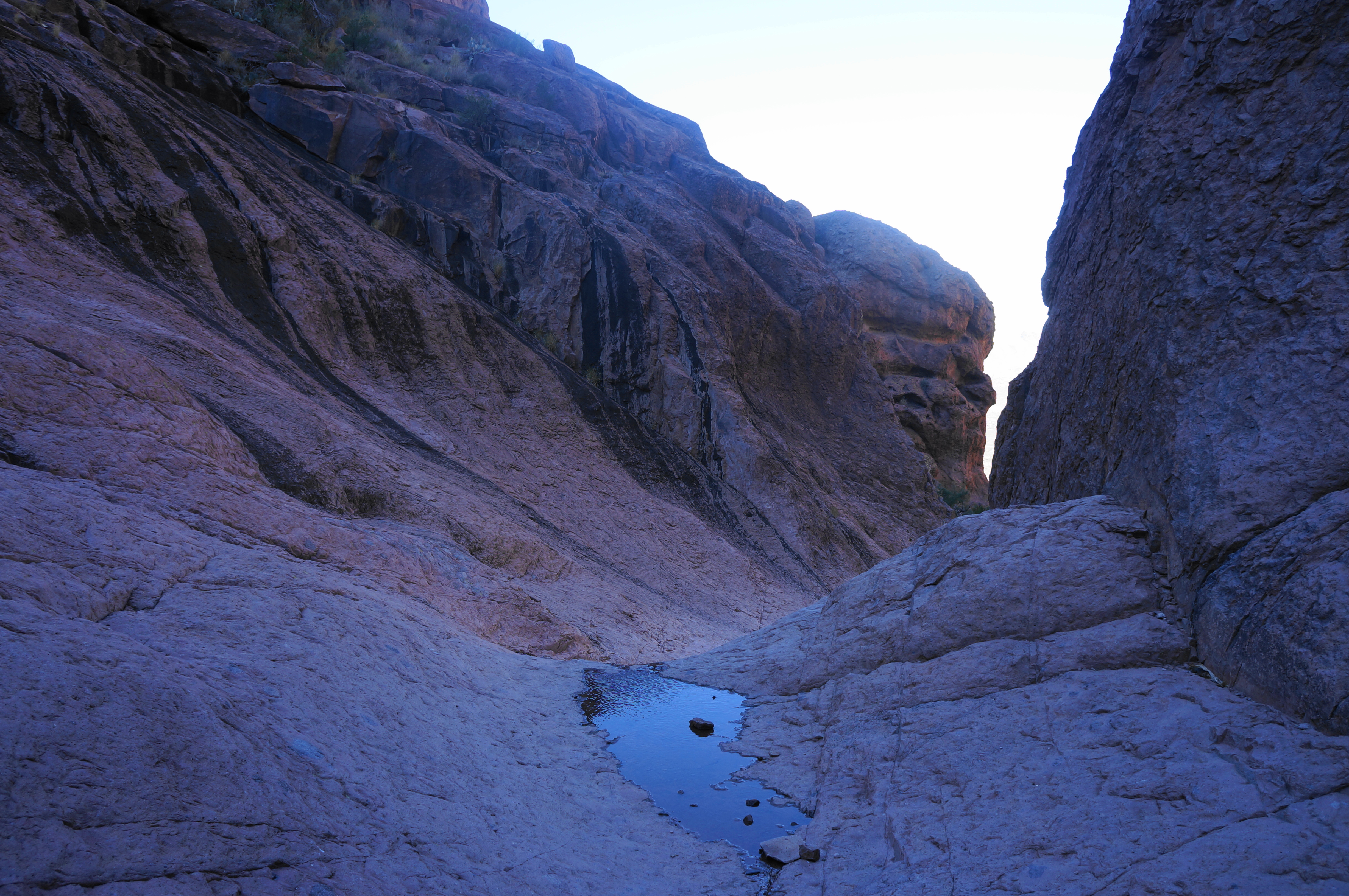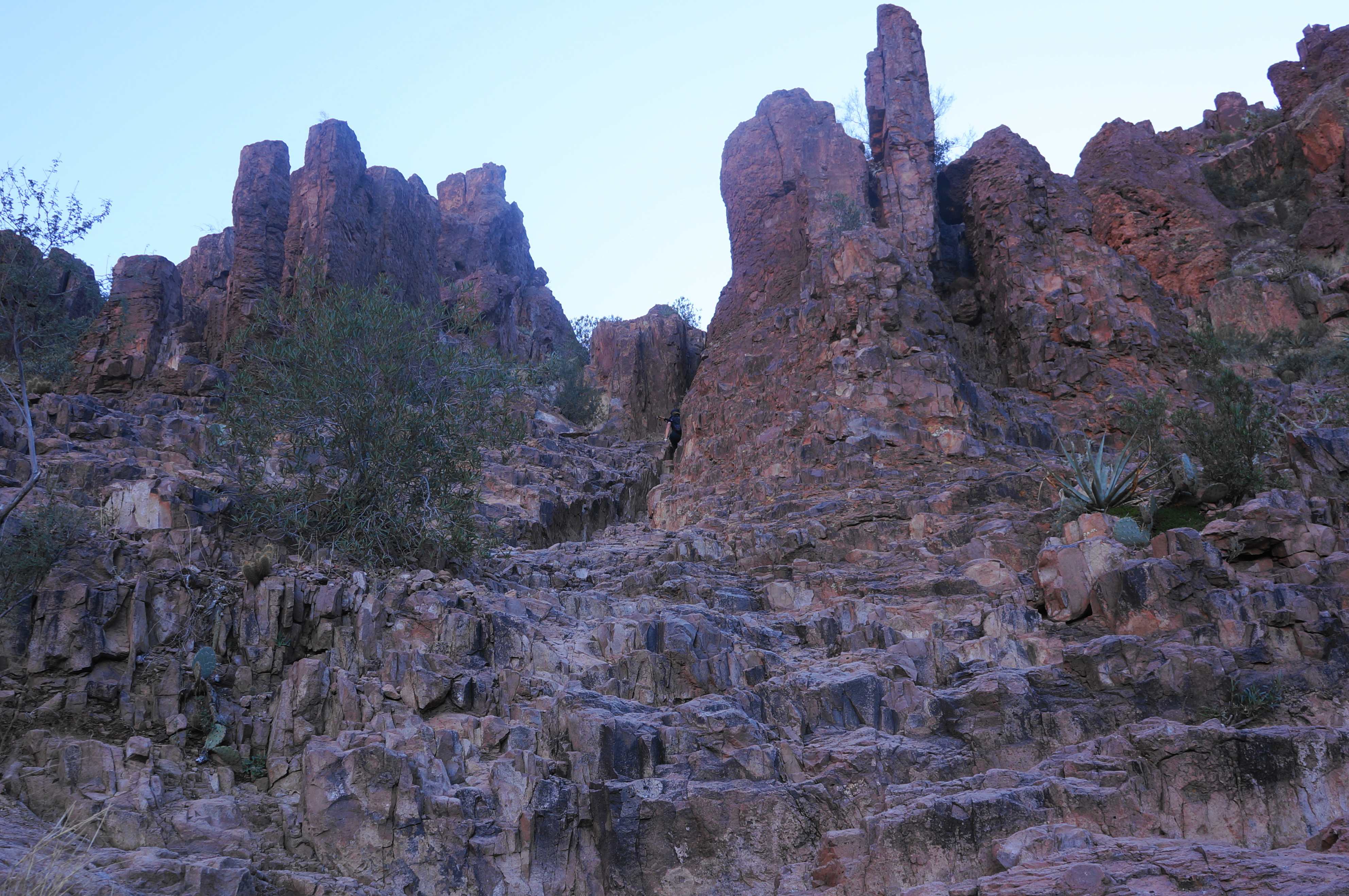 The trail itself dissolves, giving way to a series of social paths. But don’t overthink it: the best option for the next 2/3 mile is to follow the drainage straight up the gut; many hikers make the mistake of following paths leading up the right side of the drainage—only to find themselves ledged out and having to backtrack. Heading upstream requires patience and careful footing, with the sandy drainage quickly turning to a seemingly endless rock scramble: up, over, and around chunk boulders and between thick brush. At one point about halfway up this section, there is temptation again to take one of the social trails leading right. Resist this temptation, instead cutting back and staying in the main drainage. For more than a half mile, it is a slow and methodical climb, with ever-widening views looking back toward the Phoenix suburbs.