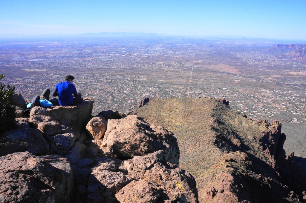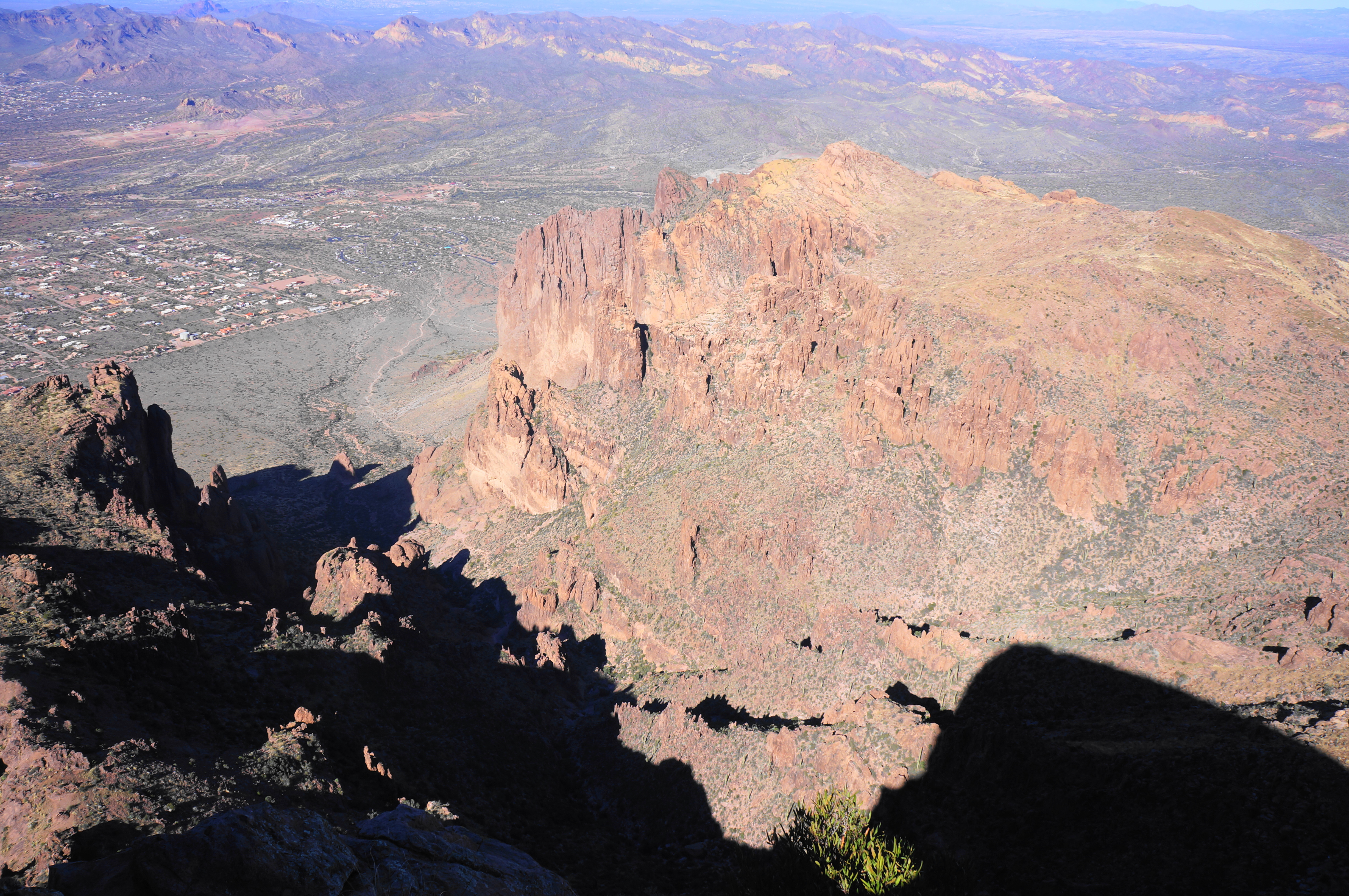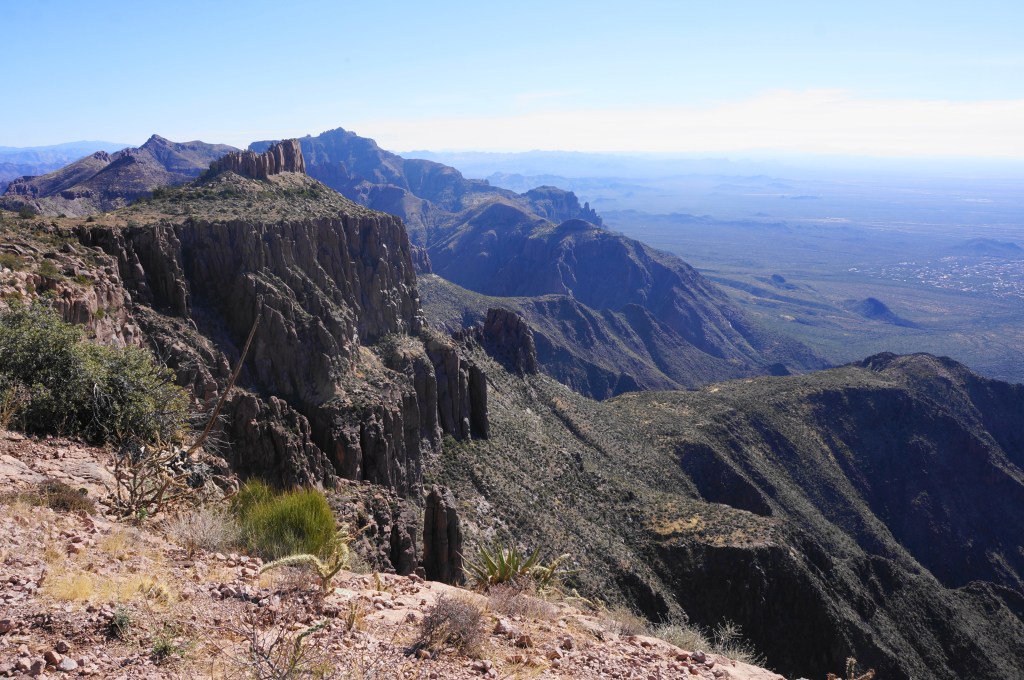 But the best views are arguably to the southwest. Here the Superstition Mountains unfold in their full glory, with steep, imposing cliffs dropping to a tiered desert escarpment. The high ranges extend southward toward Tucson, headlined by the imposing Santa Catalina Mountains. Backtracking from the summit, hikers can find a nice spot overlooking this area that is virtually free of crowds; a sublime spot to stop for lunch and catch your breath after the brutal, 2,500-foot climb.