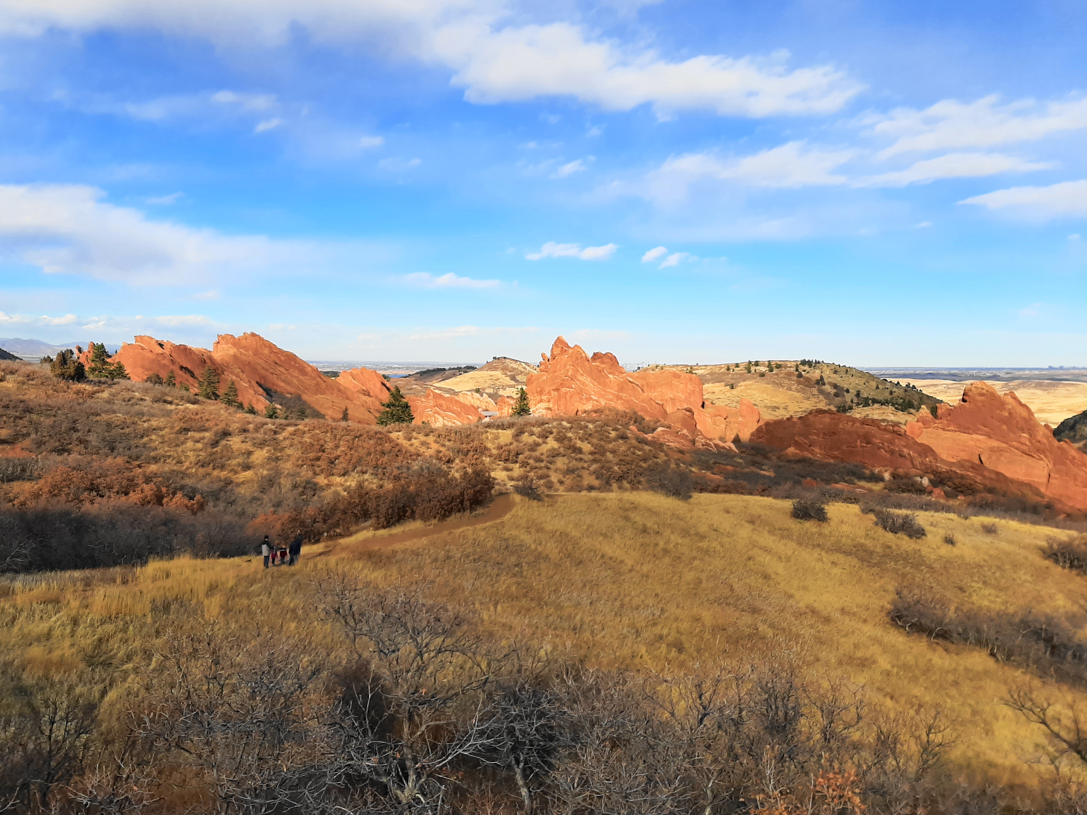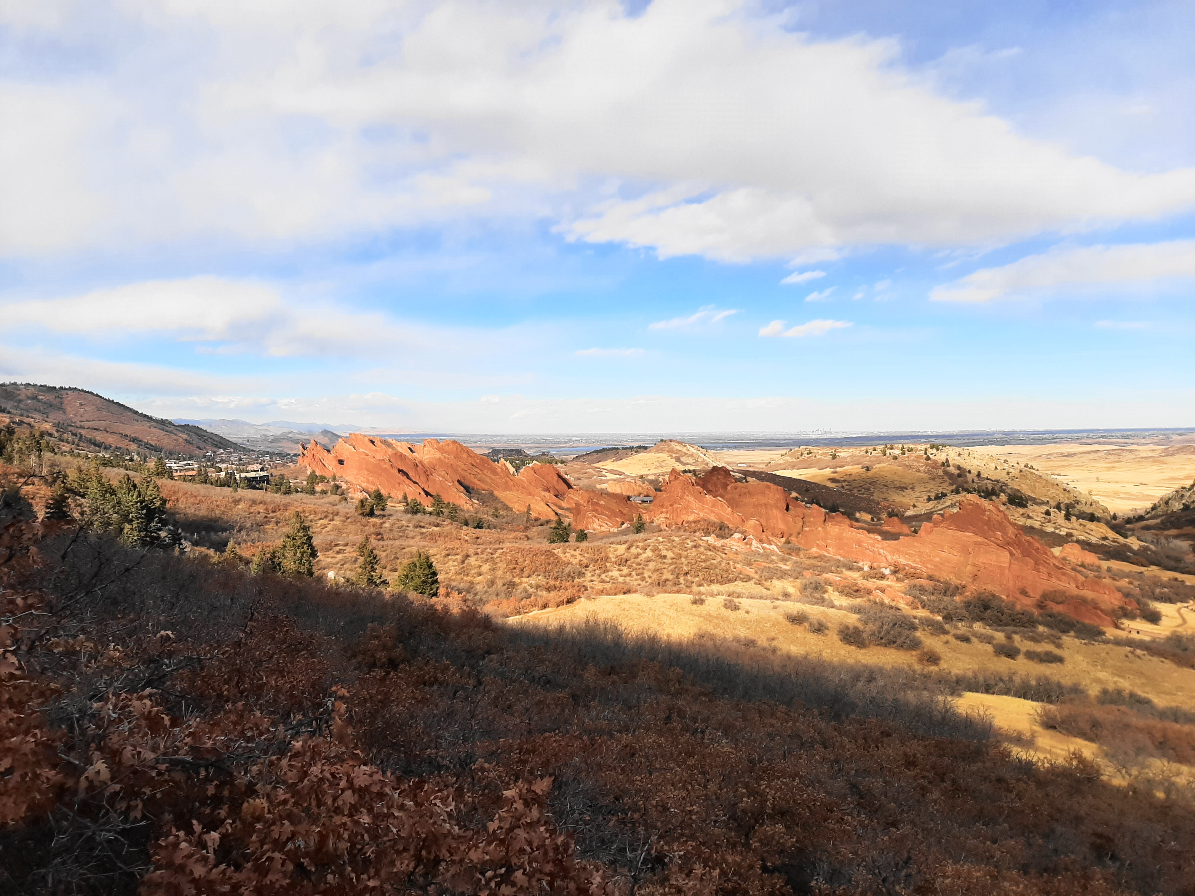 The primary attraction of Roxborough State Park—situated at the edge of the Front Range to the southwest of Denver, Colorado—is a stunning collection of red-hued sandstone outcrops, rising from the earth at a roughly 60 degree angle and stretching for more than two miles north to south. Here the slanted fins and monoliths serve as one of the area’s best examples of the Fountain Formation (see also nearby Red Rocks Park), a sedimentary layer deposited more than 300 million years ago, punctuating the otherwise gray, brown, and yellow foothills of the Colorado Rockies. While visitors can get an up-close view of the tilted sandstone from the park’s Fountain Valley or South Rim Trails, perhaps the most rewarding view comes from the summit of Carpenter Peak (7,160 feet). From here the entire range of the stony fins can be admired from 1,000 feet above the valley, in addition to expansive views of the Front Range and the Denver metropolis. The hike to Carpenter Peak is a moderately challenging half-day hike and, barring recent ice and snowfall, is usually accessible year-round.