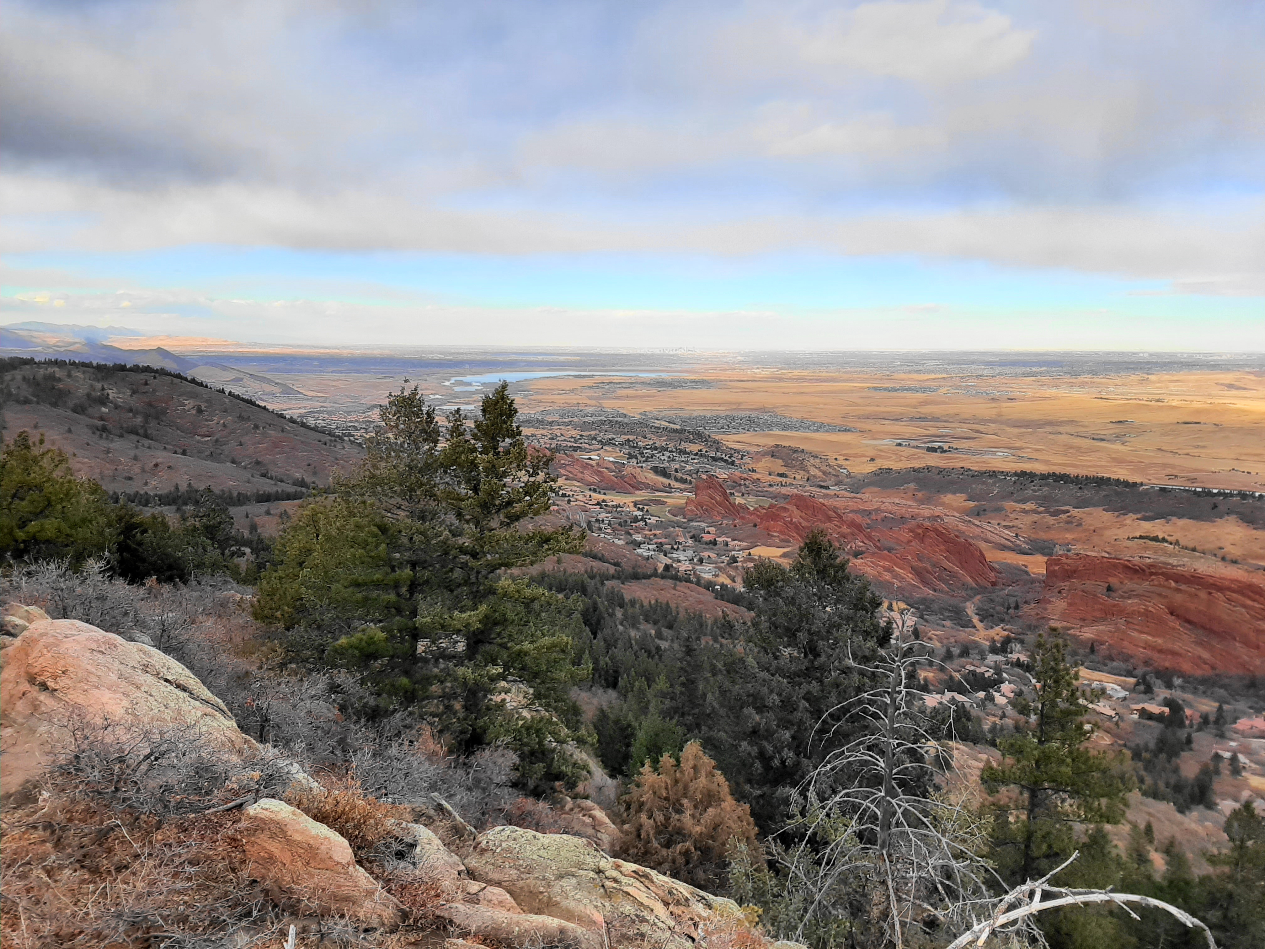 From the vista point, the Carpenter Peak Trail continues on a largely southward trajectory but does so through a series of bends and switchbacks that bring hikers higher and higher. At 1.25 miles, hikers skirt a pine-studded ravine and pass a bench on the left, after which the trail rises through an open section with the most expansive views yet. Beyond the Hogback, one can spot the skyscrapers of downtown Denver in the distance, as well as the blue waters of Chatfield Reservoir.