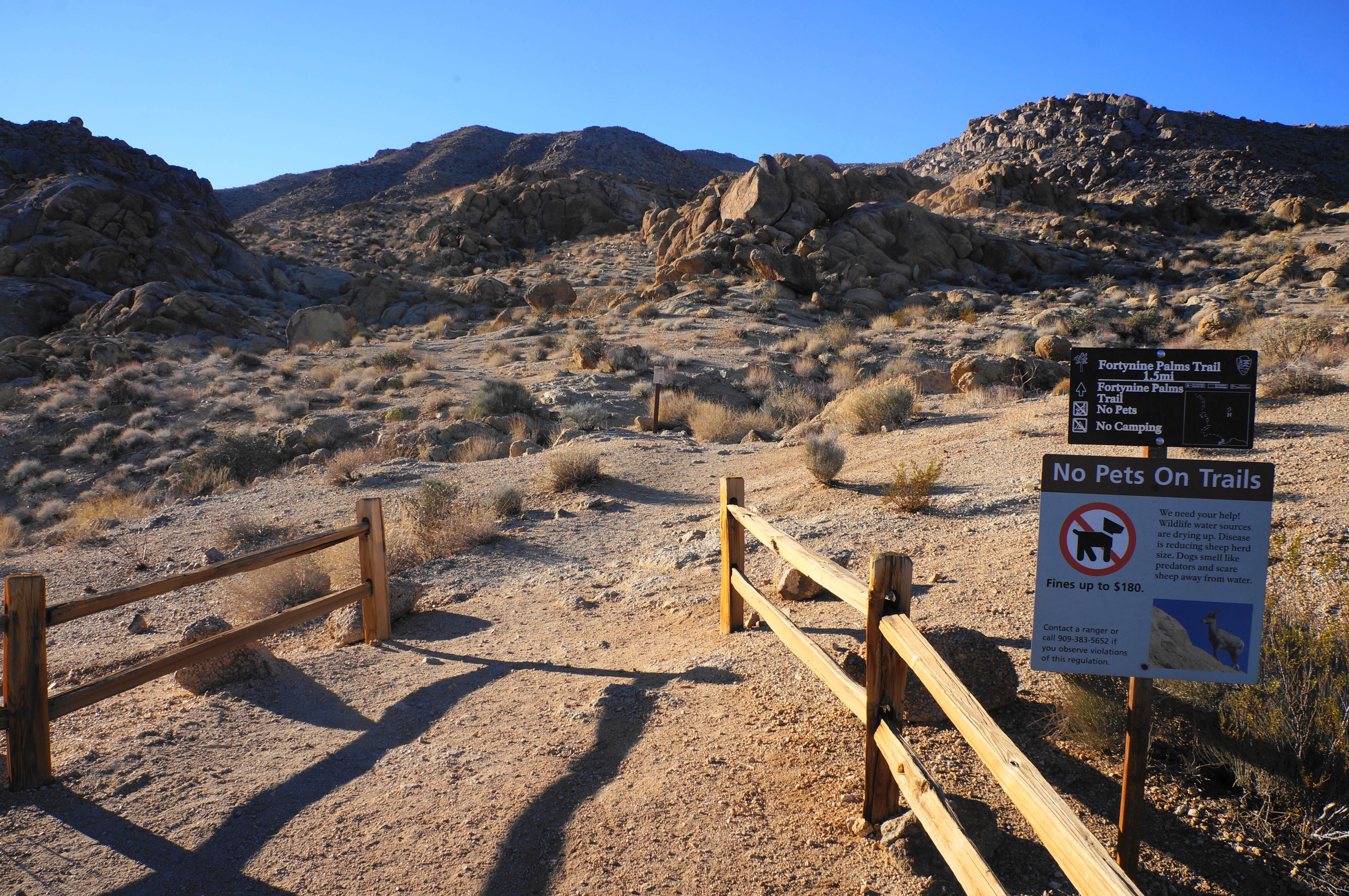 The trail begins at the end of Fortynine Palms Canyon Road, a paved track leading just across the northern boundary of Joshua Tree National Park. Arrive early to beat the heat and get a spot in the rather small parking lot.