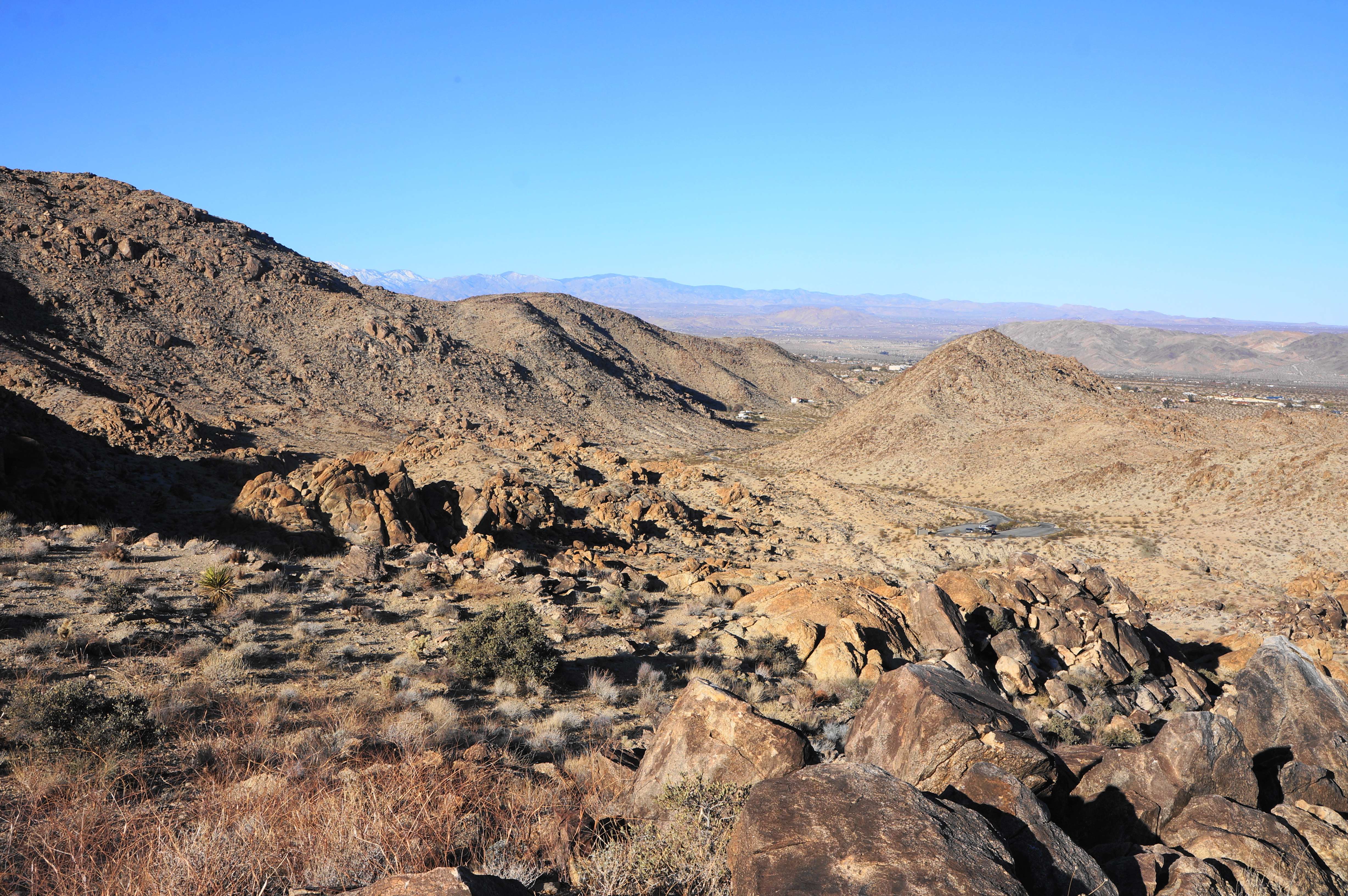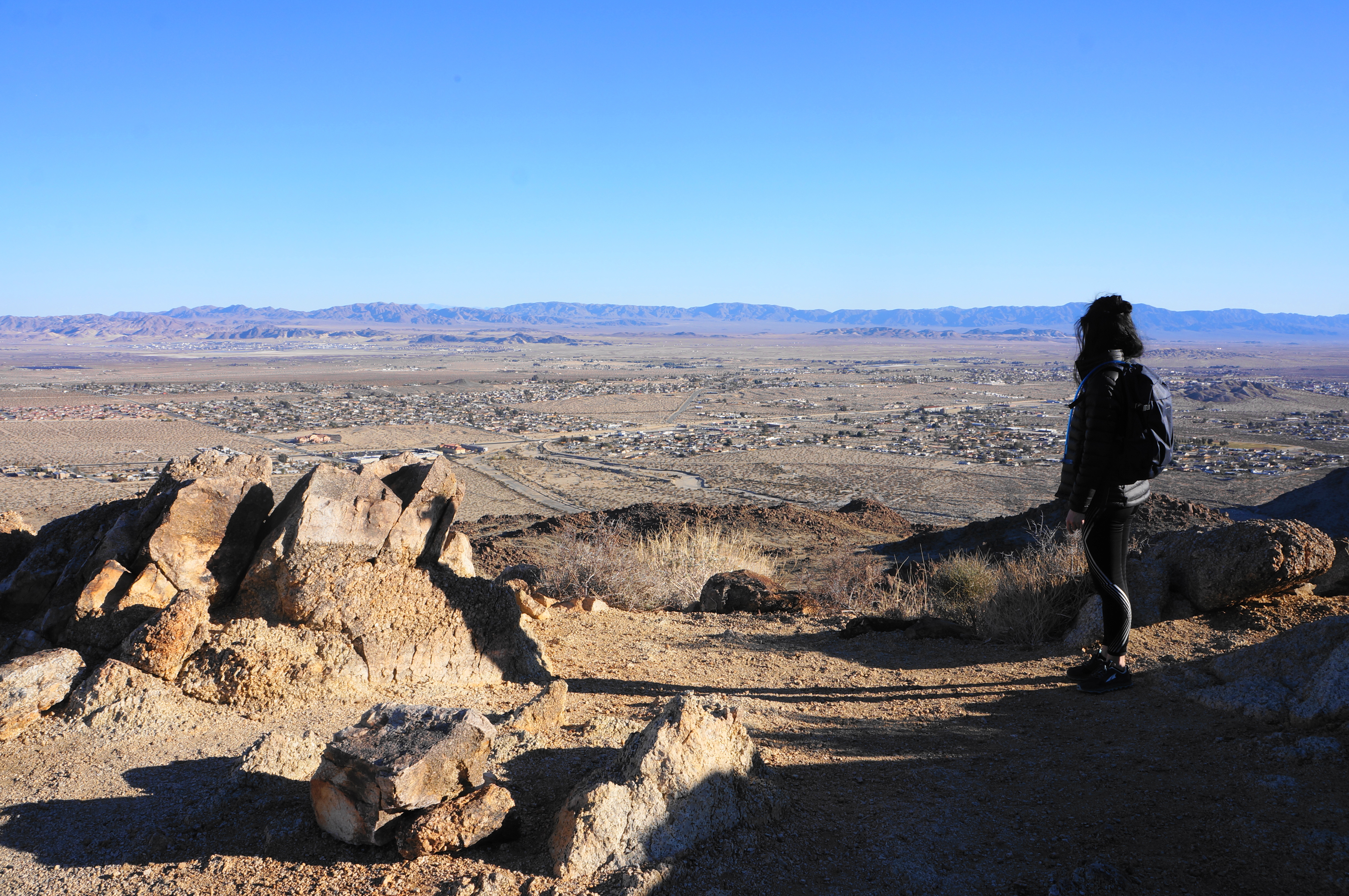 There is one—and only one—hiking path taking off from the trailhead, and it is well-marked and obvious for most of the journey. The trail begins down a dusty track, entering the boulder-strewn hills that guard the northern frontier of Joshua Tree National Park. Look for all kinds of cacti—prickly pear, cholla, red barrel, and others—as the trail laces gradually south and eastward, steadily climbing to points overlooking Yucca Valley and the town of Twentynine Palms.