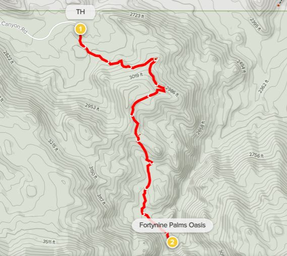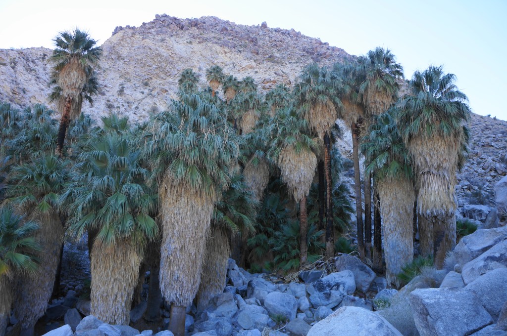 From here the narrow route resumes its descent for a quarter mile, culminating at the edge of Fortynine Palms Oasis, the highlight and destination of the hike. Here the impressive trees rise dozens of feet, shedding dead palms and developing a furry underbelly, with the very highest revealing a tall and wily trunk. The trail officially ends at a spot past the first batch of palms but short of the main stand: being a sensitive ecological area, further travel is prohibited.