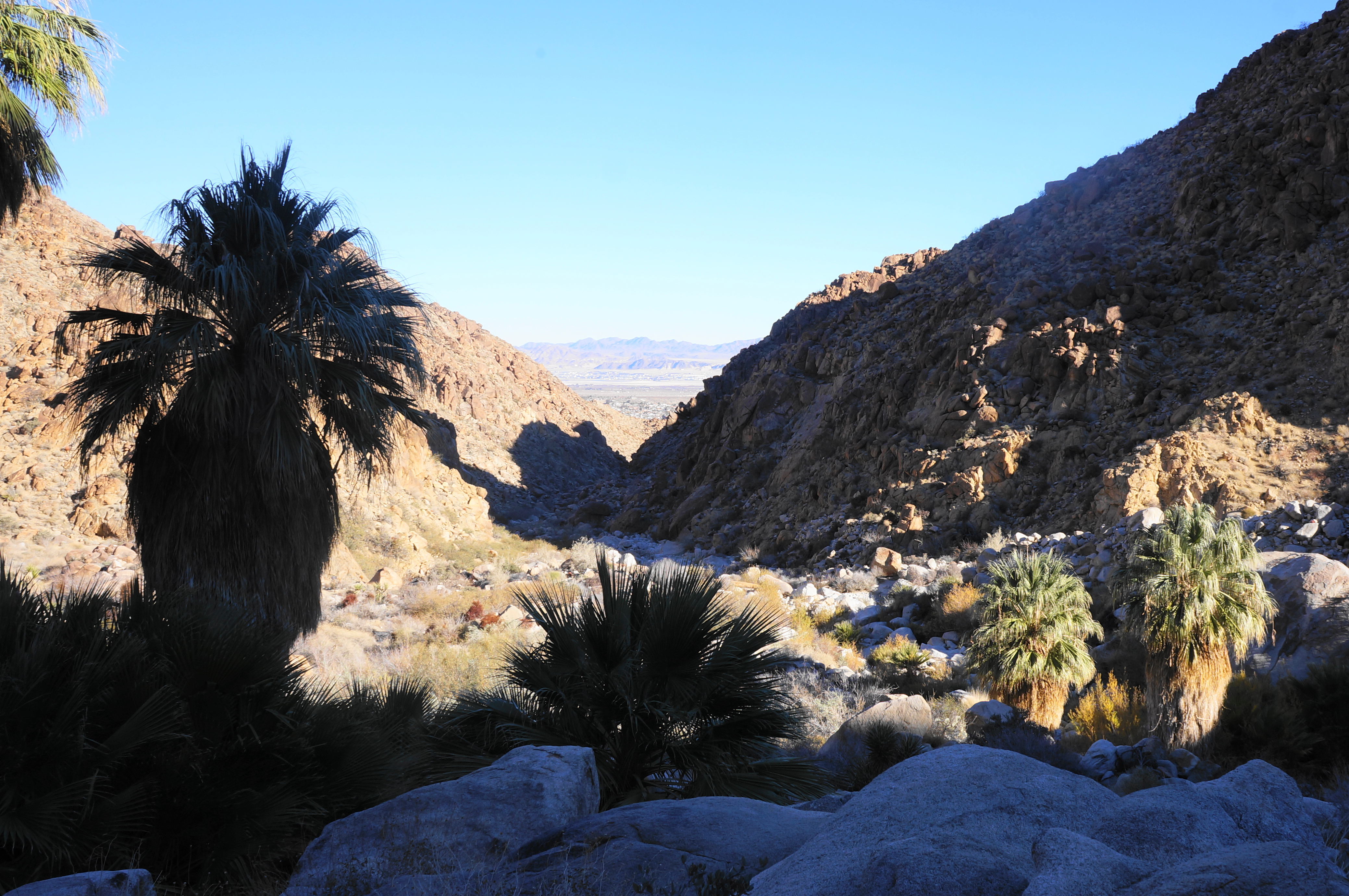 At 8/10 mile, the trail gives way to a steady downhill, with the path dropping to a low notch and then proceeding down to a side drainage. Follow the dry wash downstream for about 100 feet or so, then exit up to the right, rising to a point with the hike’s first views of the oasis ahead.