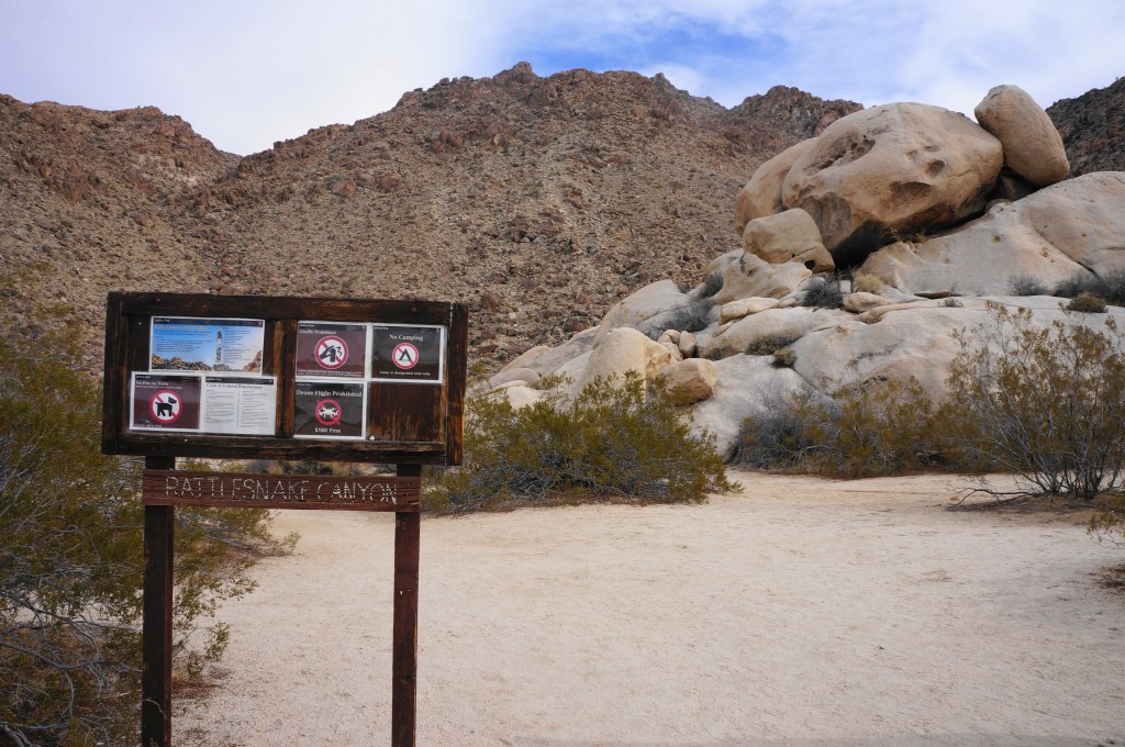 Rattlesnake Canyon is most often explored as an out-and-back hike beginning from the Rattlesnake Canyon Picnic Area, accessed by way of the Indian Cove Entrance in Joshua Tree National Park. After entering the park, follow Indian Cove Road toward the looming rocks, then stay left at three intersections in quick succession, following the road to its end (toward the picnic area, not the Indian Cove Campground). Here, amid the scrubby creosote bushes, the gravel road forms a loop; partway around the drive is a small parking area with a restroom and the trailhead sign.
