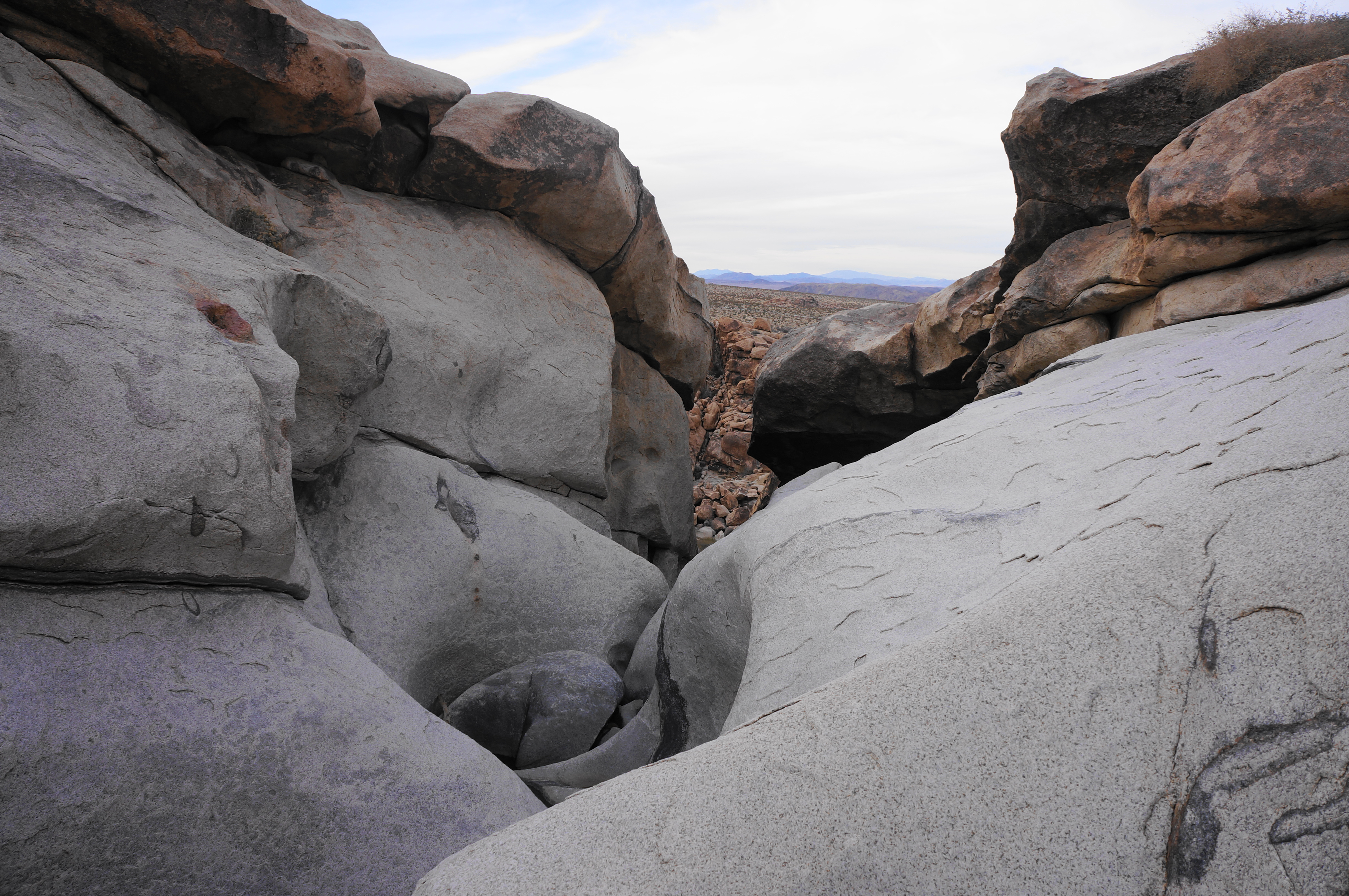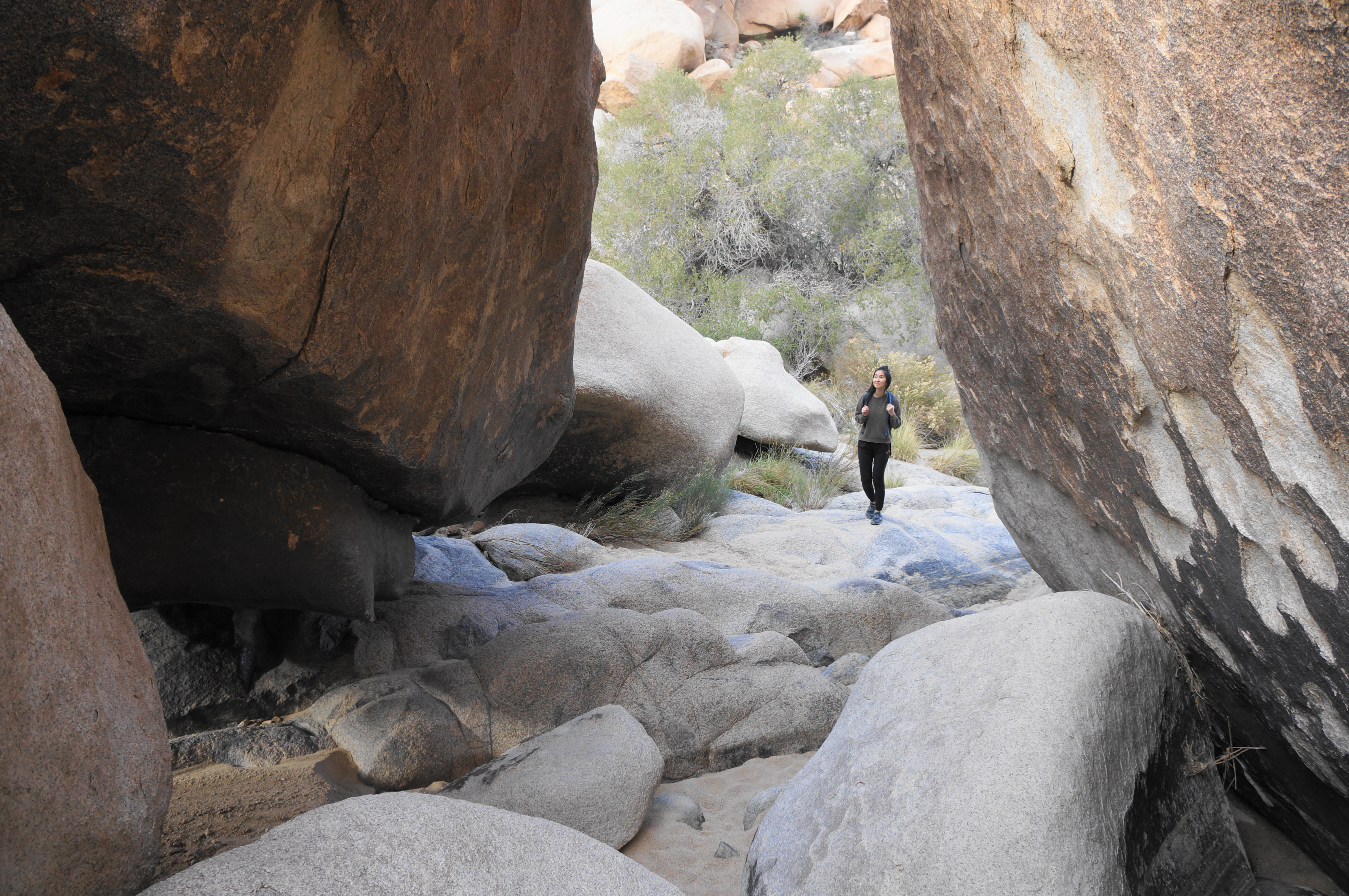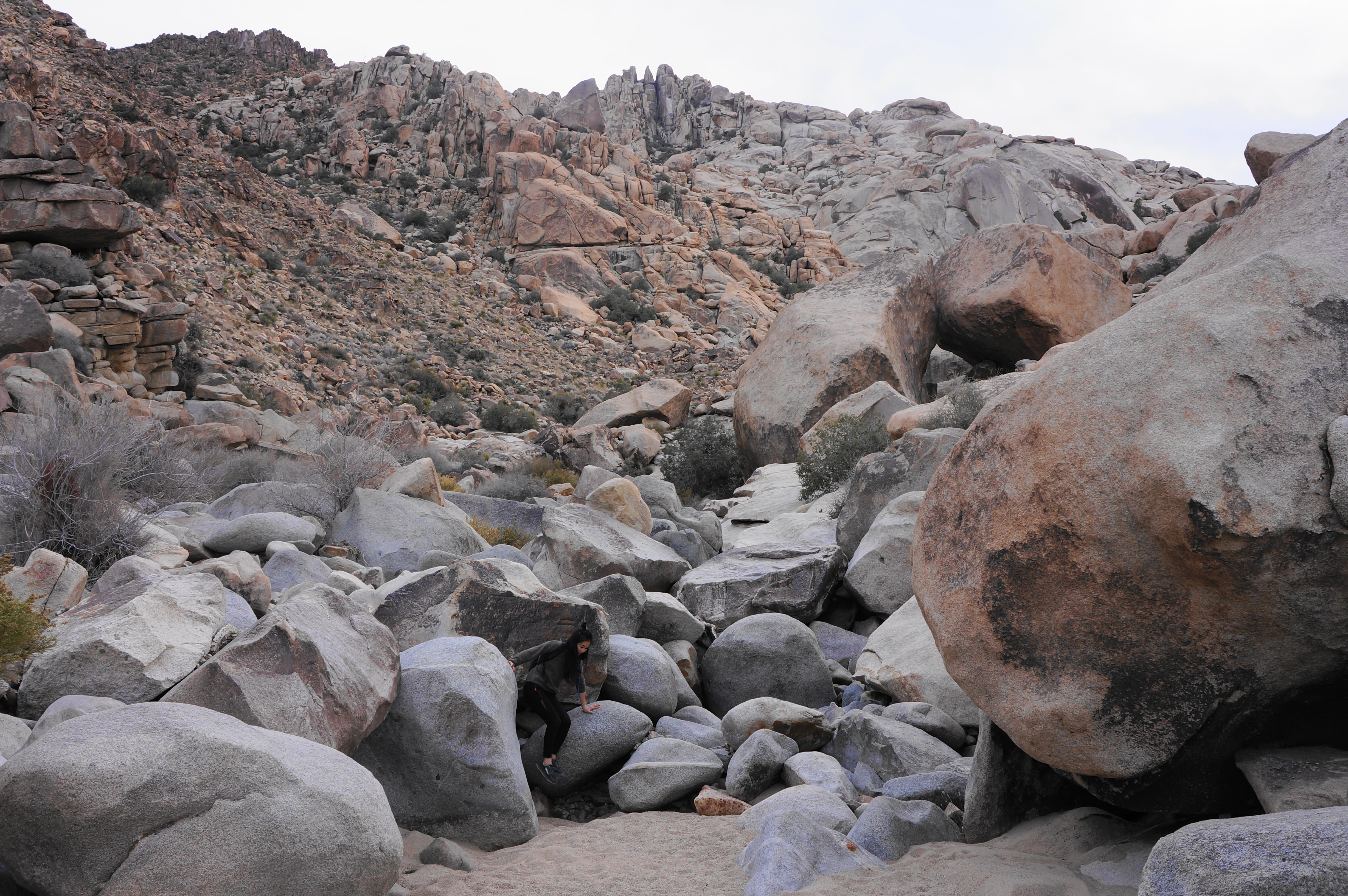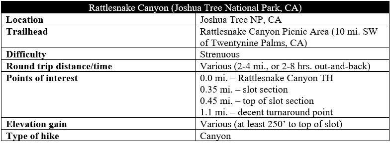 Rattlesnake Canyon in southern California’s Joshua Tree National Park is a rough-and-tumble, off-trail route that is well-known and advertised in Joshua Tree guidebooks—although perhaps it should not be. Despite its short length—the entirety of Rattlesnake Canyon upstream from the trailhead is less than two miles—the canyon floor is full of obstacles, route-finding challenges, and plenty of opportunities for first-time hikers to find themselves in trouble. Rescues—due to disorientation, heat, or broken bones—are relatively common, and the canyon is somewhat of a headache for local rangers, who warn of the dangers of the off-trail hike. As one local park official noted in 2016 after rescuing three hikers, “these people did not realize how strenuous Rattlesnake Canyon is…It is important to evaluate the hike you’re going to take…Find out a little bit about it before you just take off.” Notwithstanding these words of caution, Rattlesnake Canyon is a beautiful and rewarding destination for those with proper preparation and experience. Here the sandy wash gives way to a narrow and rugged gulch carved into the undulating monzogranite of an area called the Wonderland of Rocks. Fabulous grottos and slender slots can be found within a half-mile of the start, with additional wonders beyond as the canyon cuts deep into the boulder-strewn wilderness.
