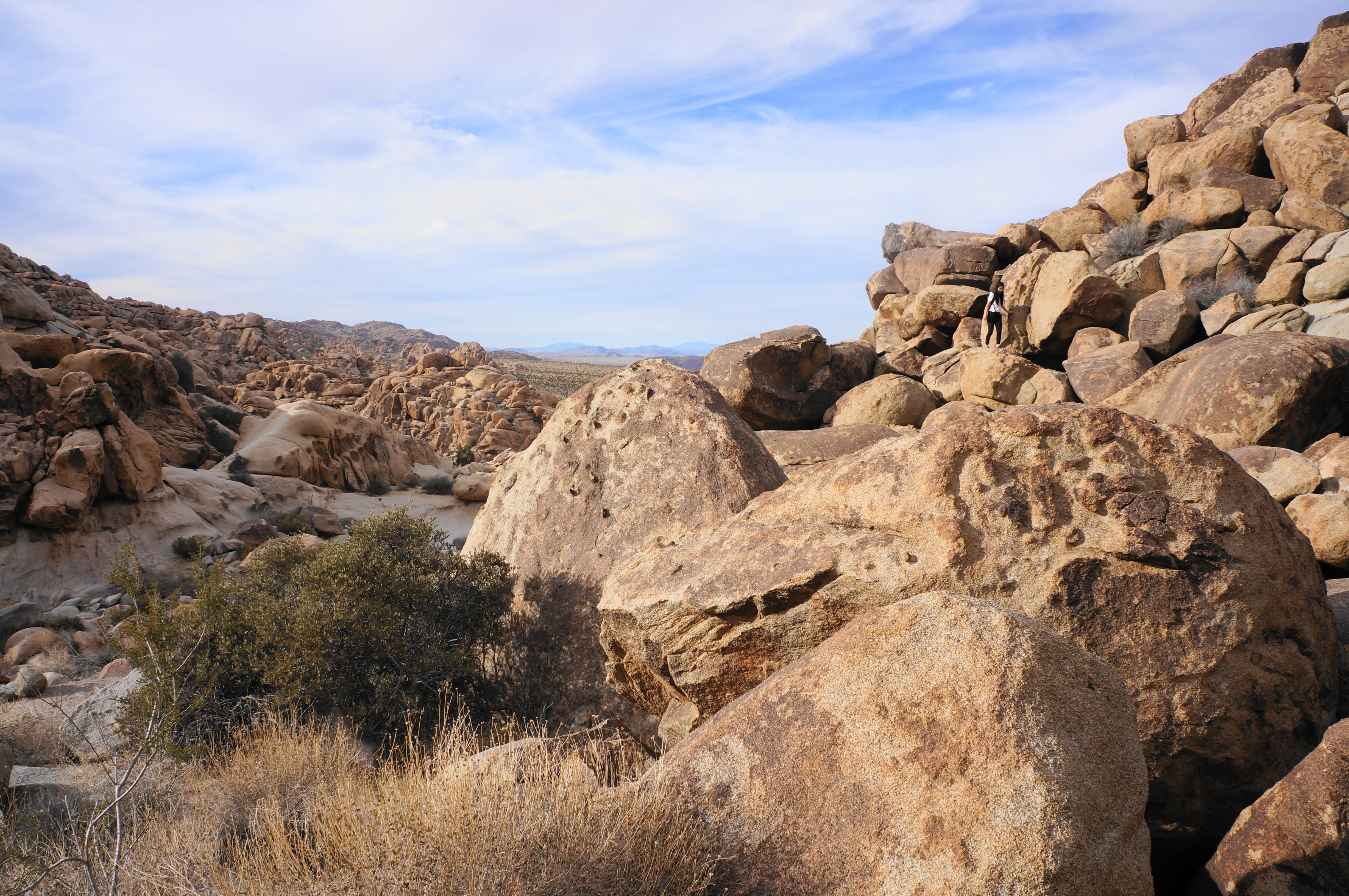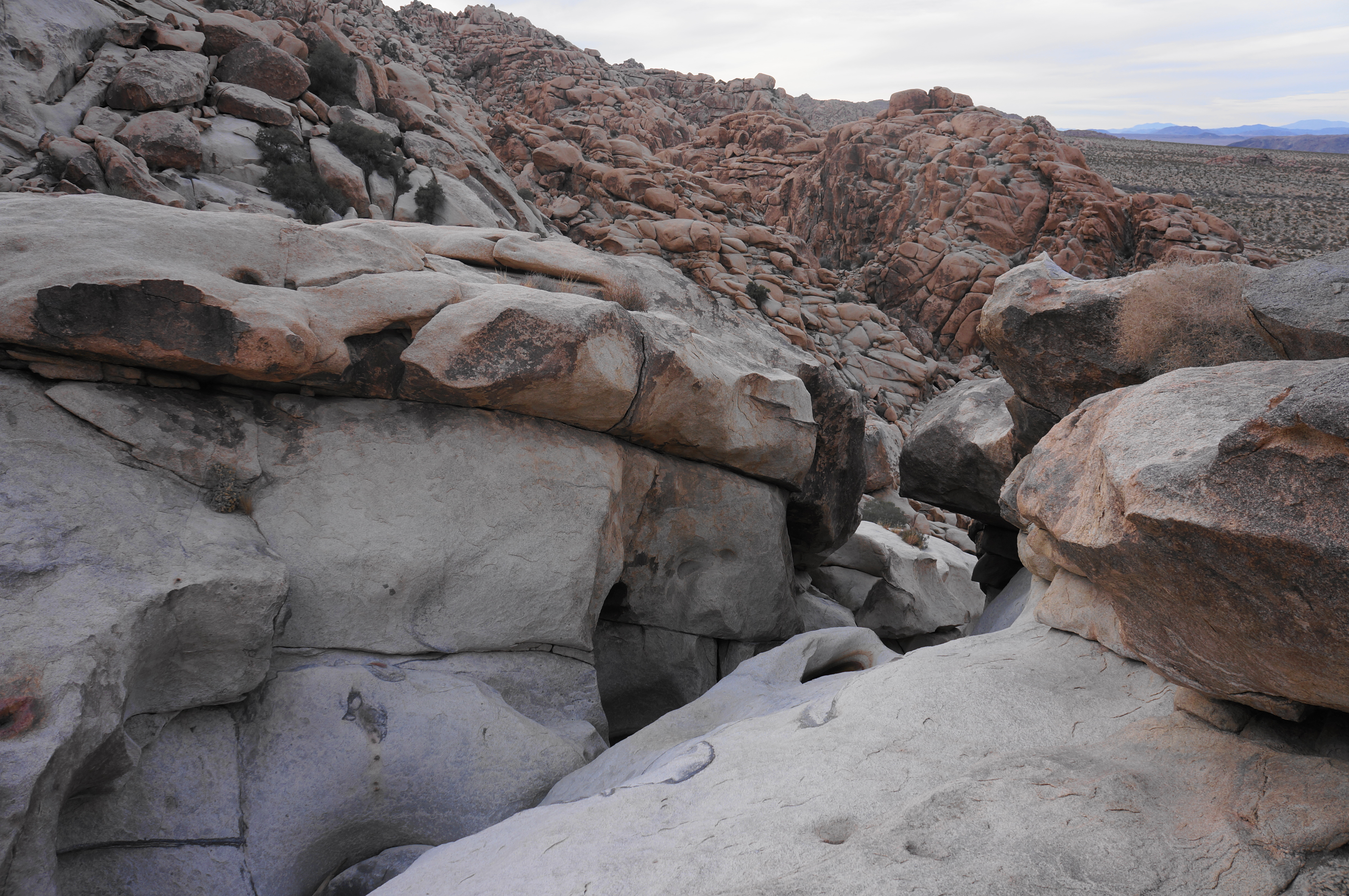 Some hikers may choose neither option. This is probably the best choice for those who are inexperienced with Class 2+ scrambling, and turning around at the grotto still makes for a nice, short day hike. But adventurous travelers can continue further, bypassing the slot and eventually returning to the wash bottom after about 1/10 mile—and 200 feet in elevation in elevation gain. From here hikers can look back at the landscape to the north, including Yucca Valley and a series of Mojave Desert ranges beyond.