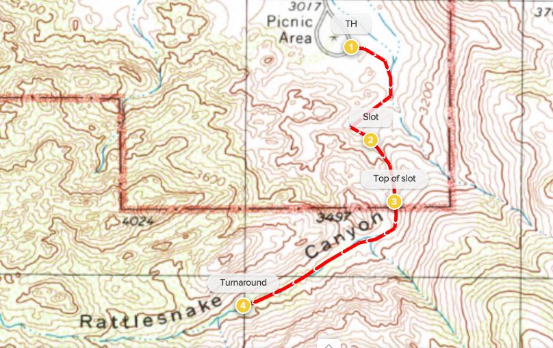 From the trailhead, hikers will notice immediately that there is no signed and official path. Working your way southeast amid the creosote bush, however, a series of social trails generally empty into a broader wash; this is the main drainage through Rattlesnake Canyon, although it narrows significantly beyond the broad start.