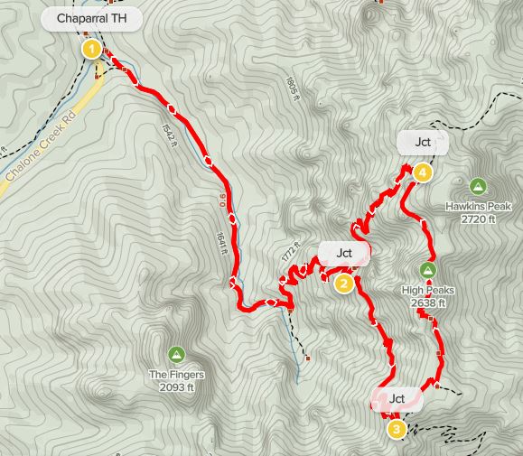 Map of Juniper Canyon Trail to High Peaks Loop, Pinnacles National Park; created using alltrails.com