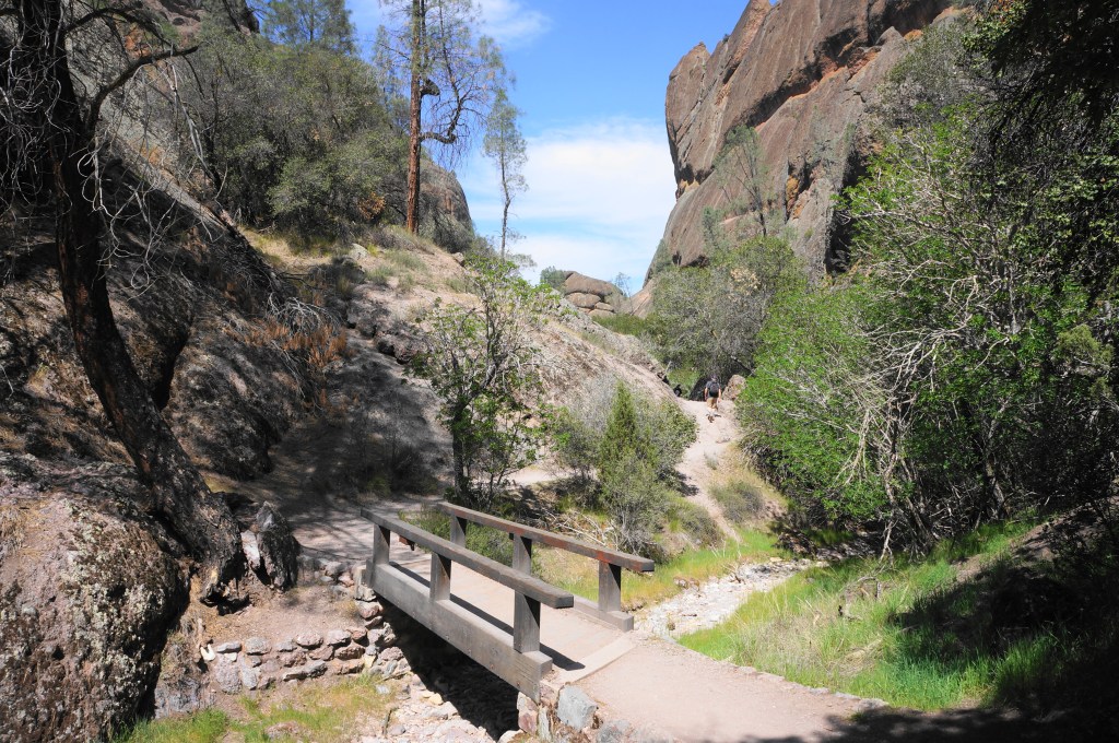 Follow the drainage as it gradually narrows and approaches the edge of the red-orange breccia outcrops—a gateway into the heart of Pinnacles. Pass a spur trail at 4/10 mile leading to the Elephant Rock climbing area, then follow the dirt path as it traverses three short bridges. With the canyon now strikingly slender, pass through a few lovely glens and bear left at the fork at 0.65 miles: this is the start of the Balconies Cliffs Trail.