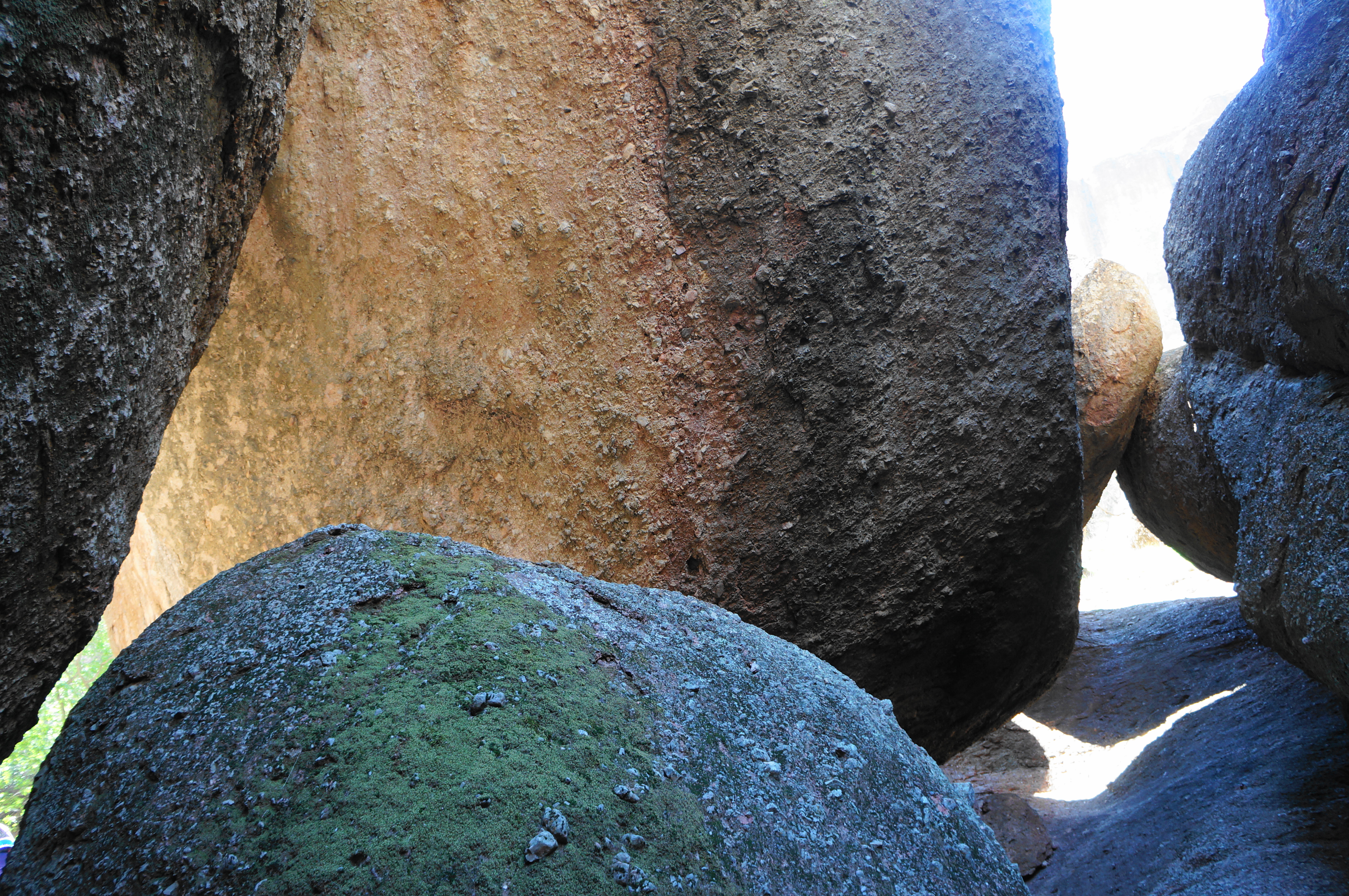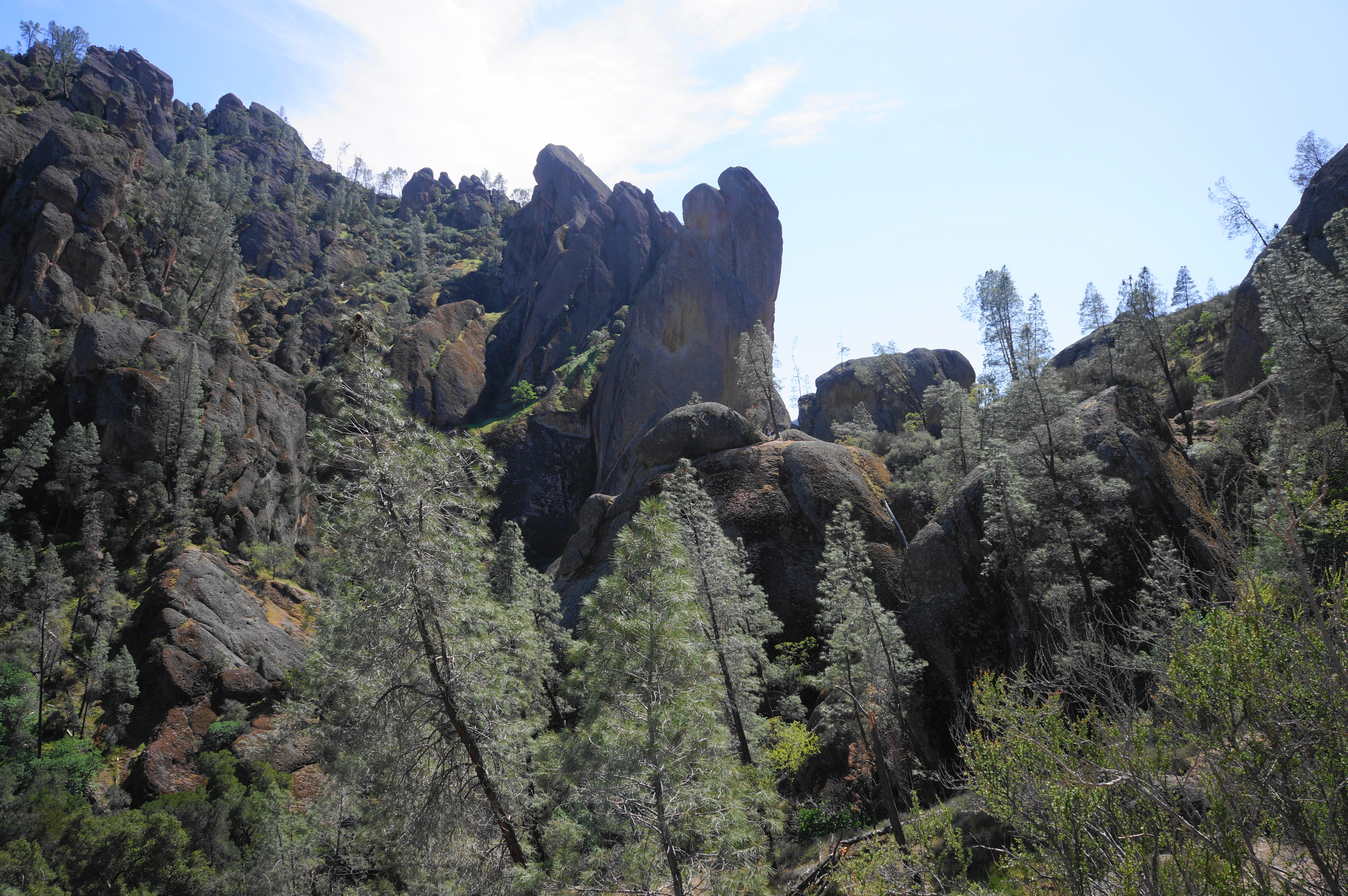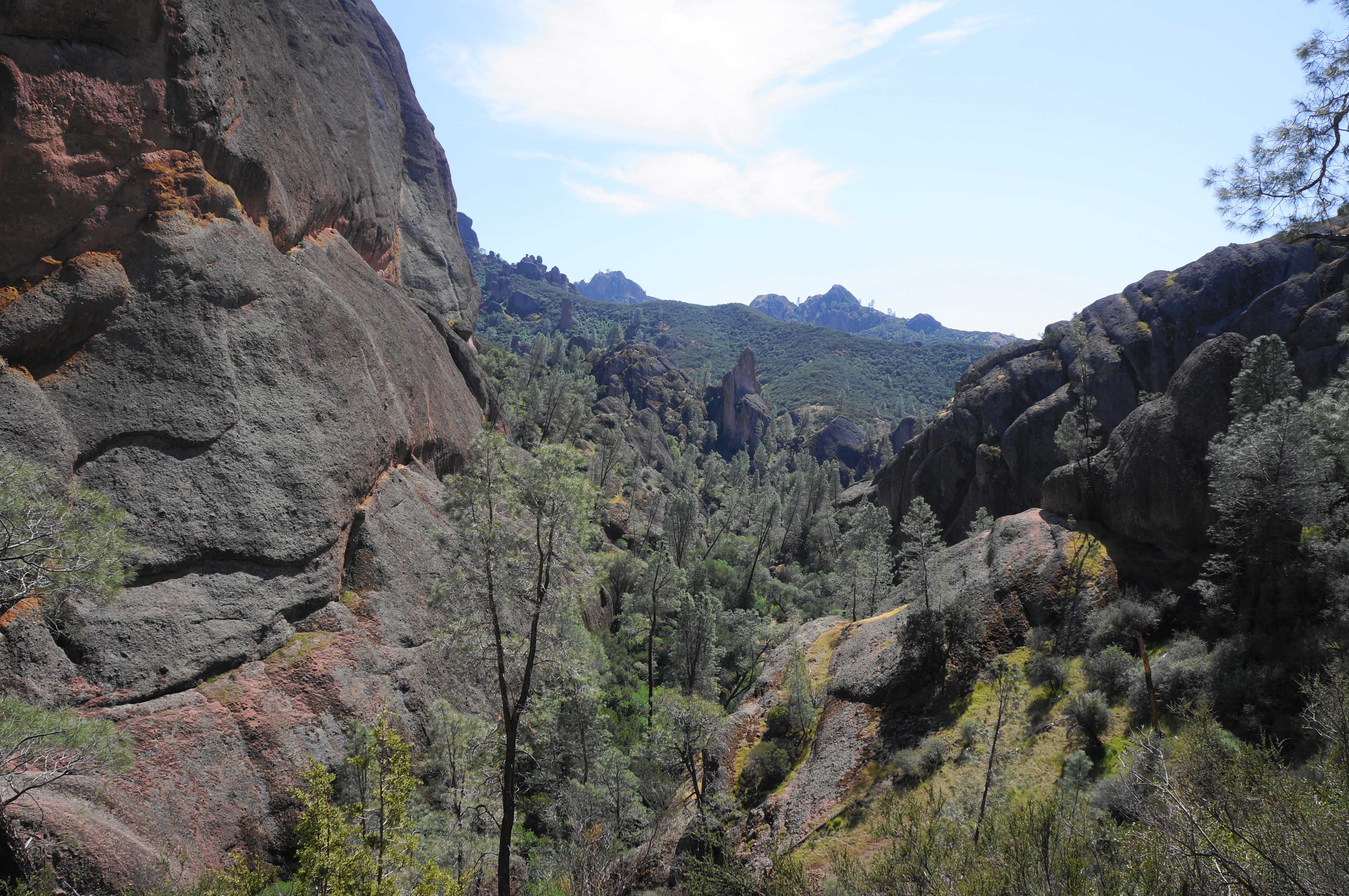 Saving the cave section for last, climb steadily up the cliffs trail, rising to a shelf overlooking the thin canyon, flanked by high walls laced with vertical and horizontal streaks. As the path approaches its high point, views unfold to the broader valley of the Chalone Creek drainage. Up to the left, hikers will see the iconic chimneys of the Balconies, a striking rock face with several climbing routes.