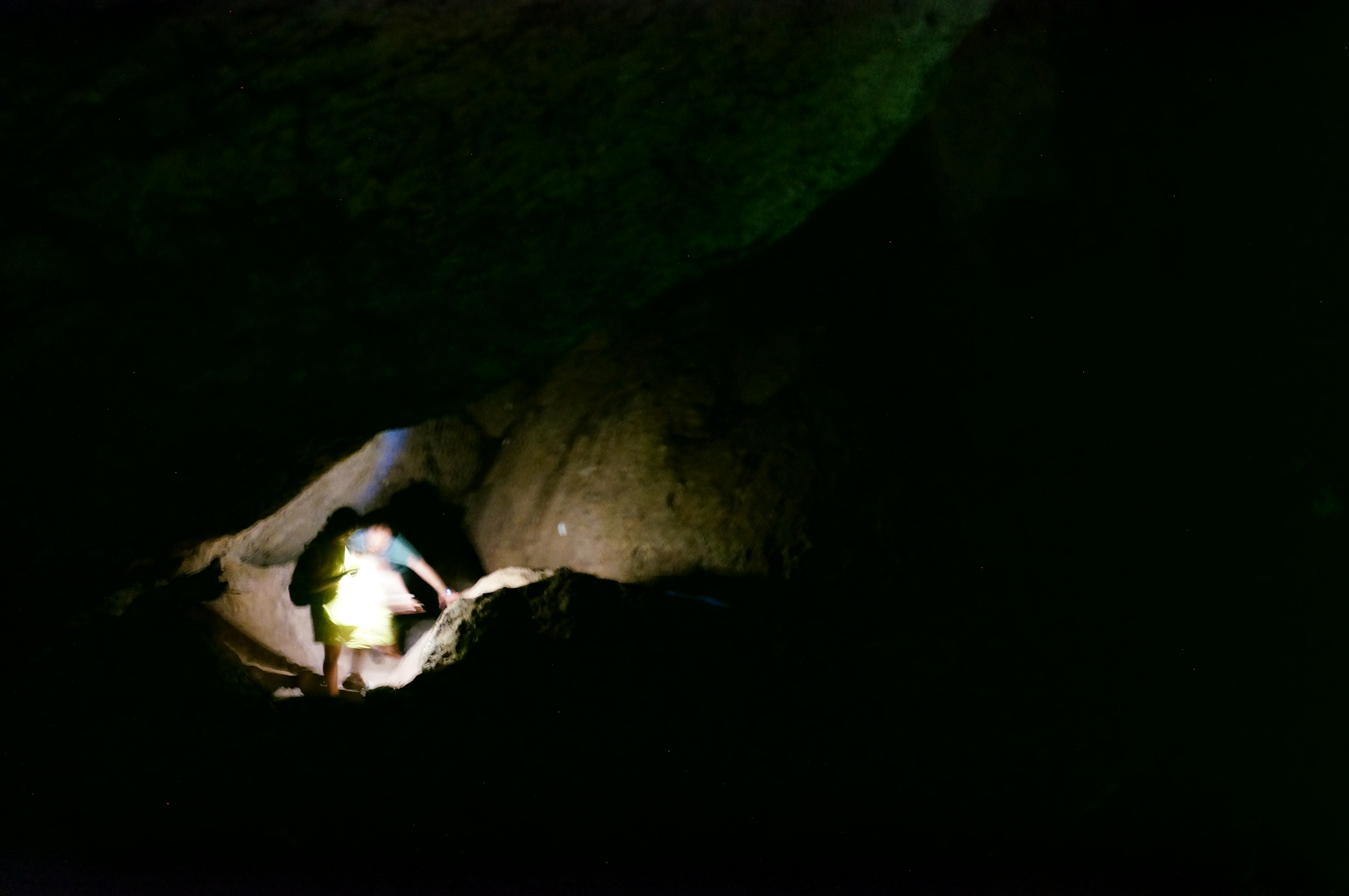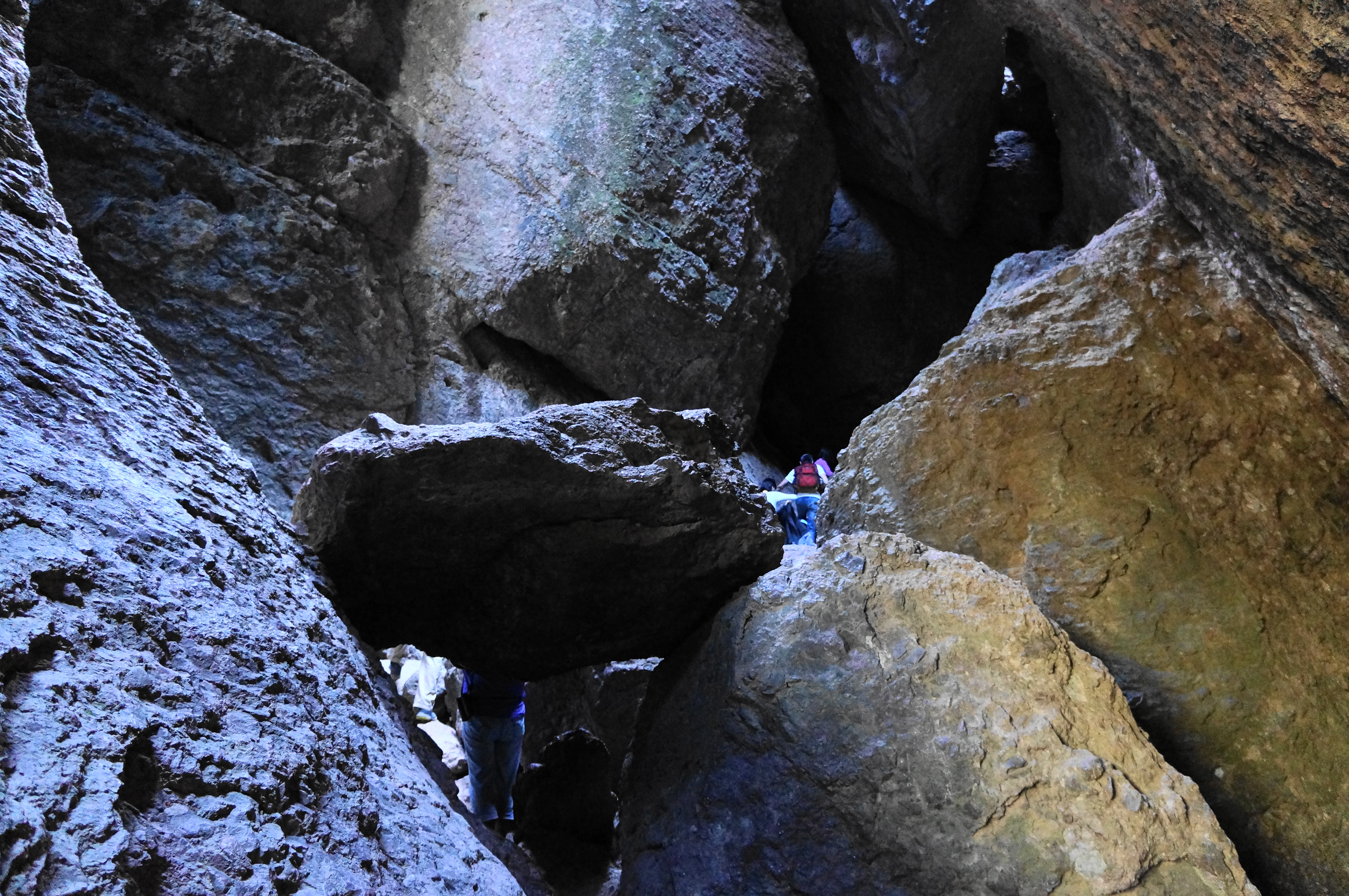 The first cave section culminates with a steep stairstep rise through a small break in the boulder-strewn ceiling, returning to the sunny open expanse. The respite is brief, however, as the onward trail returns within minutes to a second cave, this one much shorter but arguably more spectacular.