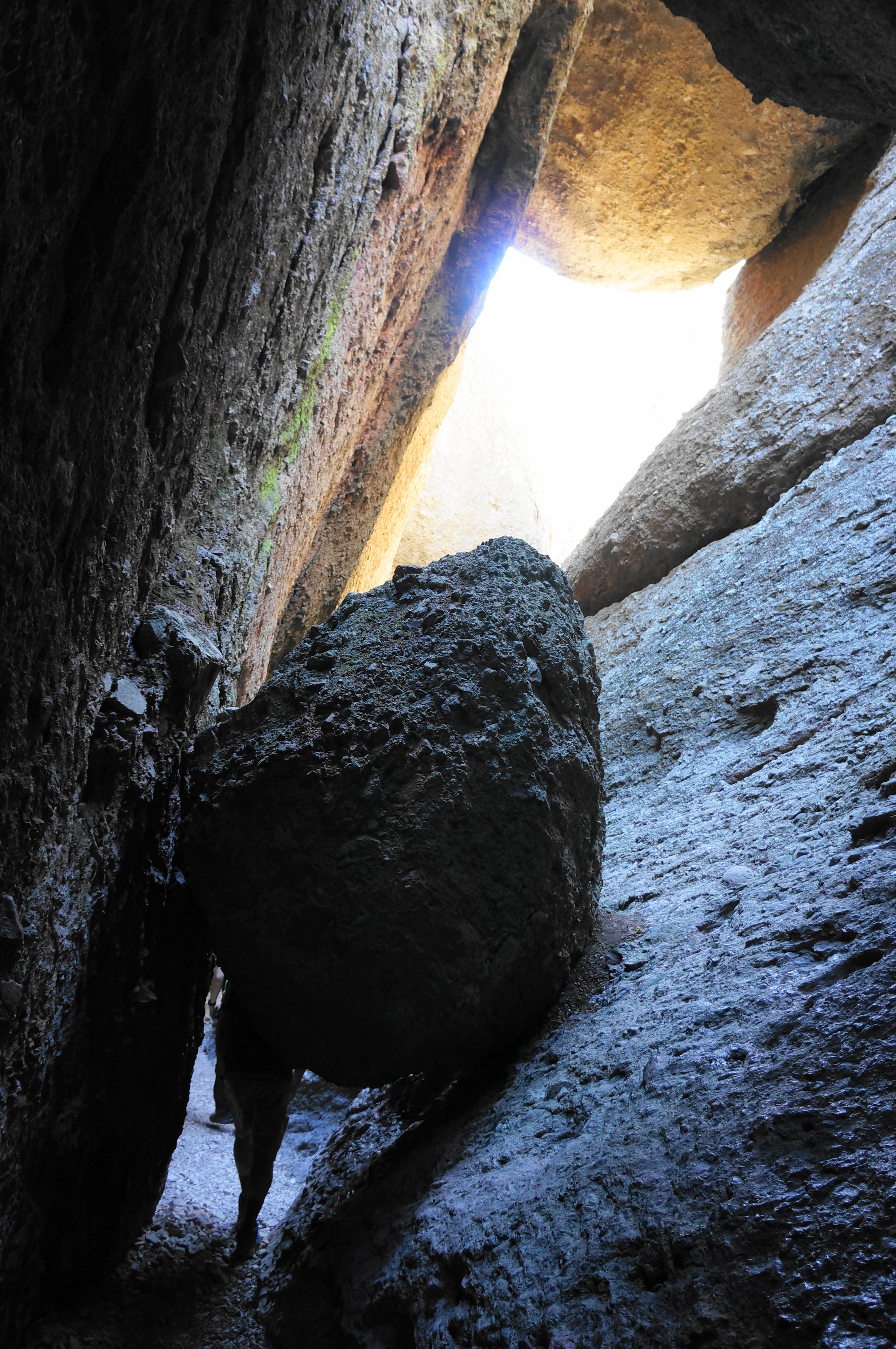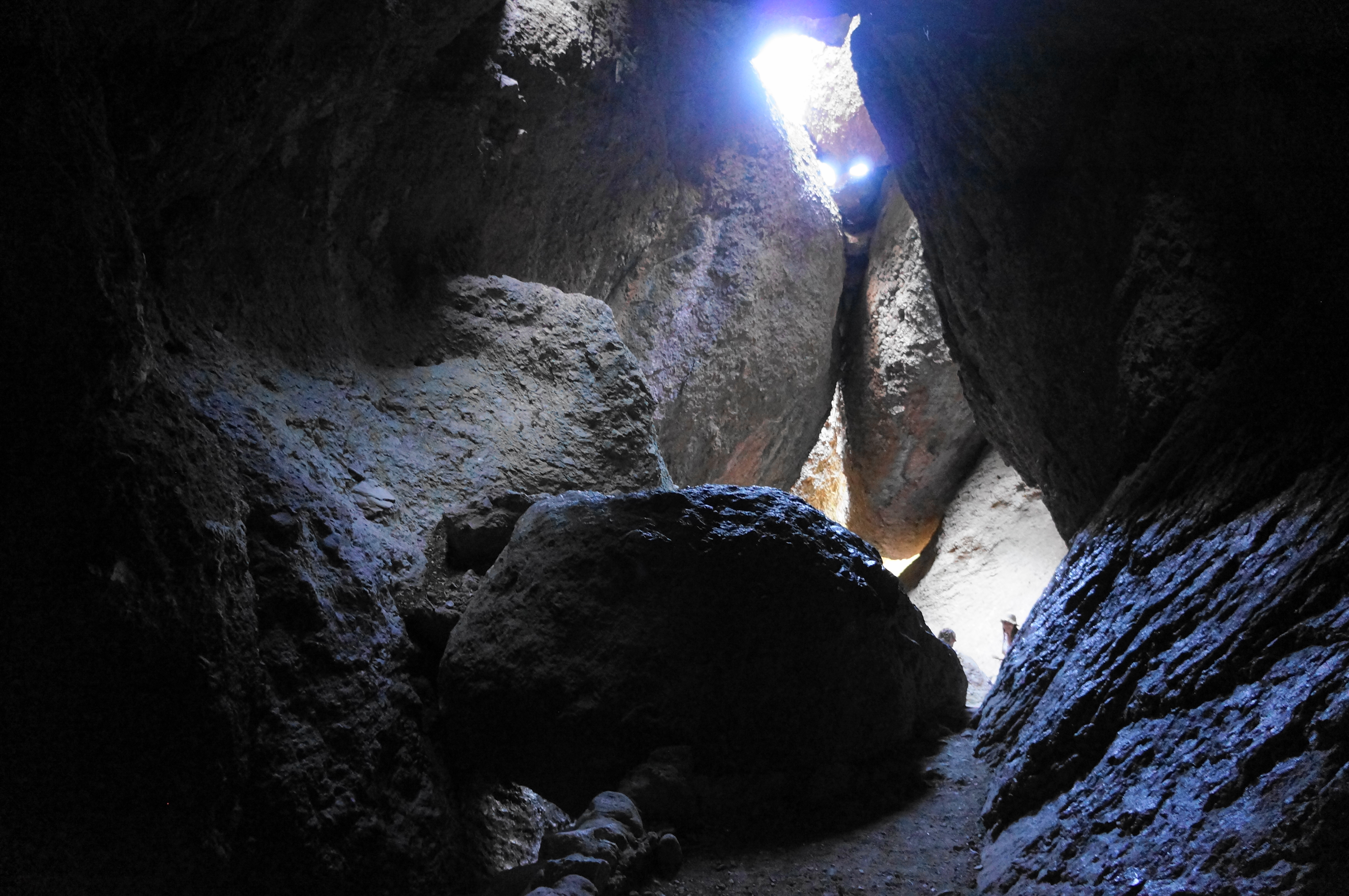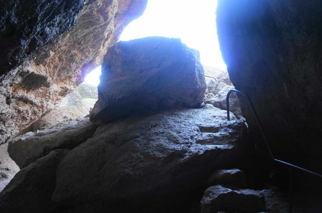 Talus caves—formed when crashing boulders fall into chasms, flooding the canyon with darkness—are an intriguing feature of central California’s Pinnacles National Park, which boasts two such pseudo-karst caverns. The most popular of the two is Bear Gulch Cave, most easily accessible from the east side of the park. (Note: See my post from 2020 on this exploring this cave.) The other—seemingly even darker and lesser-travelled—is Balconies Cave, situated a short walk from Chaparral Trailhead in the western half of the park. This cave—actually more of a boulder-filled gorge than a true cavern—can be explored as part of a 2.6-mile stem-and-loop hike that combines the cave route with the high-flying Balconies Cliffs Trail. (Note: Balconies Cave is sometimes closed after heavy rains or due to bat activity. Given the darkness of the cave, bring a headlamp/flashlight!)