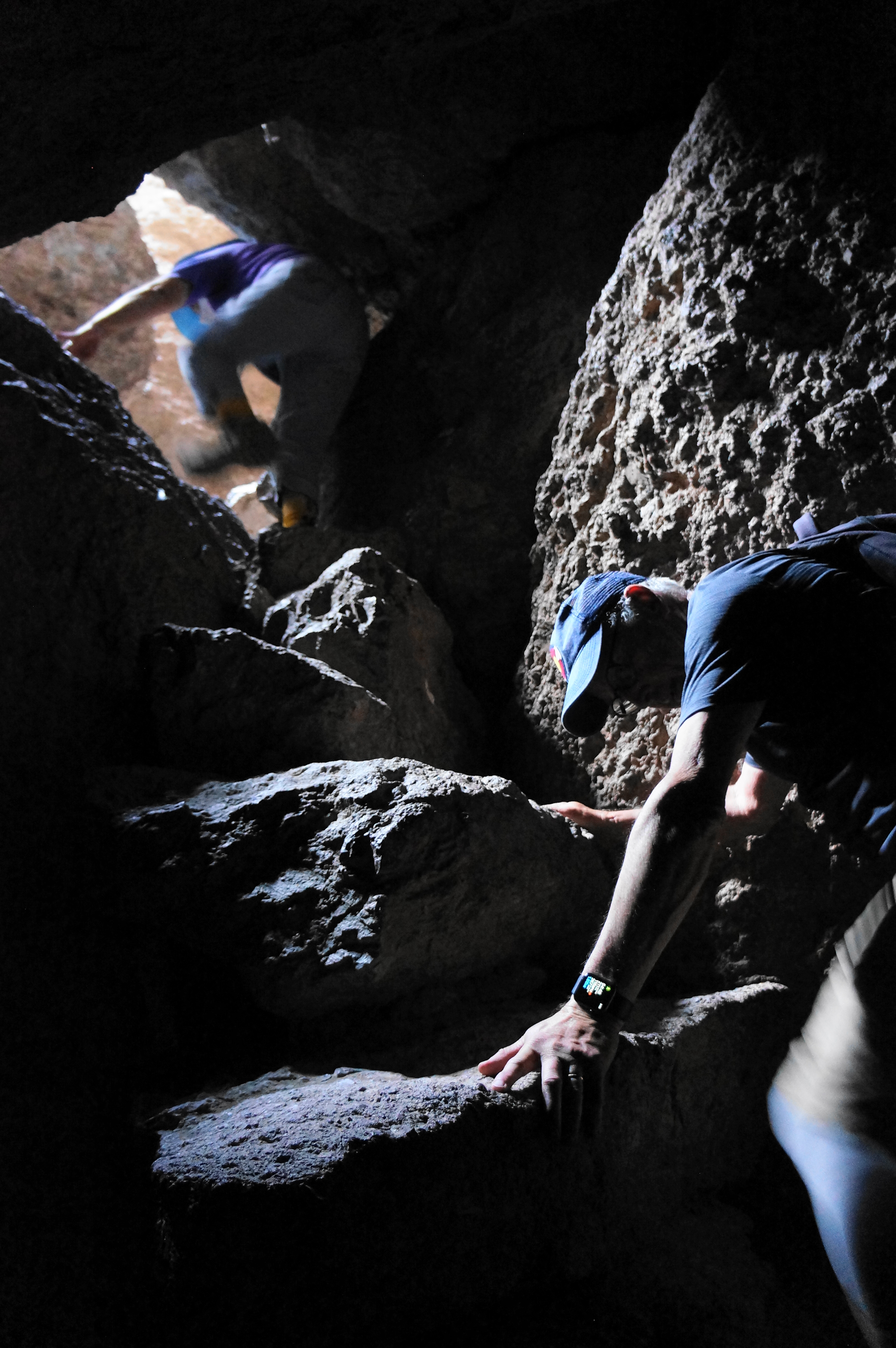 Pass through a gate to enter Balconies Cave, which is traversed in two sections, interrupted by a brief open section. The cave route immediately passes under an imposing chockstone, with the onward path cutting under a low-hanging boulder and up a thin staircase, leading into the darkest section of the cave—so dark, in fact, that one will need a light to see ahead. This area can be slow-going if the cave is crowded, with ramblers needing all four limbs to pull themselves through some moderately tight spaces.