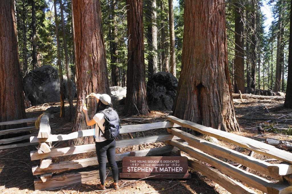 At 7/10 mile, the path approaches a fork: head left on the Perimeter Trail, following the signs of the Faithful Couple. This path is narrower but still relatively mild. Stay right at the fork 1/10 mile farther, then snake up a sloping hillside to another route junction at 1.1 miles. Look off to the right, where there is a stand of young sequoias dedicated to Stephen T. Mather, the first superintendent of the National Park Service.