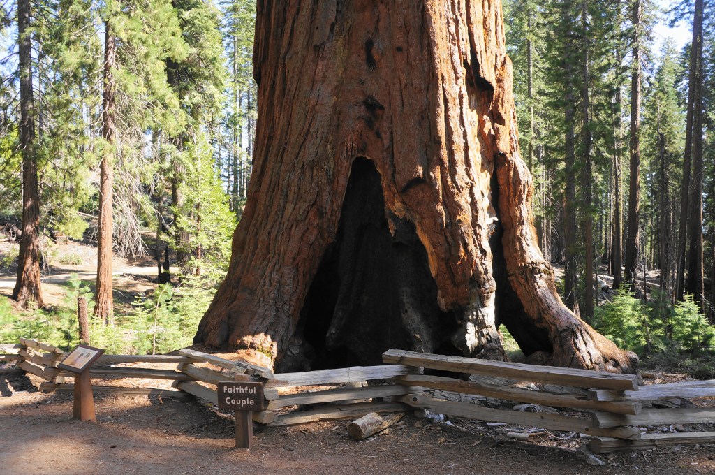 From here head right on the very wide road: this is the Mariposa Grove Trail and the main thoroughfare connecting the upper and lower groves. The winding path quickly comes between two mammoth pairs of sequoias; the one on the right is jointly called the Faithful Couple: once two different trees, these sequoias have since merged at the trunk. This could be considered a rare sight indeed—although interestingly the slightly smaller sequoias just across the trail to the left are also doing the same thing: fusing together into one body.