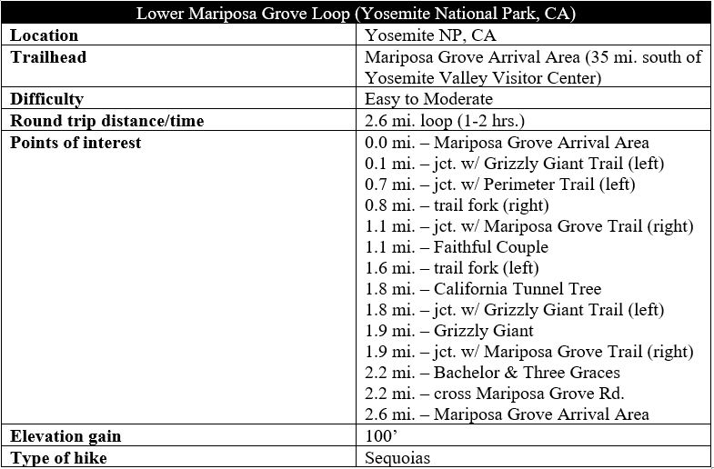 There are several loop hiking options from the arrival area, ranging from 1/3 mile to upwards of 10 miles. A modest choice that covers some of the most interesting and easily-accessible terrain is what I am calling the Lower Mariposa Grove Loop, a 2.6-mile circuit. (Note: This is a longer variant of the 2-mile Grizzly Giant Loop Trail, skipping a section in favor of a more interesting detour to an adjoined pair of sequoias called the “Faithful Couple.”)