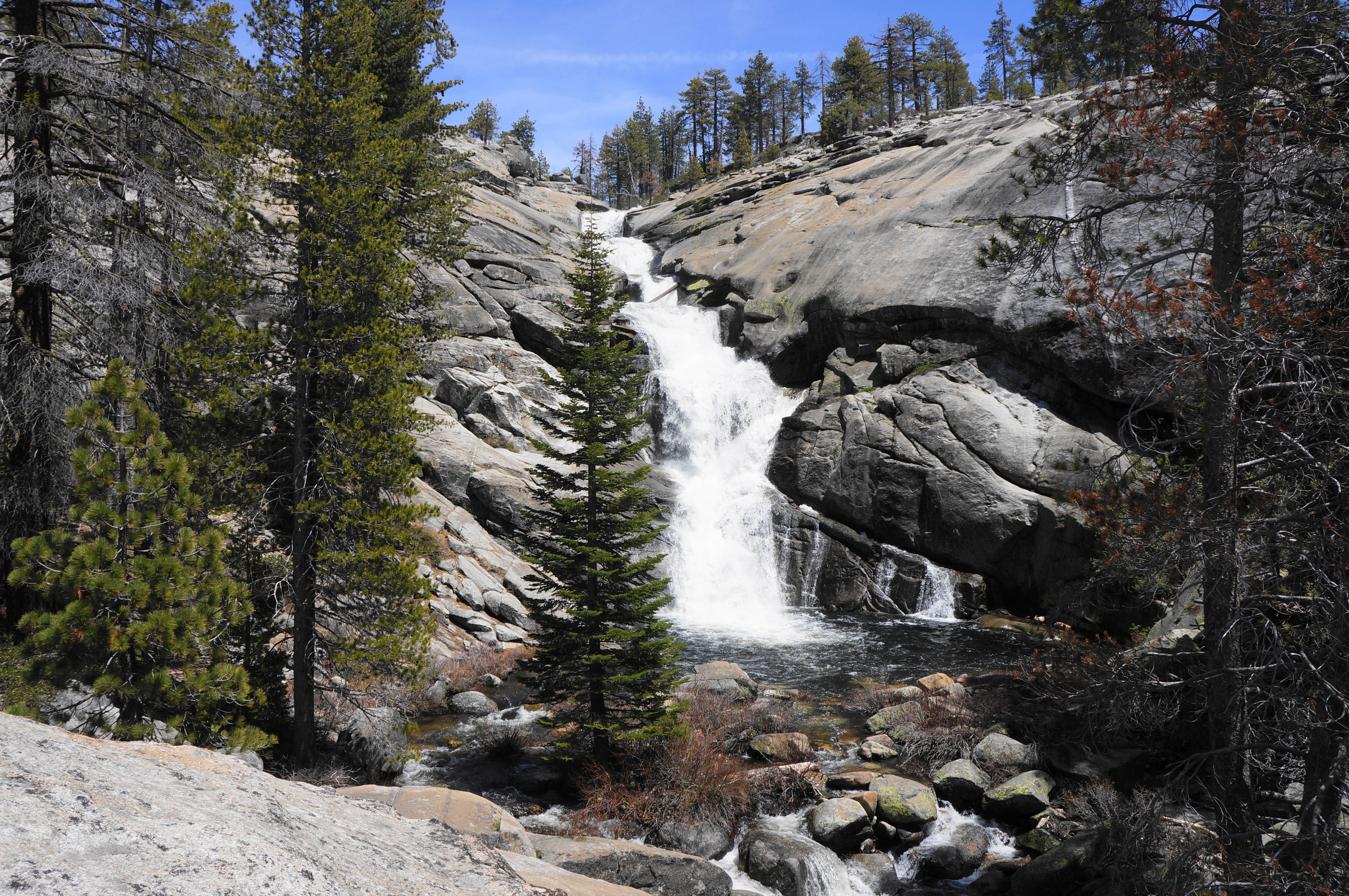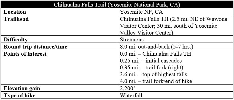 Yosemite National Park is the land of towering waterfalls—although seeing them often comes with a price: contending with throngs of other visitors for the best look at the majestic drops. Yet this is not the case everywhere: lesser-known waterfalls such as Carlon Falls or Foresta Falls draw fewer crowds. So too with mighty Chilnualna Falls, a multi-tiered drop in the Wawona area, near the southern reaches of the park. Here the spring runoff creates thunderous cascades, with the tallest freefalling around 250 feet. The Chilnualna Falls Trail offers access, reaching an initial set of cascades—impressive in itself—before rising steadily to the top of the highest drop two other beautiful torrents. The glen just east of the trail fork at mile four, set just below the final falls, is a magnificent place to have lunch (or perhaps camp) and serves as the turnaround point for the hike.