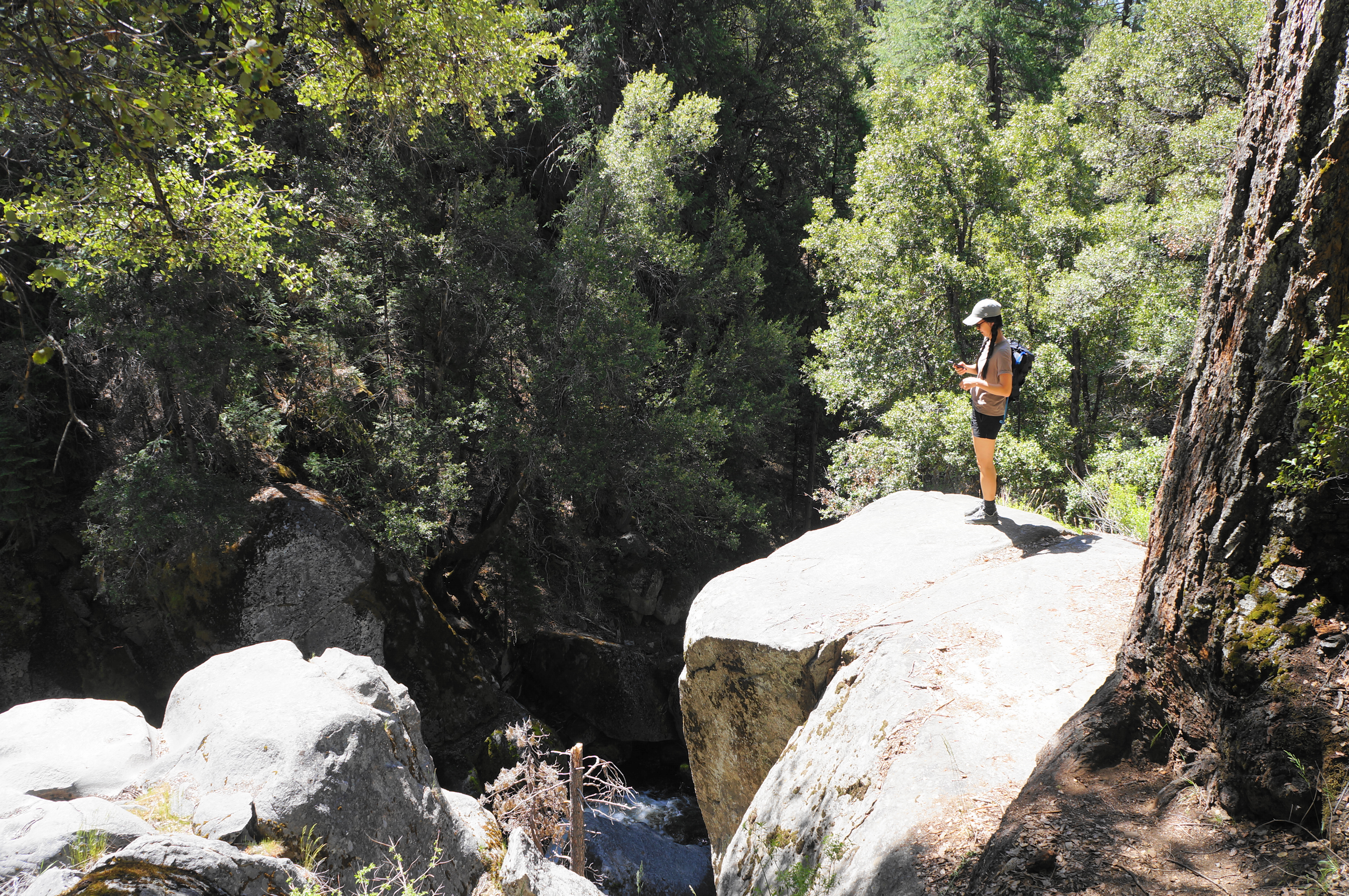 As the hikers enter a thicker coniferous layer, the Chilnualna Falls Trail rises within earshot of the rumbling stream and traverses a minor tributary at about the one-mile mark. For a brief period the route levels off and heads east to return to Chilnualna Creek. A couple spur trails offer access to the stream, making for a nice snack spot.