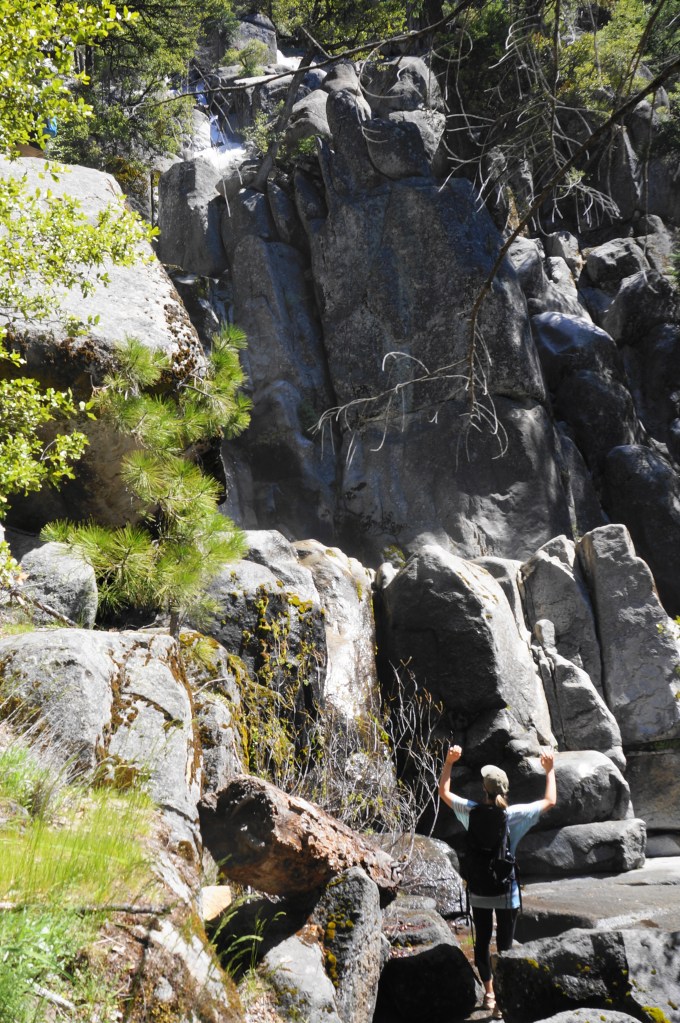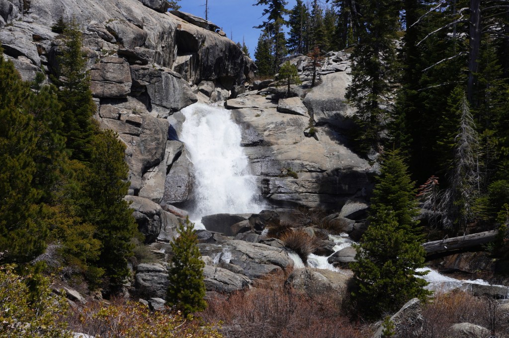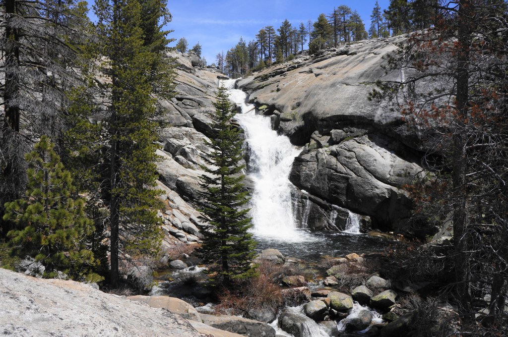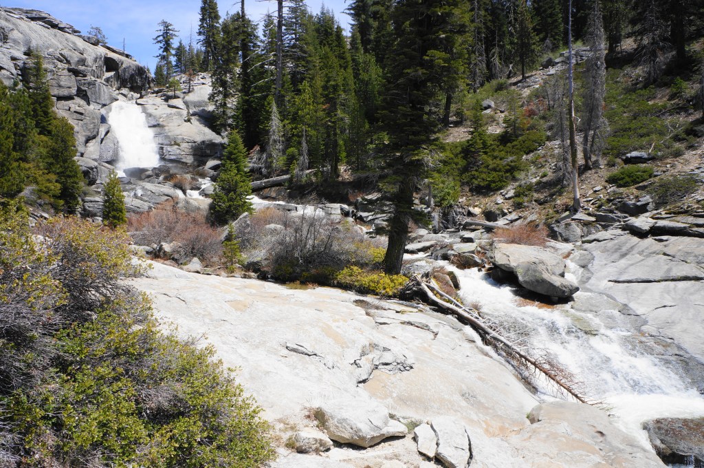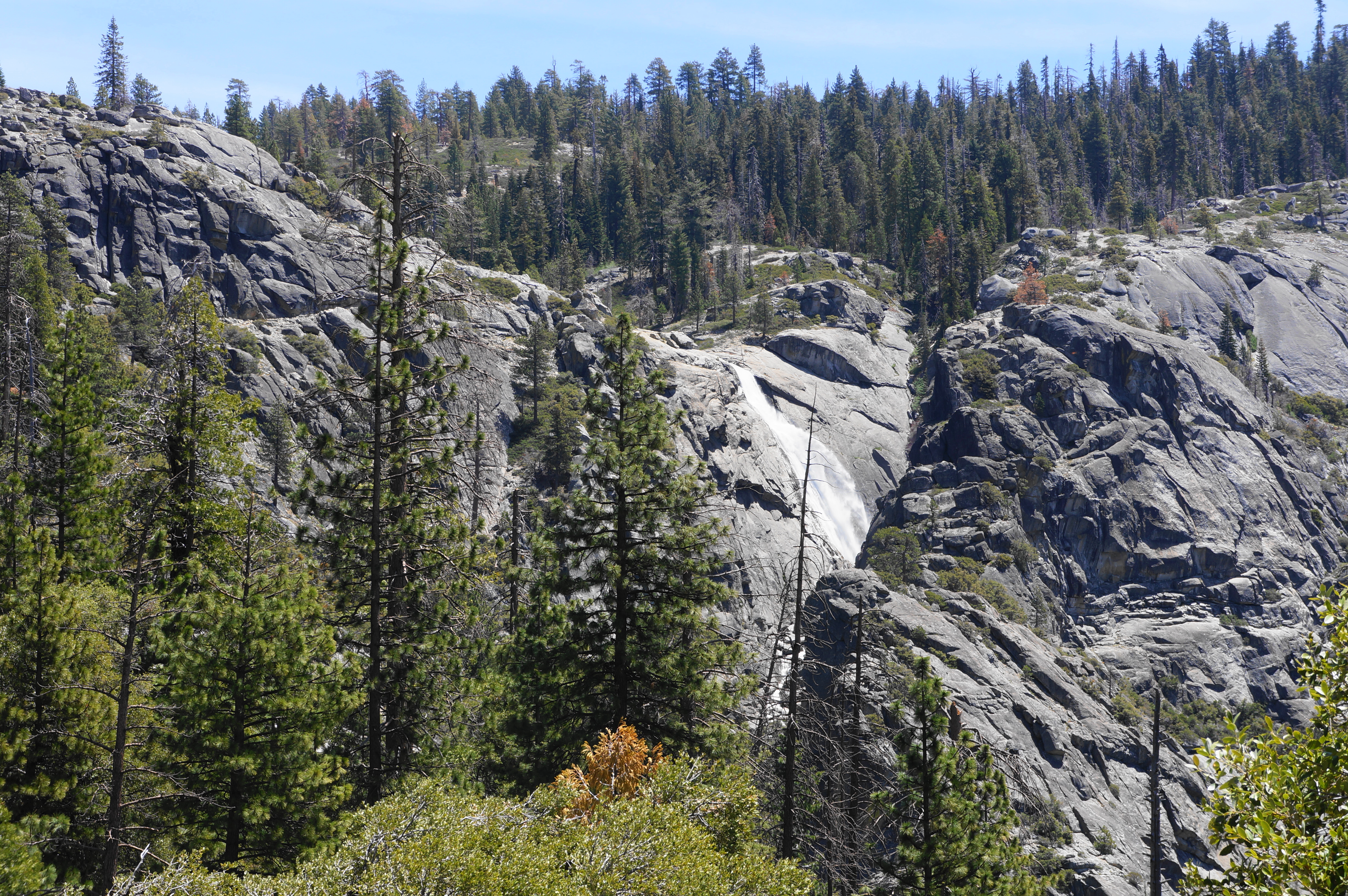 It is not until about 2.6 miles that hikers catch their first glimpse of Upper Chilnualna Falls: the highest cataract drops around 250 feet but remains very distant and is partially blocked from view by a protruding outcrop.