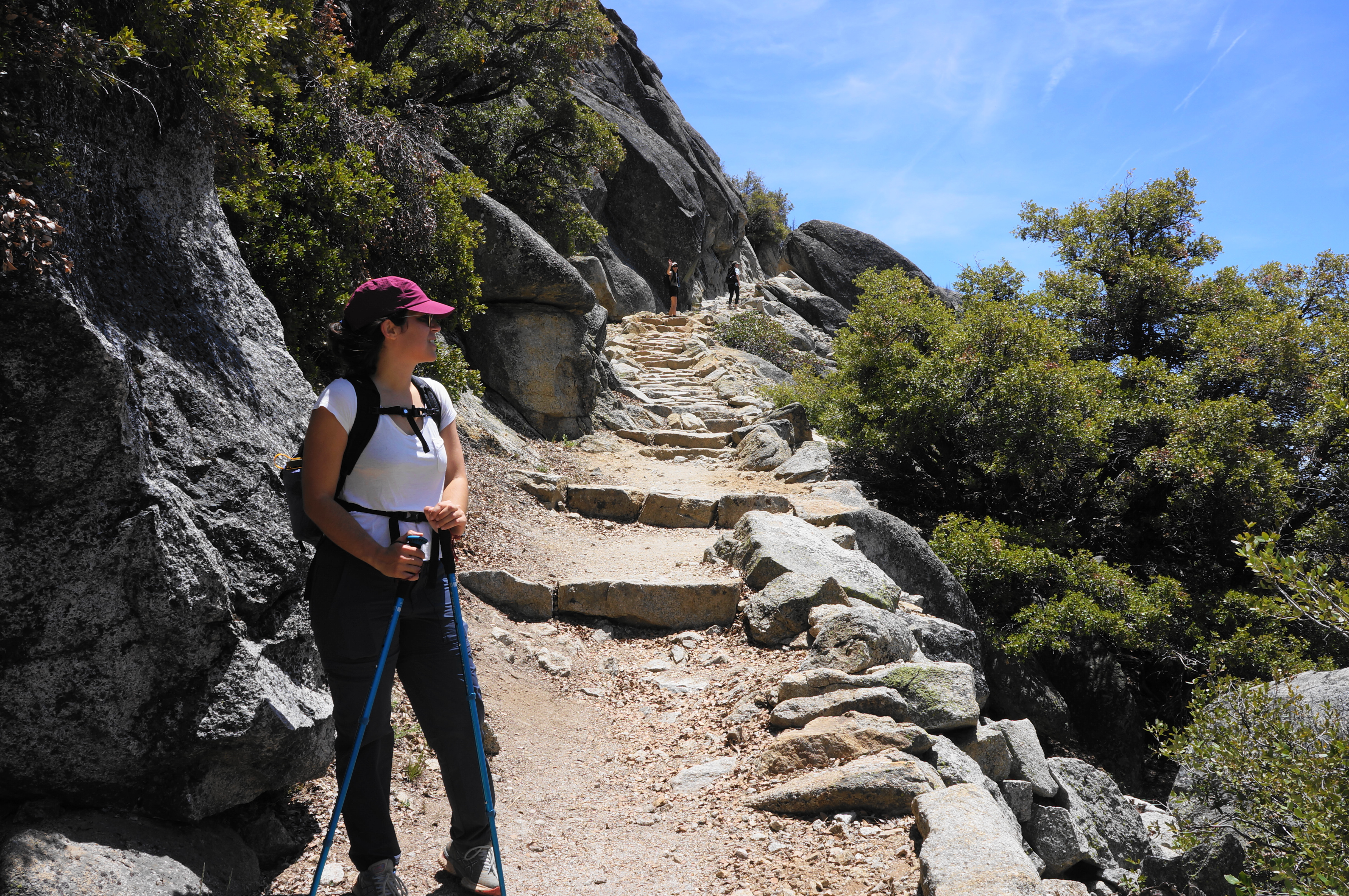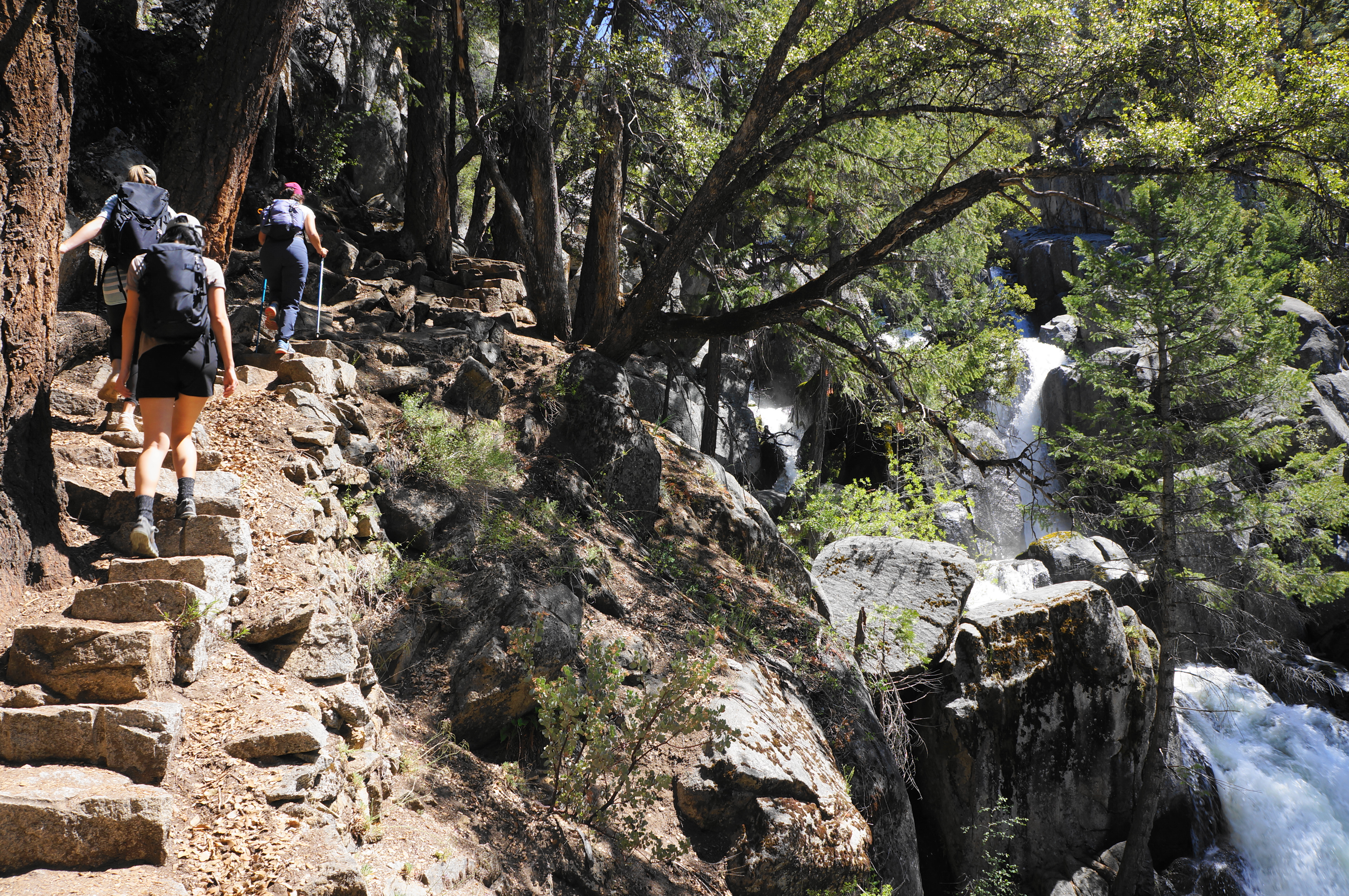 The views improve upon crossing another tributary at about 2.95 miles, then the trail settles into an eastward tread toward the falls. At 3.5 miles, the path turns into an epic staircase resembling the famous ledge section of the High Sierra Trail in nearby Sequoia National Park. This final stretch offers excellent views of the valley and culminates at the top of the highest cascade at Upper Chilnualna Falls.