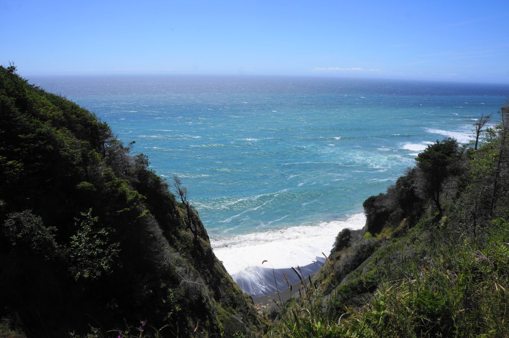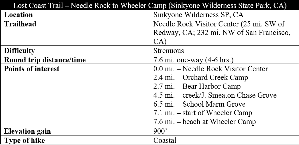 The 27-mile southern section can be subdivided into four parts, including, from north to south: (1) a roughly 8.5-mile jaunt from Hidden Valley/Shelter Cove to Needle Rock Visitor Center; (2) an approximately 7.5-mile trek from Needle Rock to Wheeler Camp; (3) a 3.5-mile stretch between Wheeler and the beach at Little Jackass Creek; and (4) a final connection between Little Jackass and Usal Beach (7.5 miles). This post covers section 2, describing a one-way hike that culminates at the spectacular beach camp at Wheeler, a former logging community that has long since returned to its natural state. (Note: The subsequent section connecting Wheeler with Little Jackass is described in a second post.) Hikers may cover this section as part of a longer through-hike (from Mattole or Shelter Cove to Usal) or as an out-and-back that would make for a very long day hike but a reasonable 2- or 3-day backpack. Expect very rugged conditions, with a very overgrown trail and extensive elevation gain and loss. This is not a beginner’s hike—but highly rewarding for those willing and able to brave the Sinkyone Wilderness.