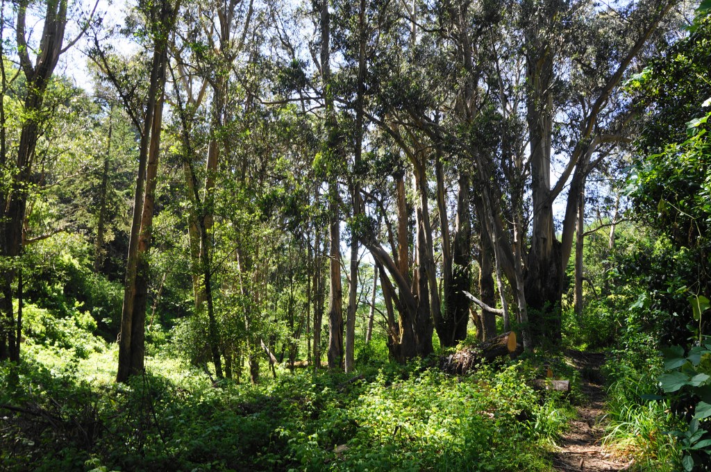 Pushing on, the wide track suddenly ends, replaced by a narrow single-track that pushes through dense brush, a teaser of what is to come. After crossing Orchard Creek, continue southeast along the broader Railroad Creek, entering a eucalyptus grove—a clear sign of former human development. These non-native trees were planted en masse across much of the state after the mid-19th century. The trail along here roughly follows the railbed that was once used to haul lumber, culminating at Bear Harbor just beyond. There are few traces of it left—but there are a few concrete slabs that serve as a reminder of the once-bustling logging enterprise.