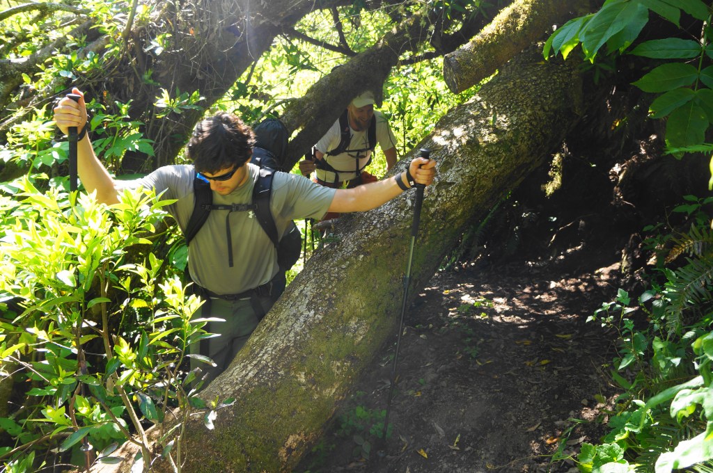 Immediately after the junction, hikers will notice a significant deterioration in the quality of the trail. The path is quickly overtaken by dense brush, including blackberry bushes and assorted greenery but also thistle and some poison oak: wearing pants (and perhaps long sleeves) is a must. The subsequent ¾ mile is one of the roughest stretches of the hike, beginning with the thicket, then, especially after crossing a modest stream, rising a slope with several downed trees. Avoiding the obstacles requires some backpacker jujitsu: clambering over or ducking under fallen trunks in several places.