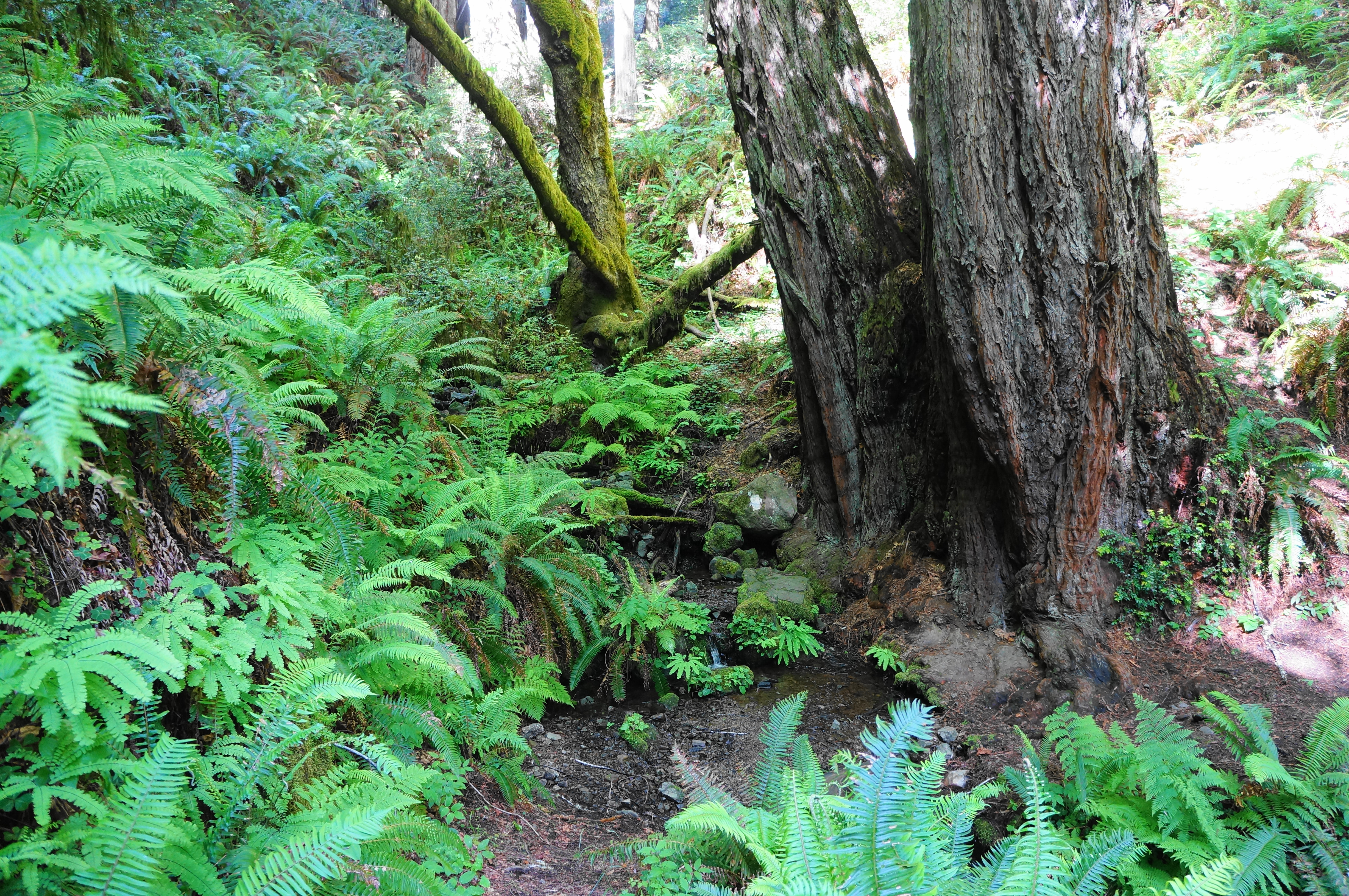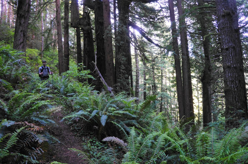As the Lost Coast Trail begins another descent, it passes two depressions on the left that are filled with immature redwoods. Soon after, there is another surprising uphill, this one cresting at about 750 feet, following at last by the long, final descent to Wheeler Camp and the beach. As a small drainage feeds into a larger one, hikers pass through School Marm Grove, another impressive clutch of redwoods.
