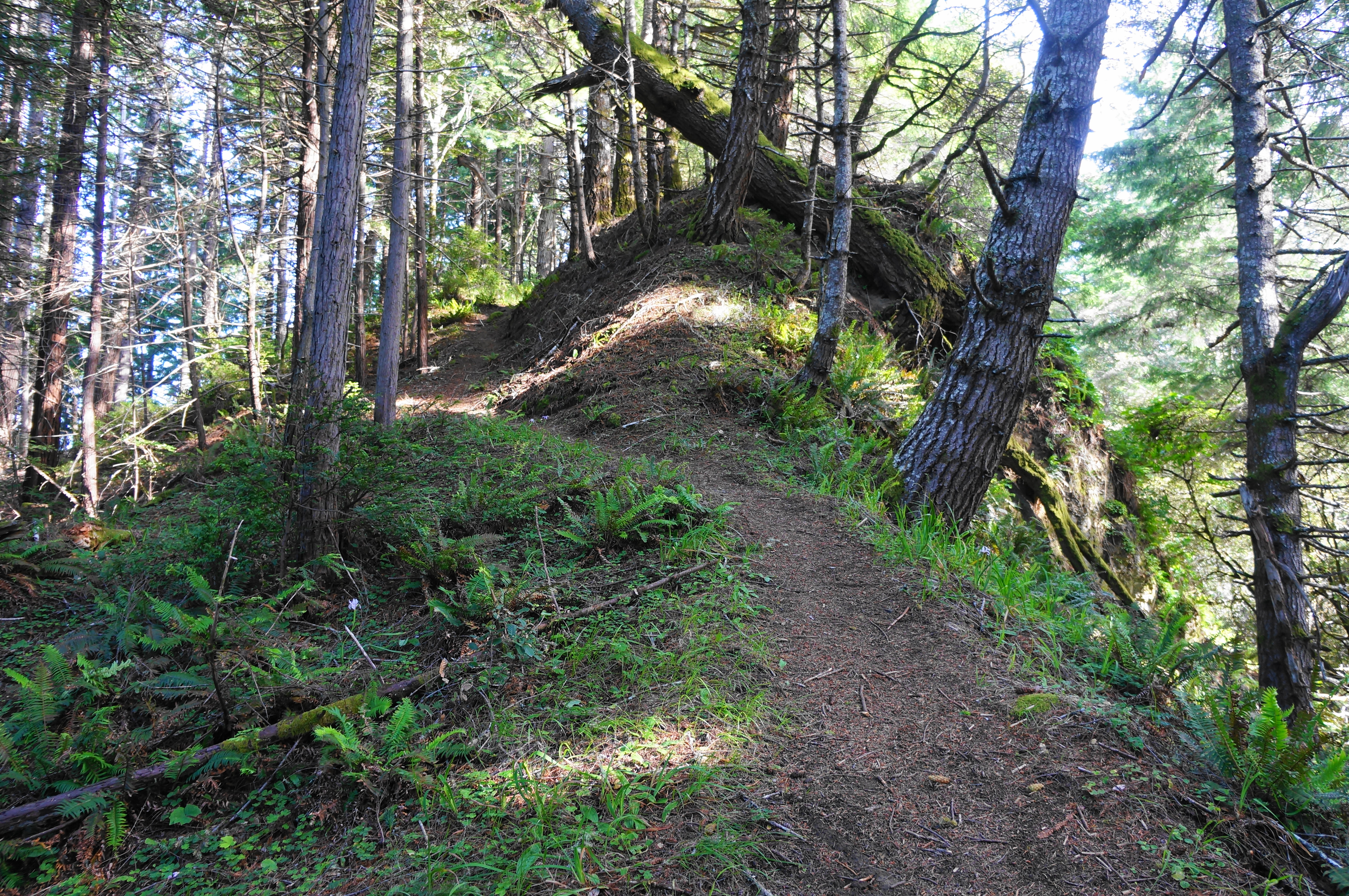 The trail beyond the stream is free of thistle but very steep and full of tree obstacles. Take your time, rising amid the firs and ferns, gaining about 250 feet in elevation—with five switchbacks—before levelling off briefly. The ascent resumes shortly thereafter but is milder and relatively free of fallen branches, and there are some obscured views down to the coast below.