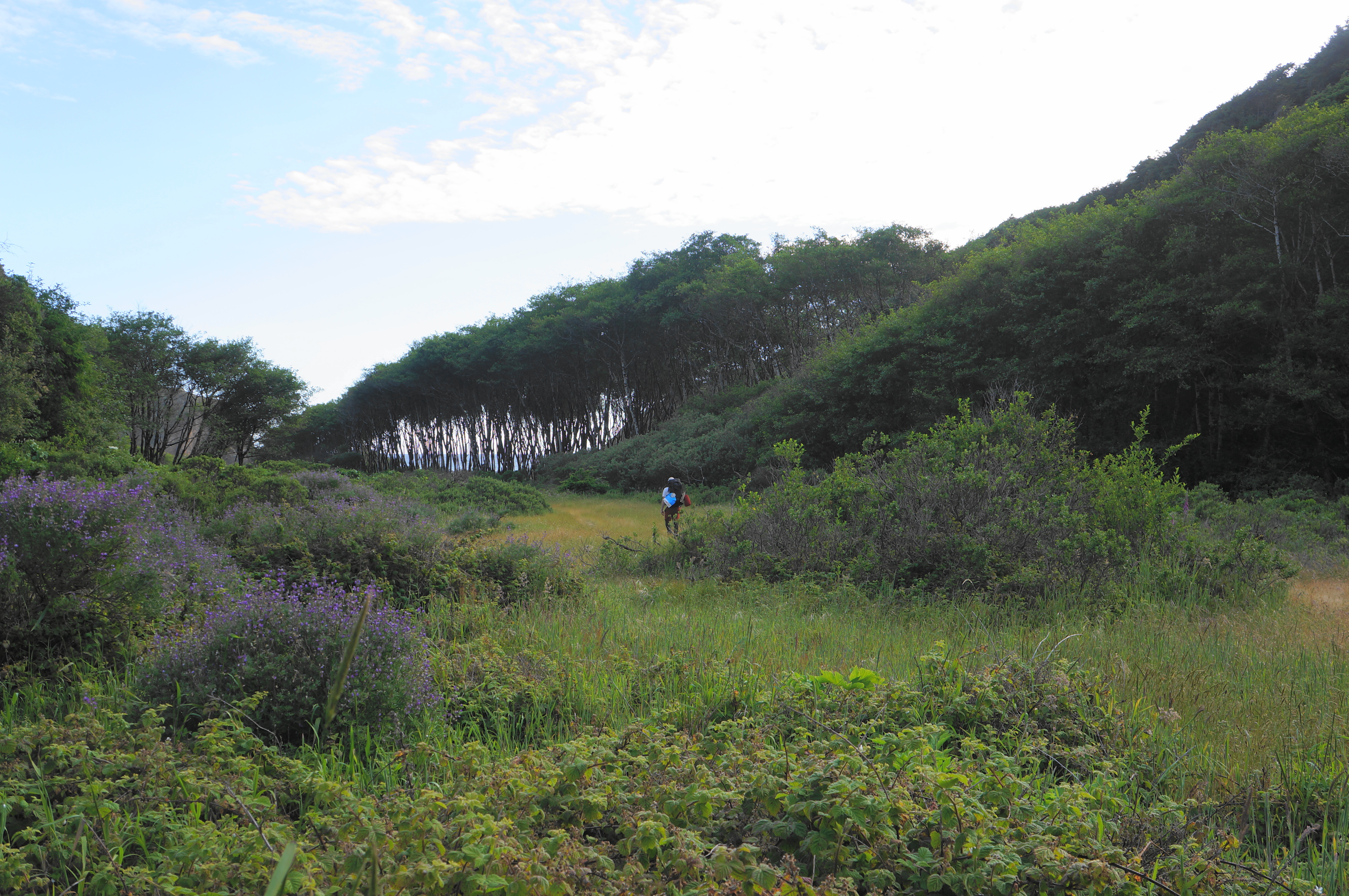 Within 1/10 mile, the trail crosses the North Fork (an easy rock-hop) then continues through more brush to another campsite at 7.4 miles. This one has a pit toilet off to the left (the closest to the beach). Cross a second stream—the main branch of Jackass Creek—soon thereafter, then come to an open scrubland with several more sites on the right. It is hard to believe, but this seemingly pristine area was once home to a bustling logging community. The dense tree cover has since recovered, returning the drainage to its near-natural state.