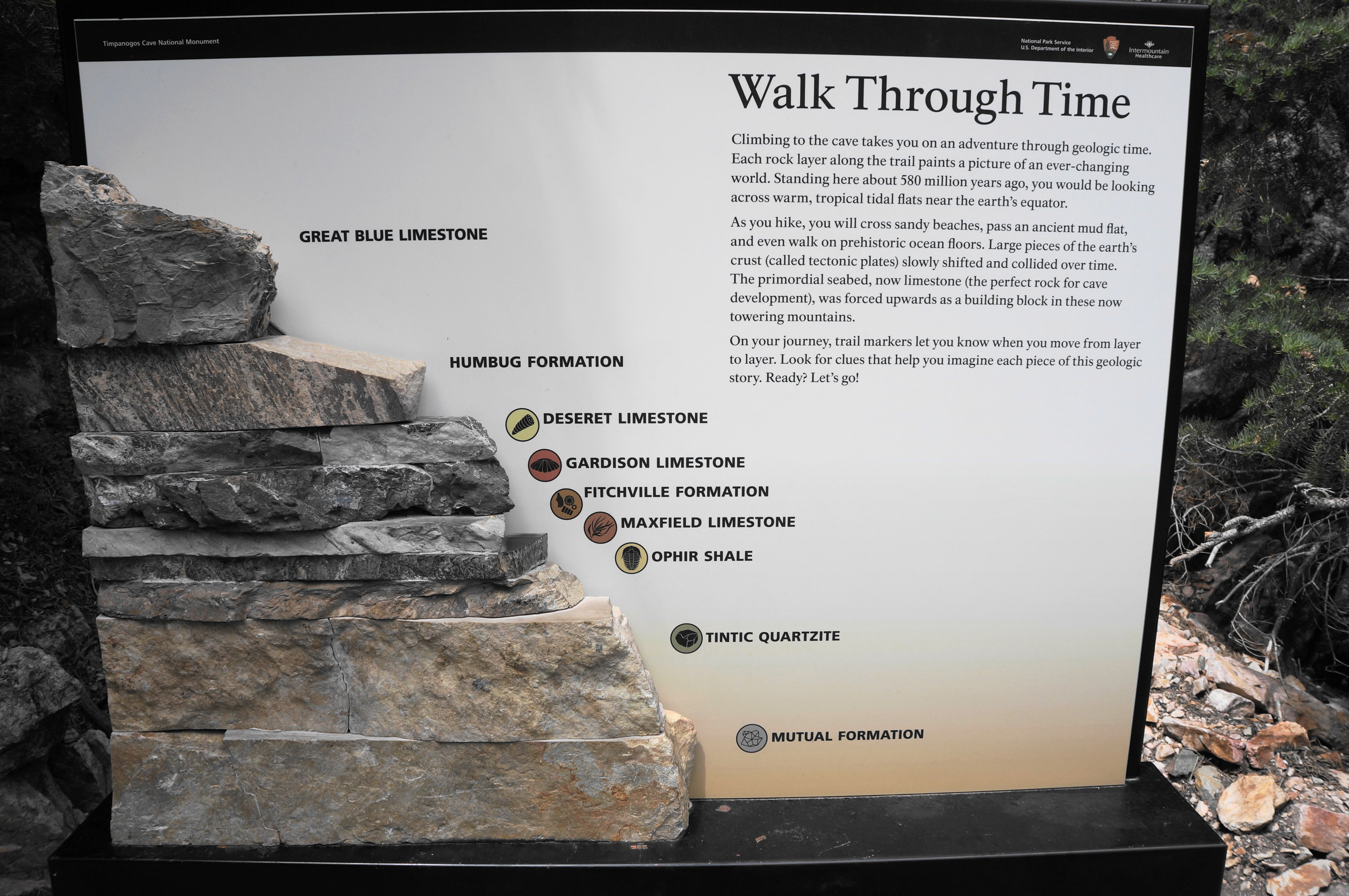 Soon the Timpanogos Cave Trail leaves the Mutual Formation behind and rises into the Tintic Quartzite, a largely chalky-colored layer composed of sand deposited along a shallow sea around 540 million years ago.