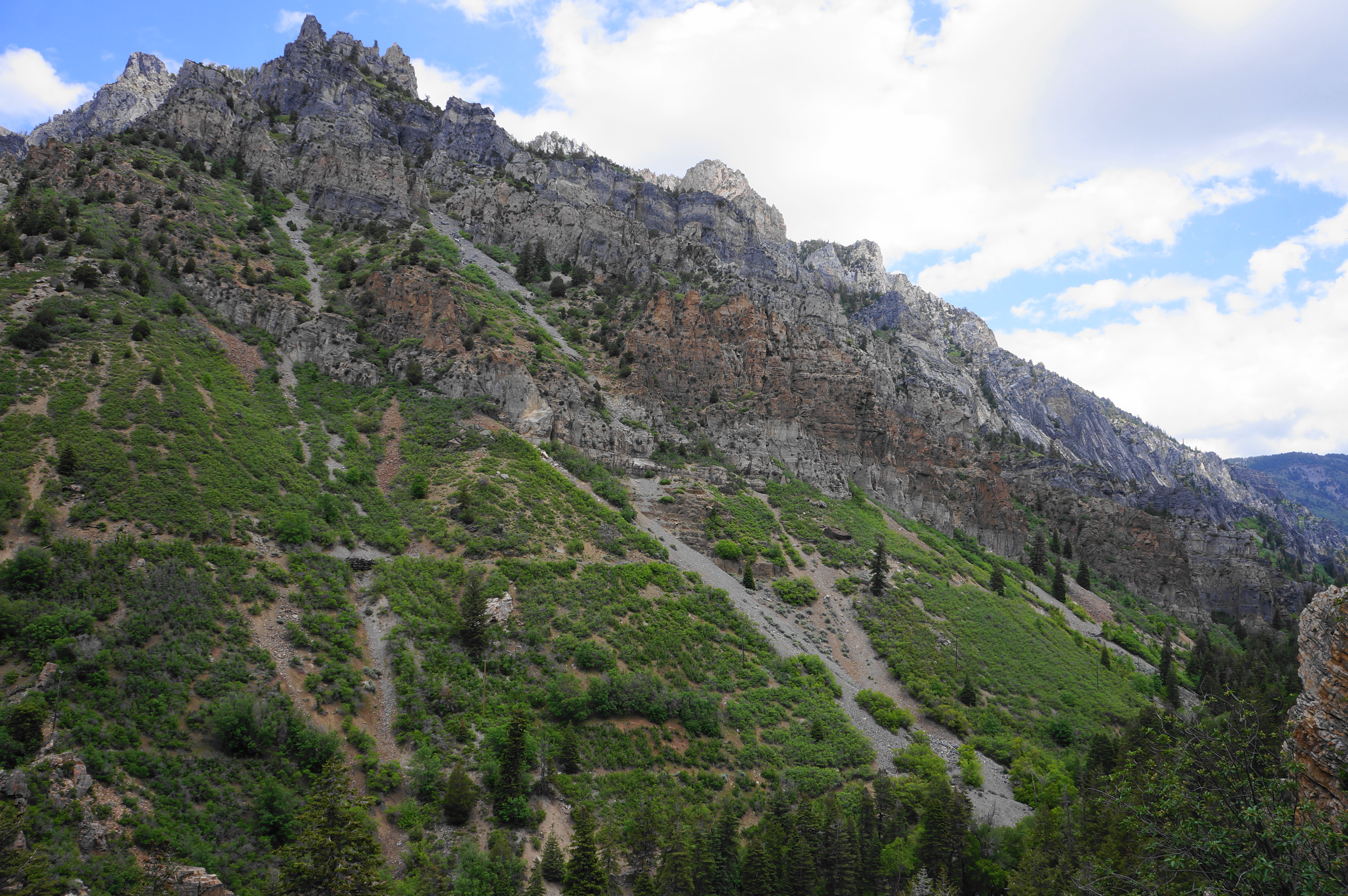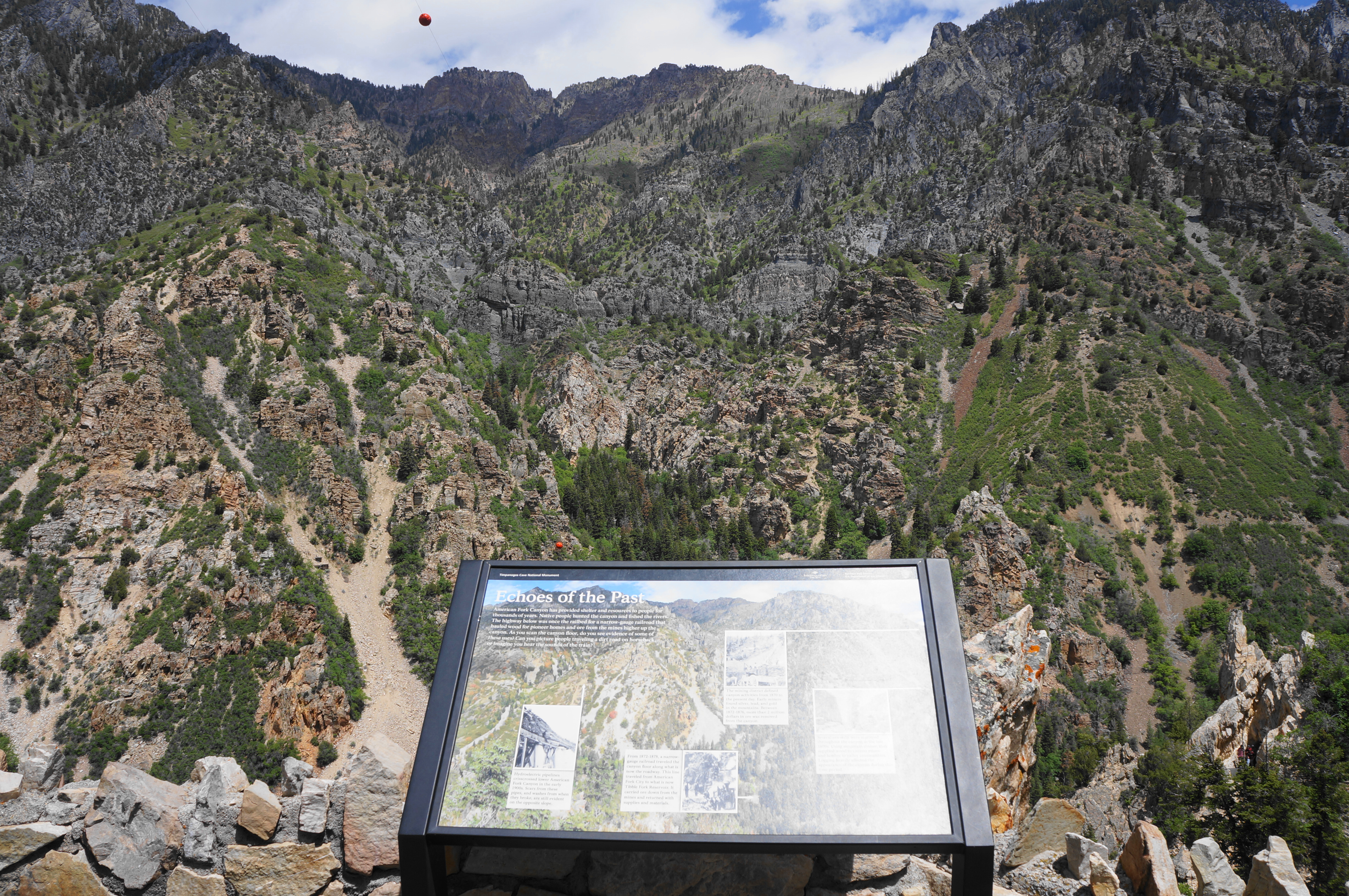 Pass through a second tunnel at around ½ mile, then take in the view at the overlook with two waysides—one on past mining and another on the slanted quartzite cliffs. One can see the remains of old mining roads and structures along the opposite wall of the canyon. Many of the early European settlers of the area sought to tap the various ores of the Wasatch Range, although the difficulty of transport stunted the emergence of large mining operations.
