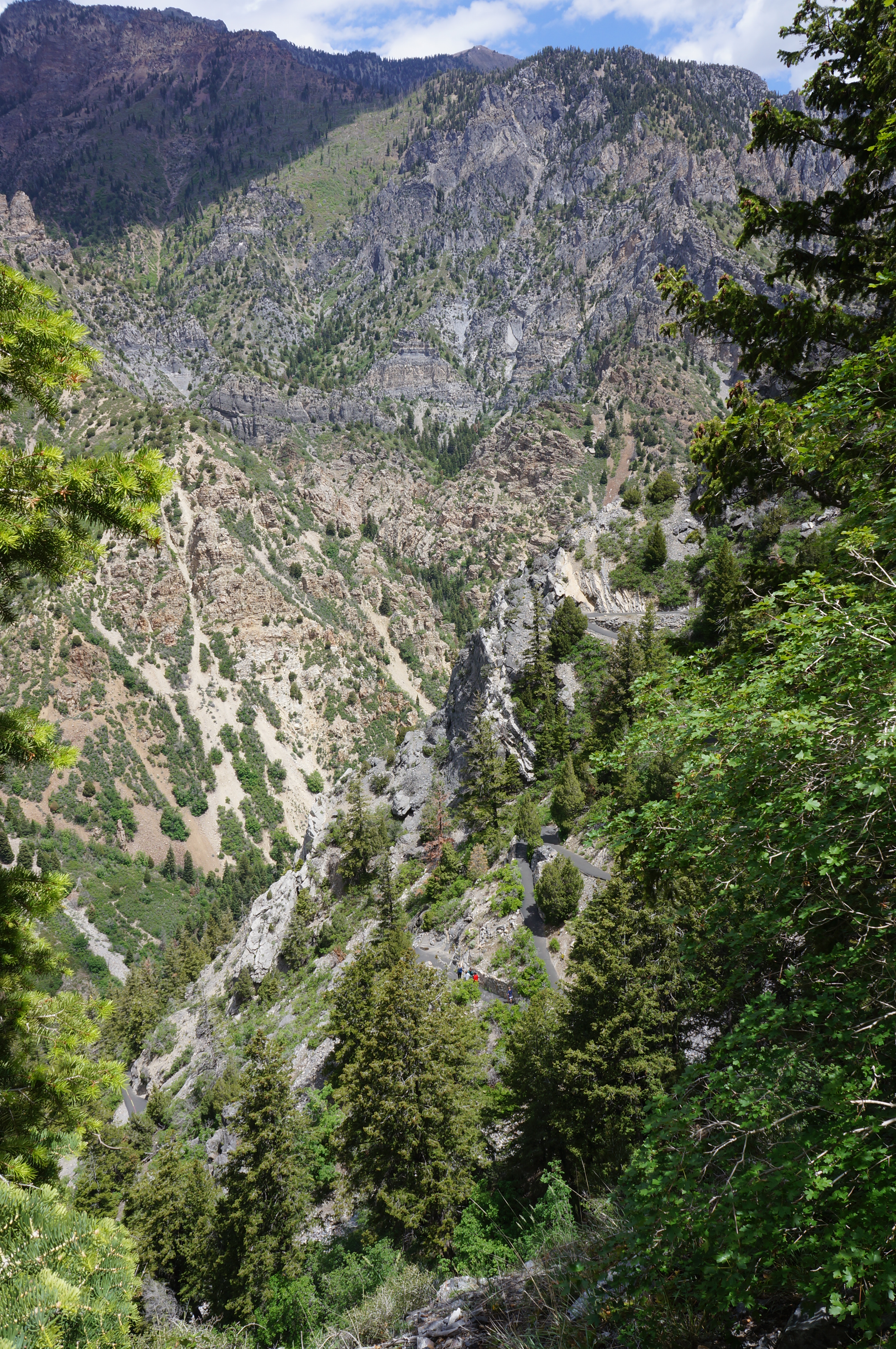 Now back out in the light, hikers pick up the paved Timpanogos Cave Trail again, this time snaking along ledges and below rock faces until an open area with a few switchbacks and fine views down American Fork Canyon. Enjoy the various overlooks, then proceed back down to the one and only trail junction; here the path merges with the trail up to the cave entrance, and the rest of the hike involves retracing steps from the ascent. This time, however, the going is much easier, with much of the time spent cheering on the much slower uphill hikers.