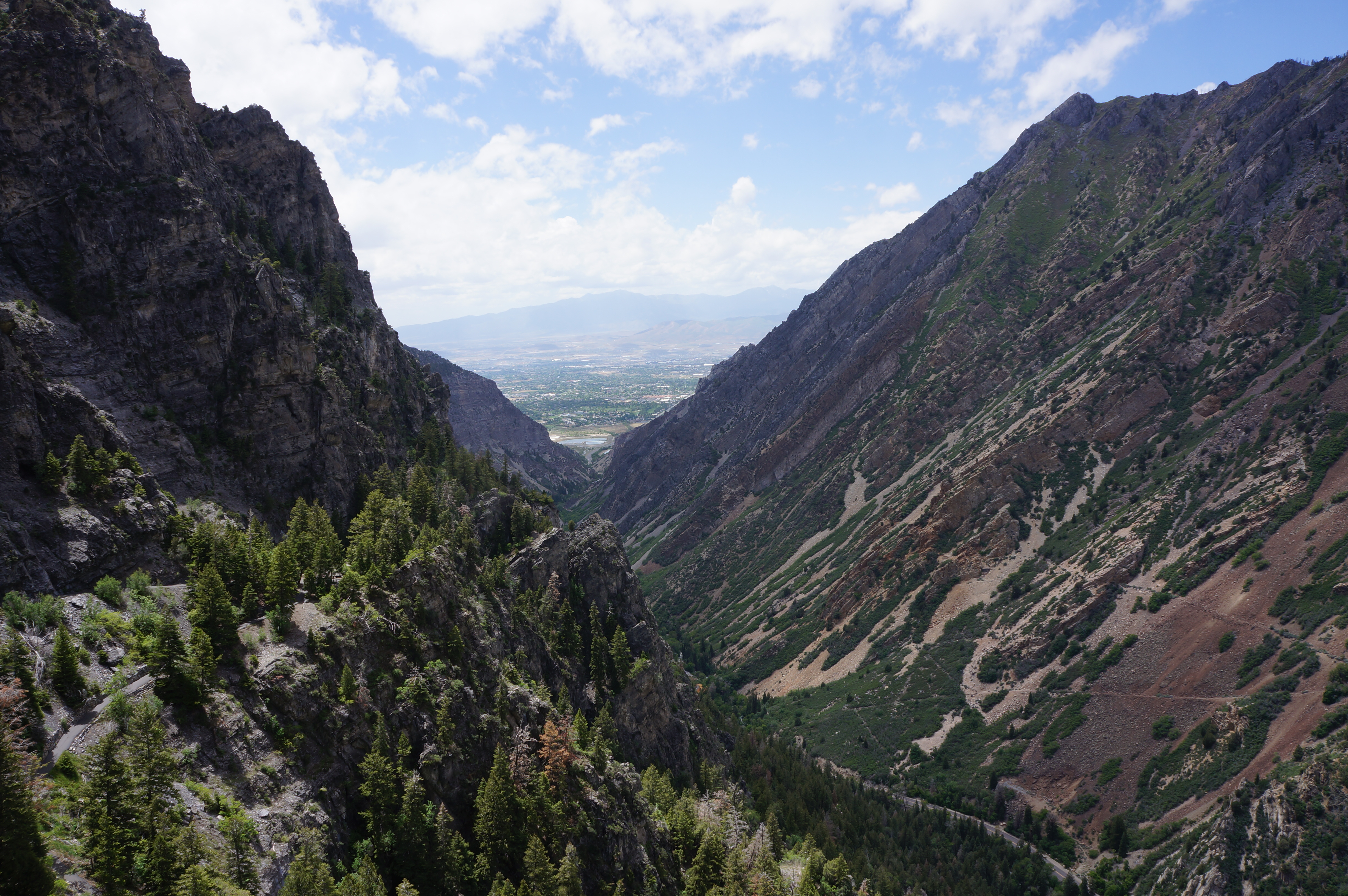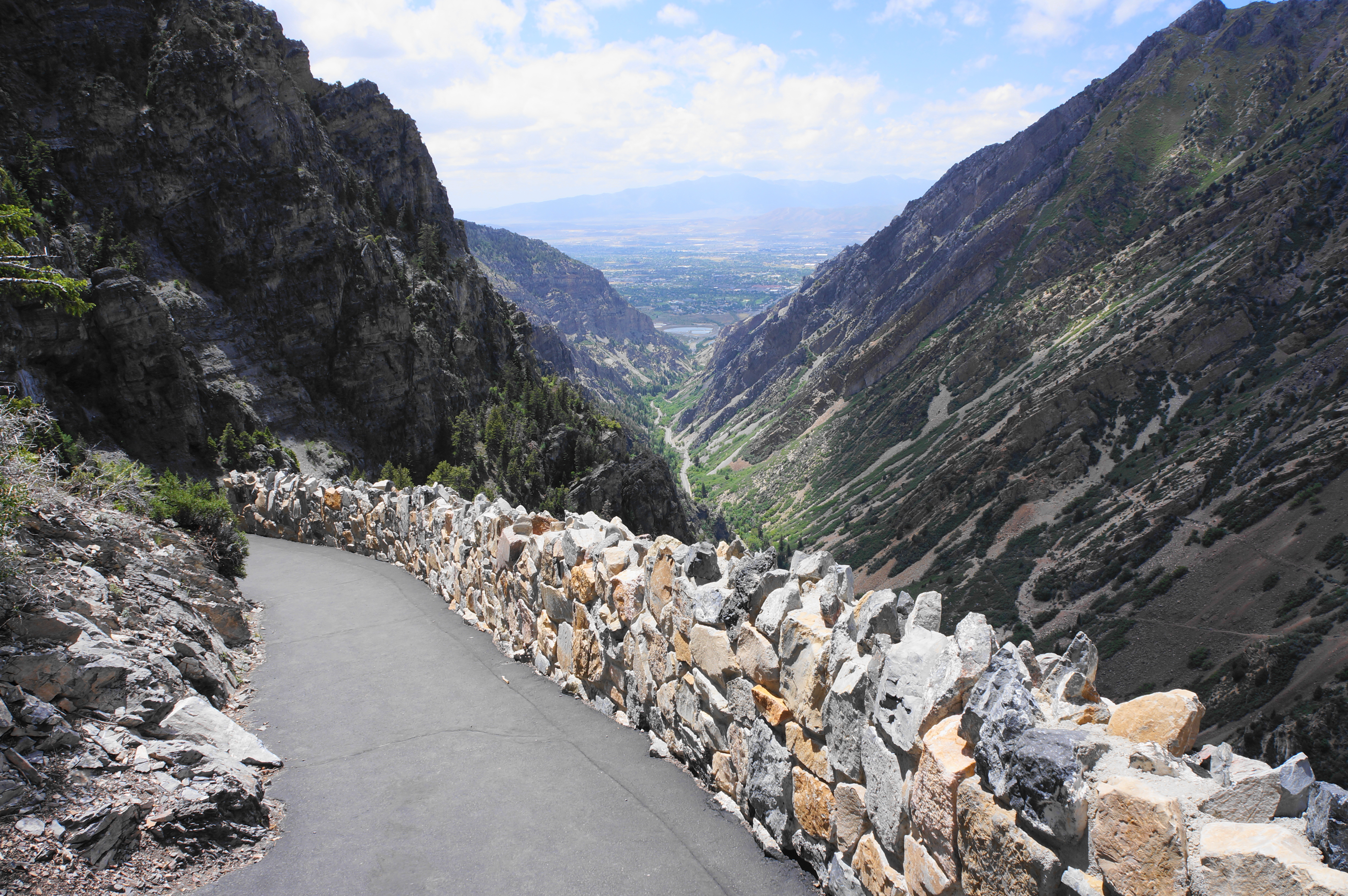 From here the trail proceeds up a right-hand switchback, then edges along rock faces to the first of two tunnels, at about 4/10 mile. A few steps beyond, there is a bench and a nice overlook with views down American Fork Canyon toward Utah Valley and Provo. Hikers are now about one-quarter of the way to the cave entrance.