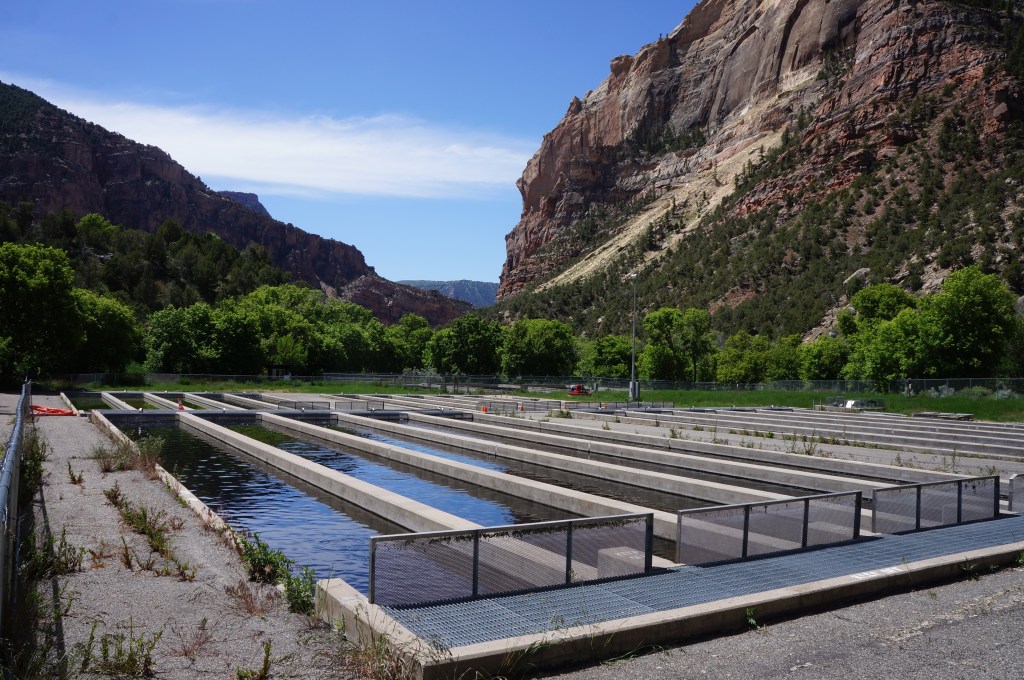 Park in the small parking lot adjacent to the fish hatchery, the latter of which covers much of the flat floodplain in this part of the canyon. Visitors by this point have not yet entered Dinosaur National Monument. The hike begins by crossing Jones Hole Road, then treads southward, passing several informational kiosks and the main hatchery on the right, where hikers can see hundreds of fish. The wide track parallels the facility on the left before leaving it behind at around .15 miles, where there is another information board.