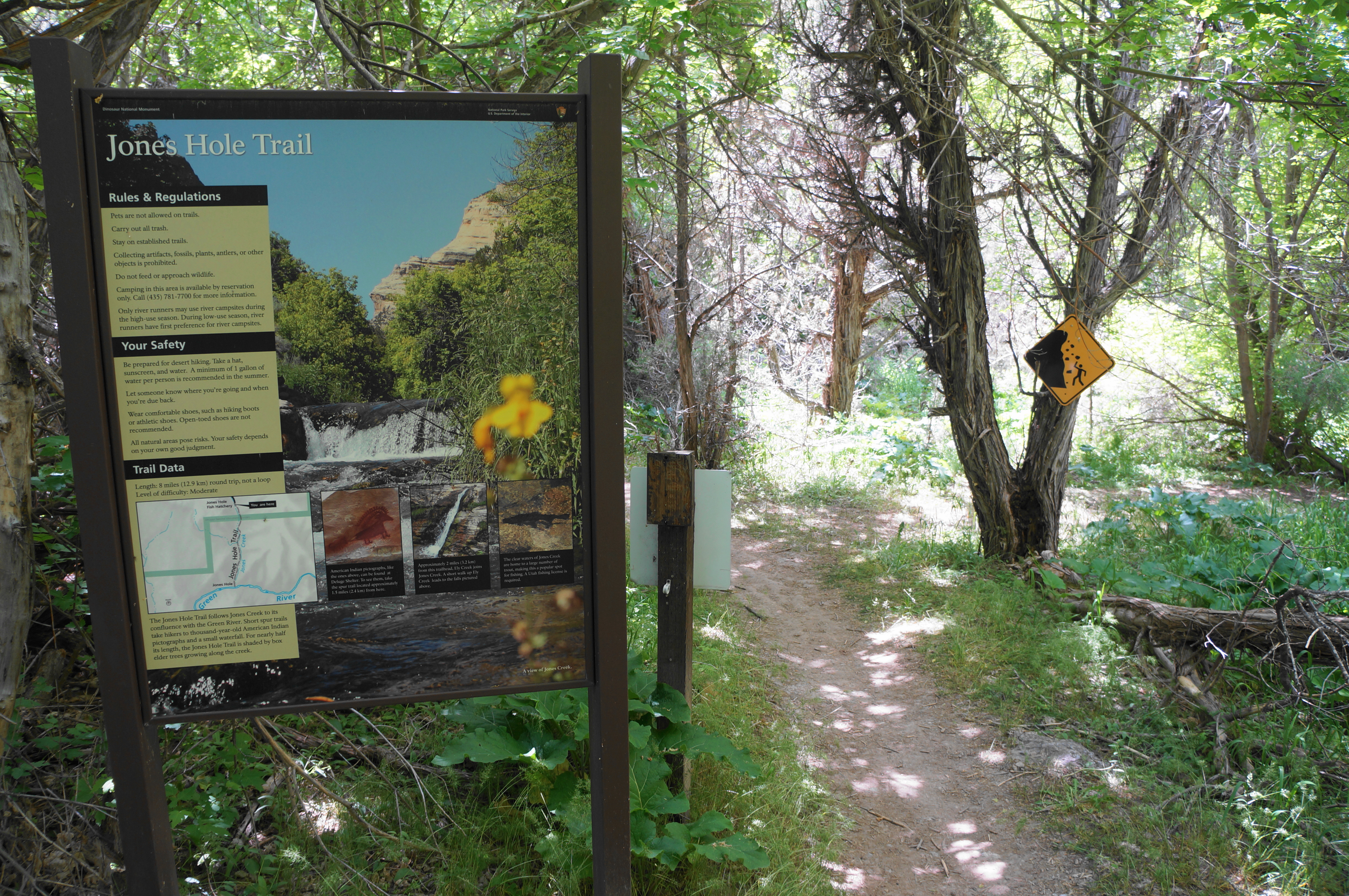 Continue straight as the trail lunges into the woods, passing a picnic table and the first views of Jones Hole Creek on the right. After running under a protruding outcrop, the Jones Hole Trail parallels the stream for a short distance, then briefly moves away again as it finally enters Dinosaur National Monument, marked by yet another large map/sign, this one directly about the trail.