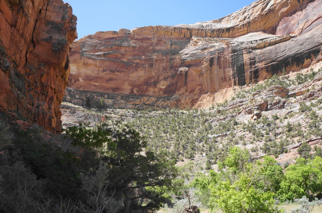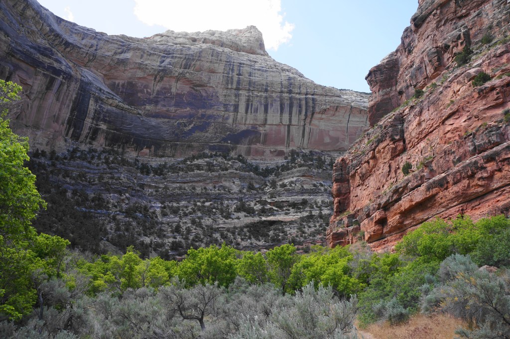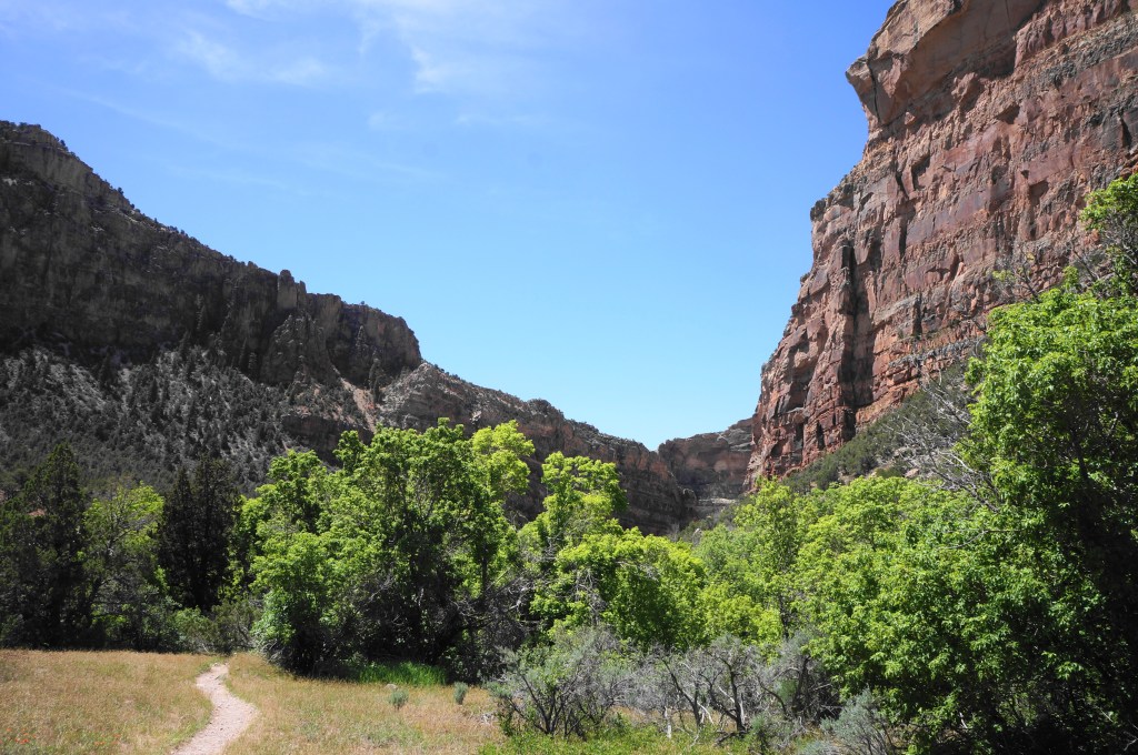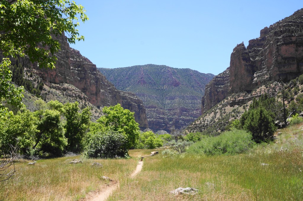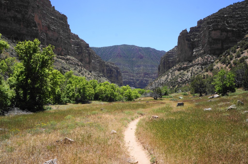The lovely stream is nice, but it is the dramatic, multi-hued cliffs that make this hike spectacular, so it is welcome around ½ mile when the vegetation recedes for a brief period, revealing views down to a canyon bend. Here the red- and cream-colored Weber Sandstone still predominates, although this will later change to Round Valley Limestone and Doughnut Shale (part of the Lodore Formation) as the canyon cuts deeper.