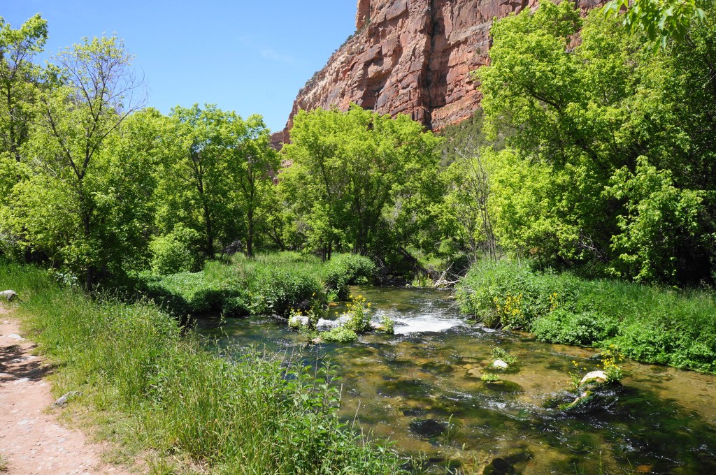 The Jones Hole Trail comes streamside again at about 3.3 miles, roughly following the creek for the next half mile. At around 3.8 miles, pass a sign for the “day use area” right – but skip this relatively uninspiring detour in favor of the left-hand trail. As the mouth of the canyon opens up and the high walls recede, Jones Hole Creek runs through a sandy alluvial delta—surprisingly calm at its culmination because it is dammed (naturally?) just near its terminus.