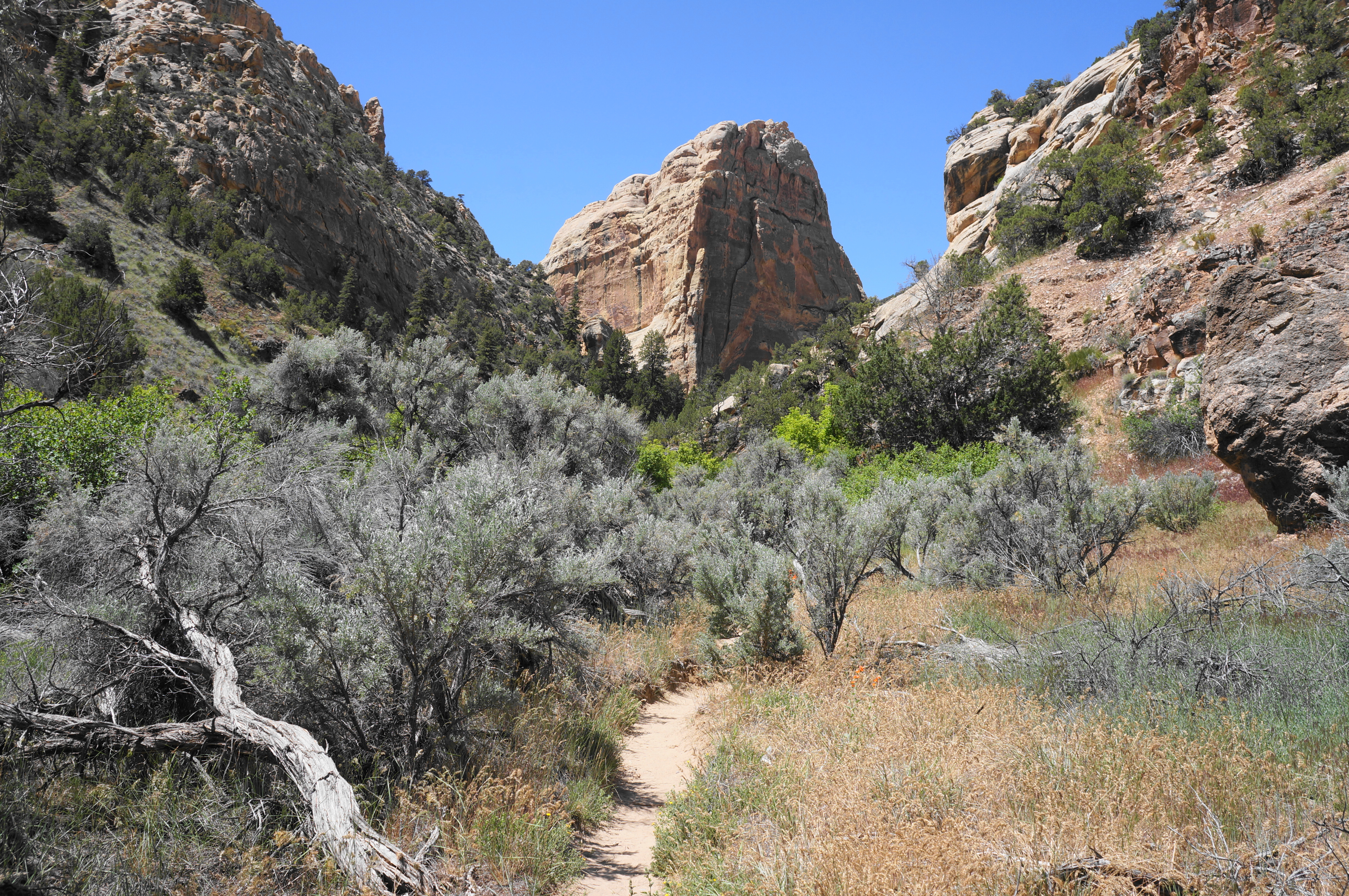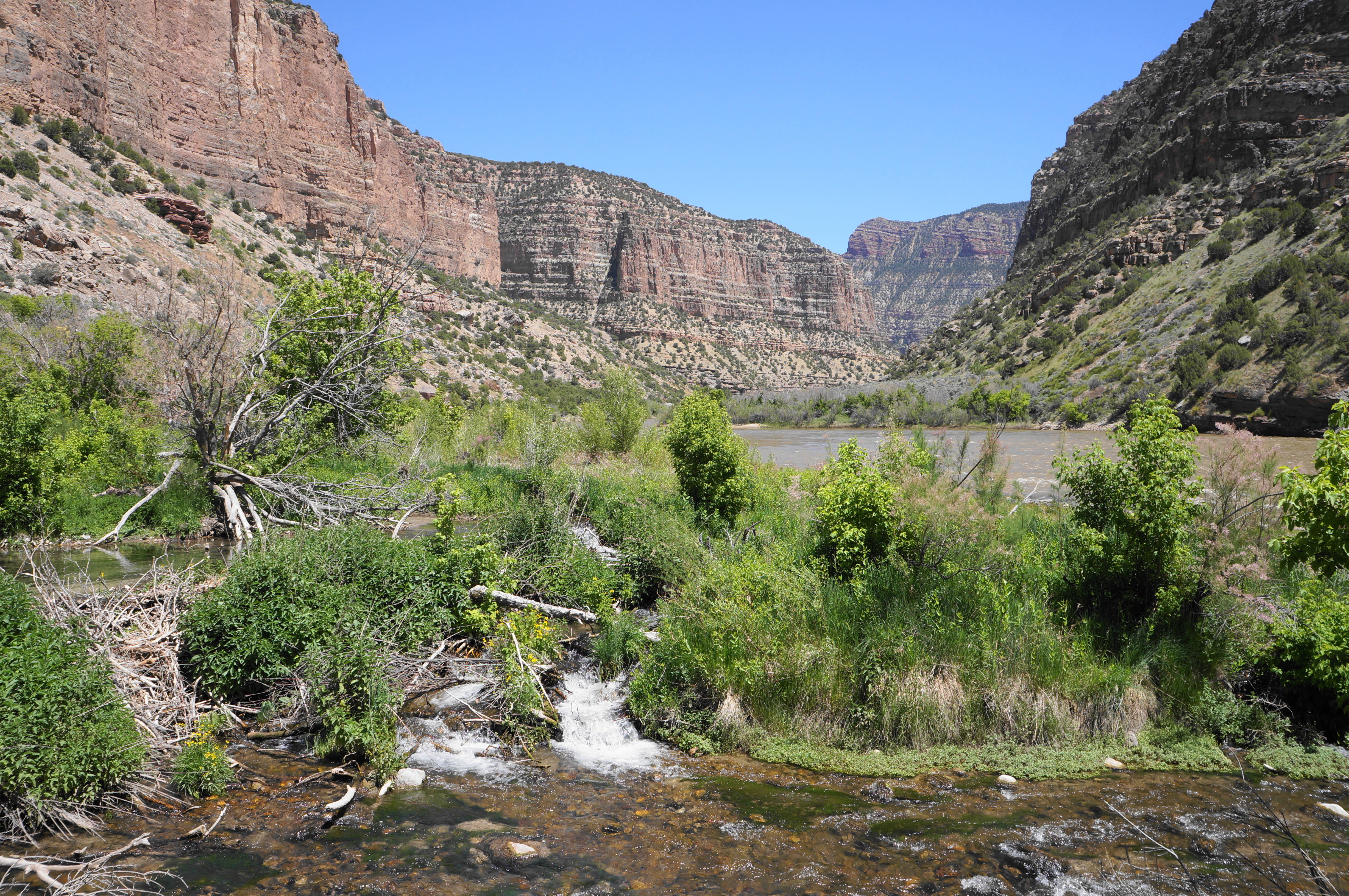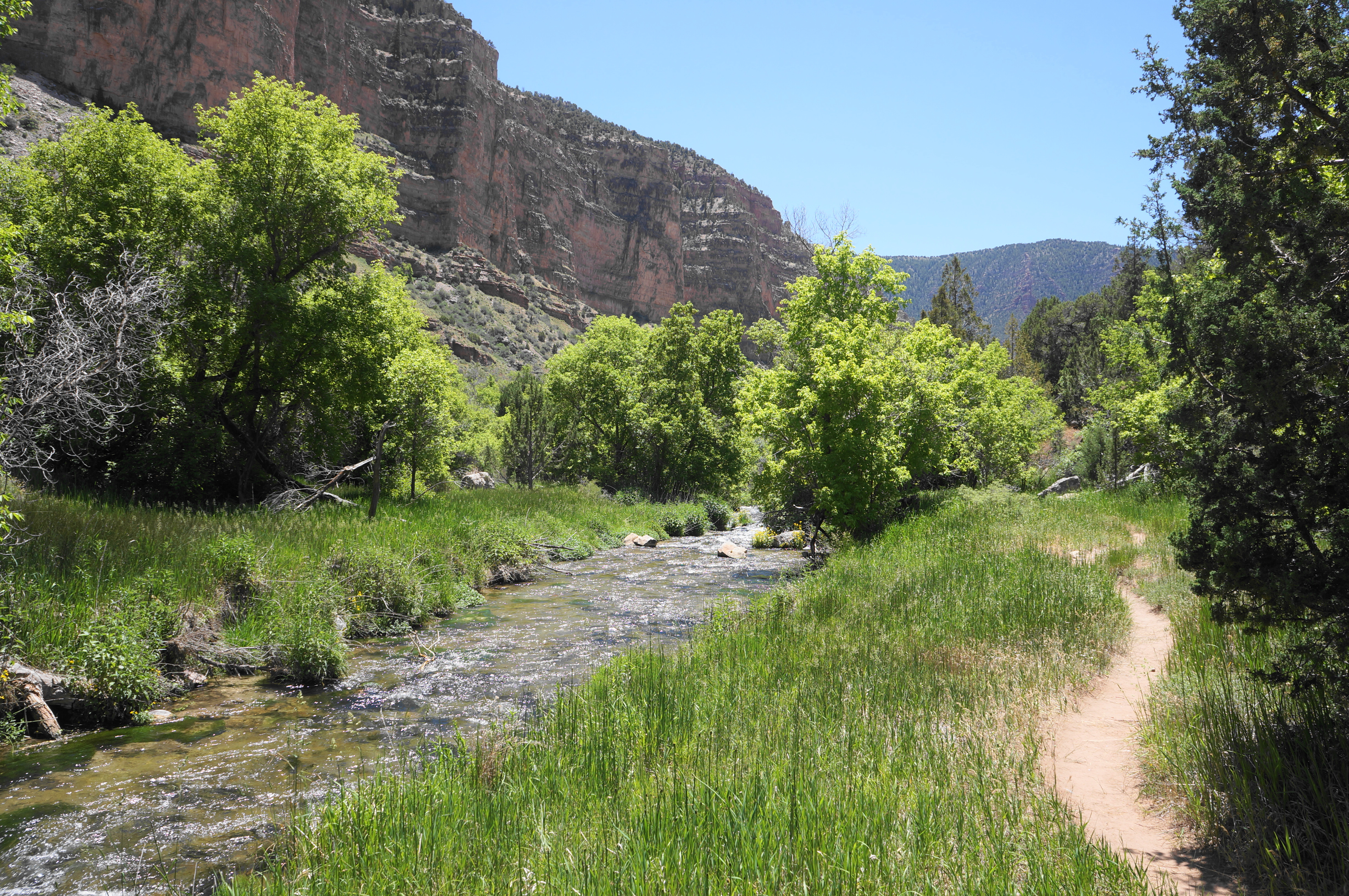 At around 2.5 miles, the trail traverses an open grassy area, covers a sudden but short up and down, and skirts a rumbling, three-foot cascade on the left. Notice, as one traverses another open and scenic plain, that the canyon walls are no longer Weber Sandstone but have shifted to a multihued limestone, an older rock layer that continues down to the Green. Looking back up-canyon, the Weber layer is no longer visible, hidden behind a hillslope.