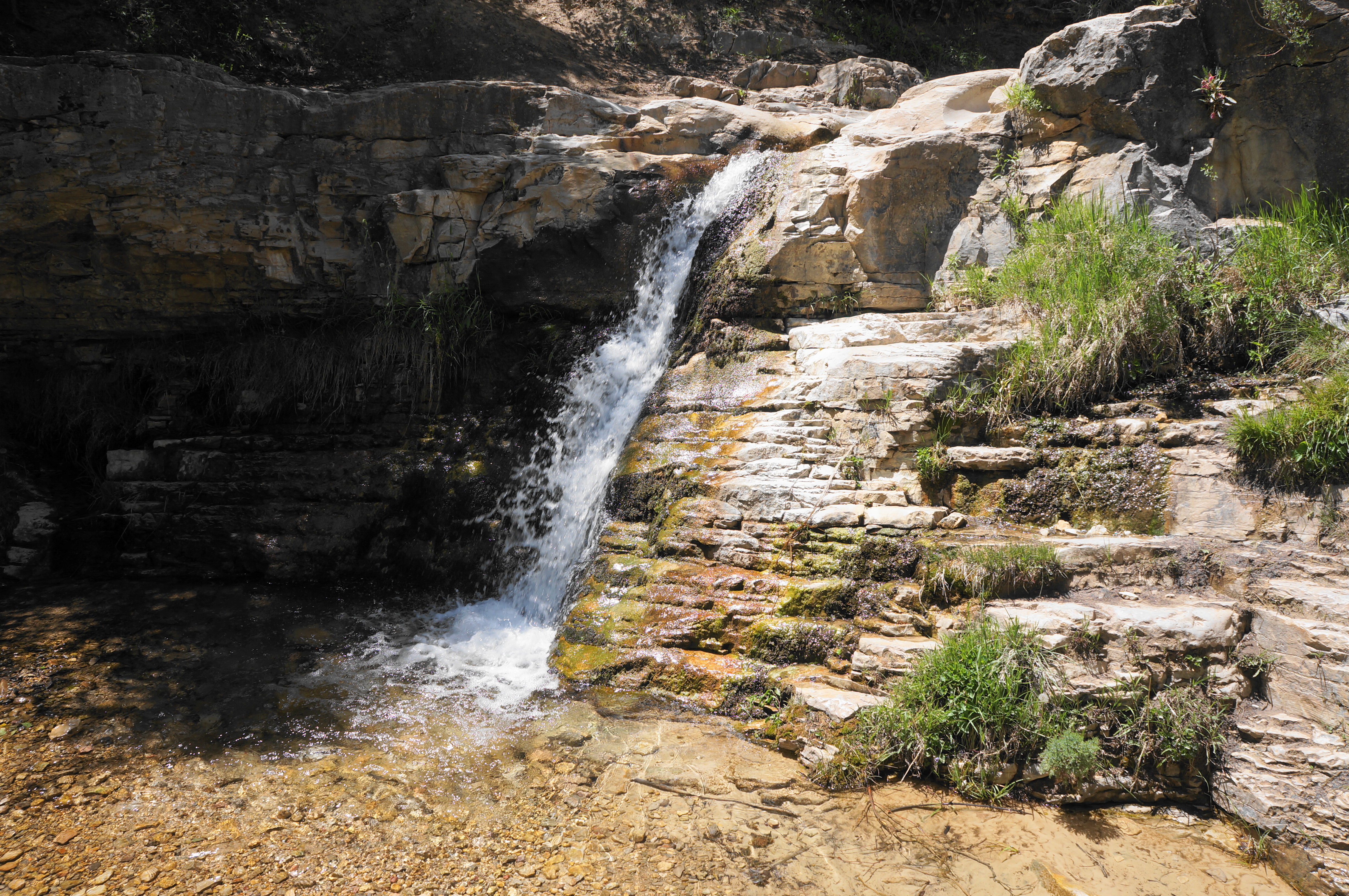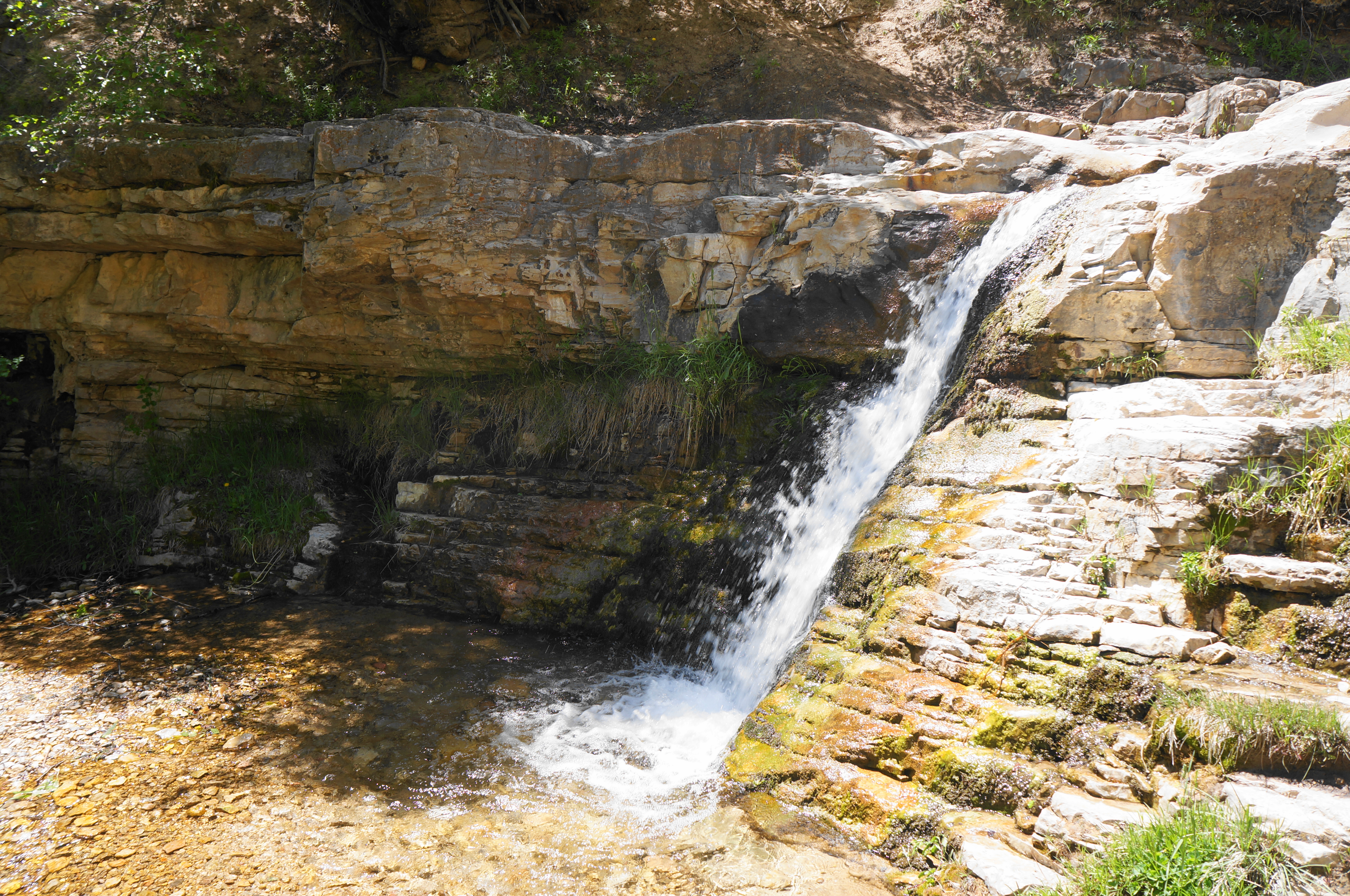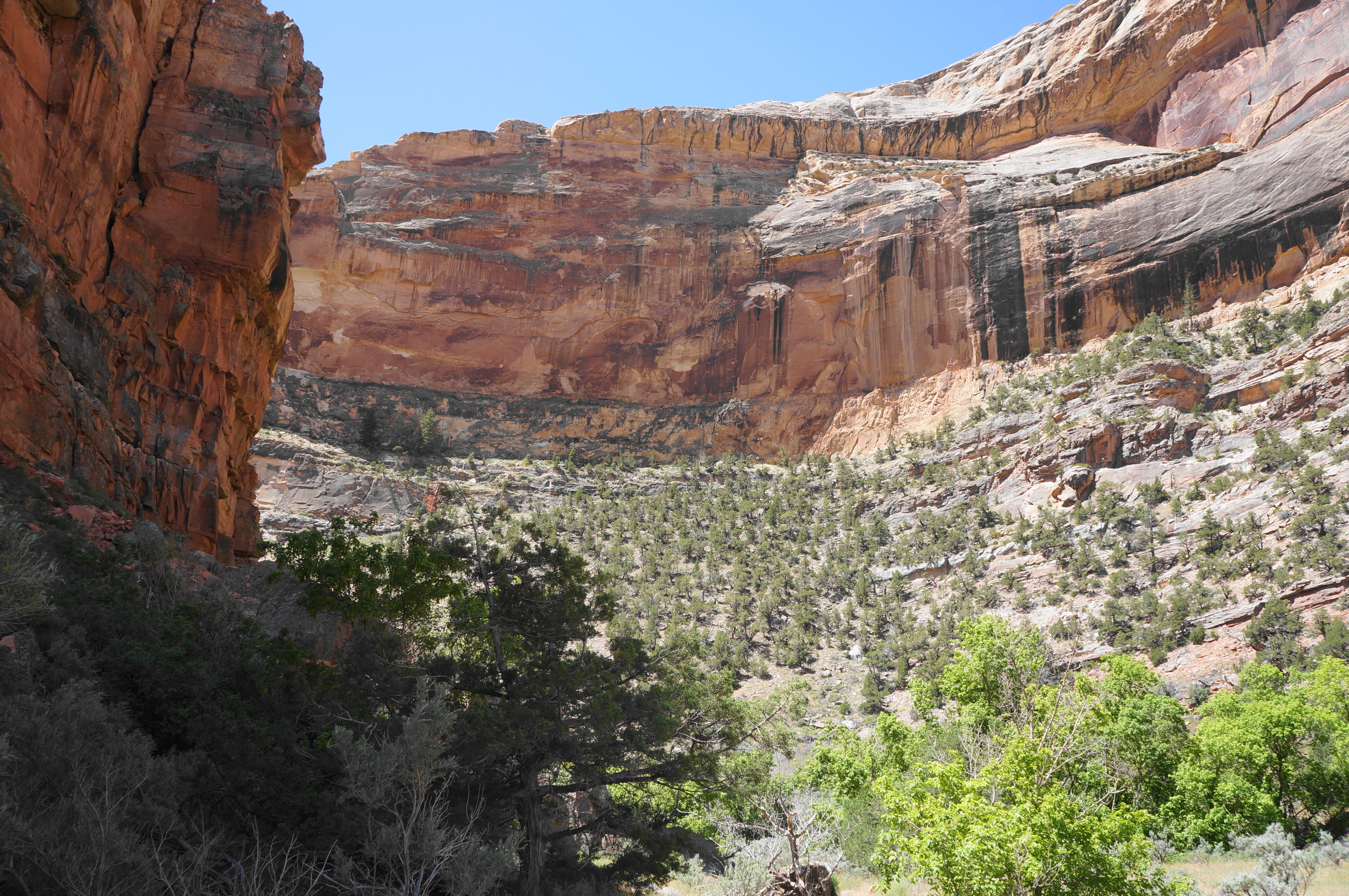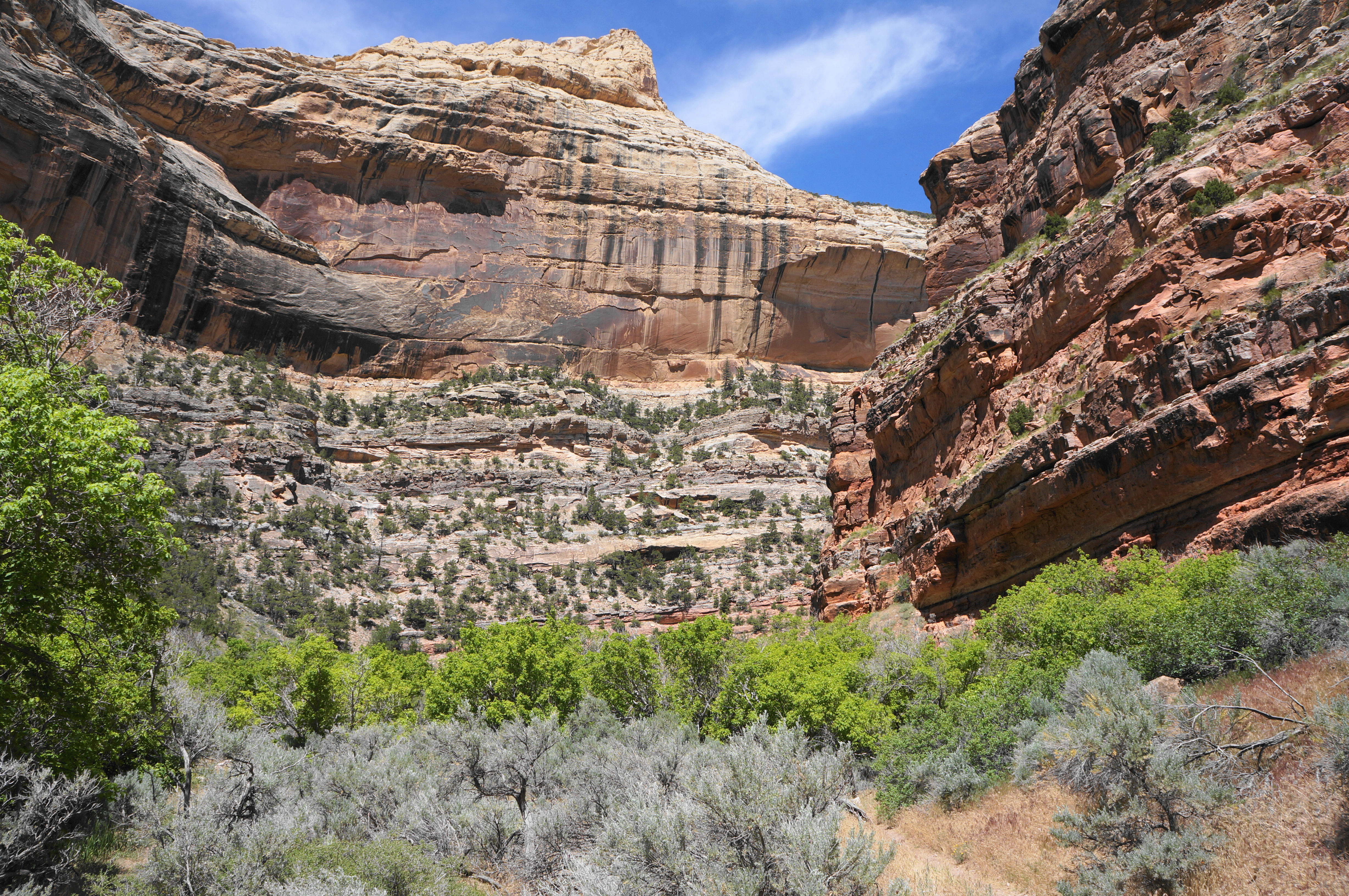 At around 2.5 miles, the trail traverses an open grassy area, covers a sudden but short up and down, and skirts a rumbling, three-foot cascade on the left. Notice, as one traverses another open and scenic plain, that the canyon walls are no longer Weber Sandstone but have shifted to a multihued limestone, an older rock layer that continues down to the Green. Looking back up-canyon, the Weber layer is no longer visible, hidden behind a hillslope.