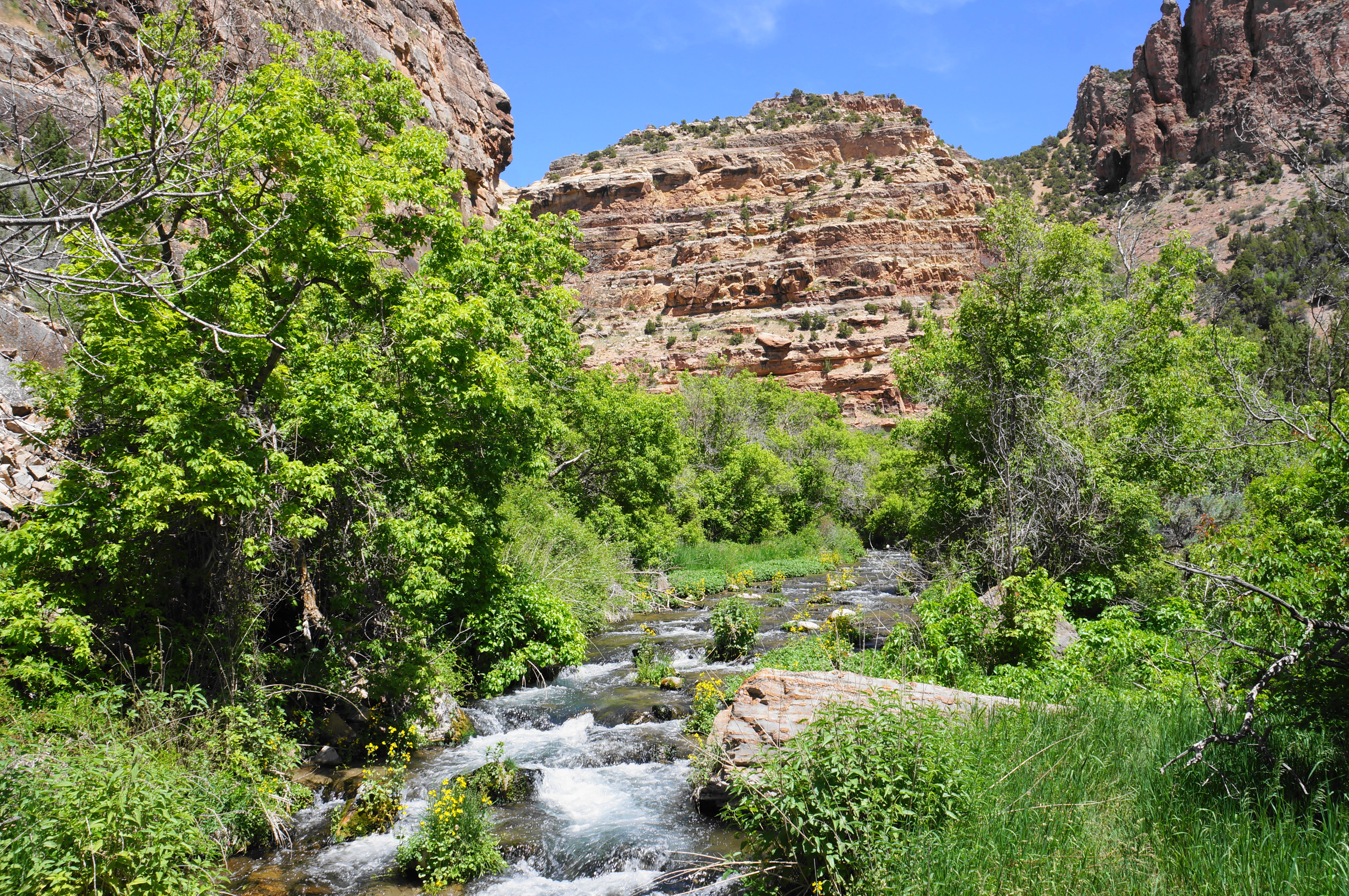 Follow the signs for the Jones Hole Fish Hatchery as the winding road drops to a basin at the foot of the Weber Sandstone, a Pennsylvania-age sedimentary layer. Fed by Jones Hole Springs, the area is surprisingly lush and riparian—a contrast with many of the nearby dry beds.