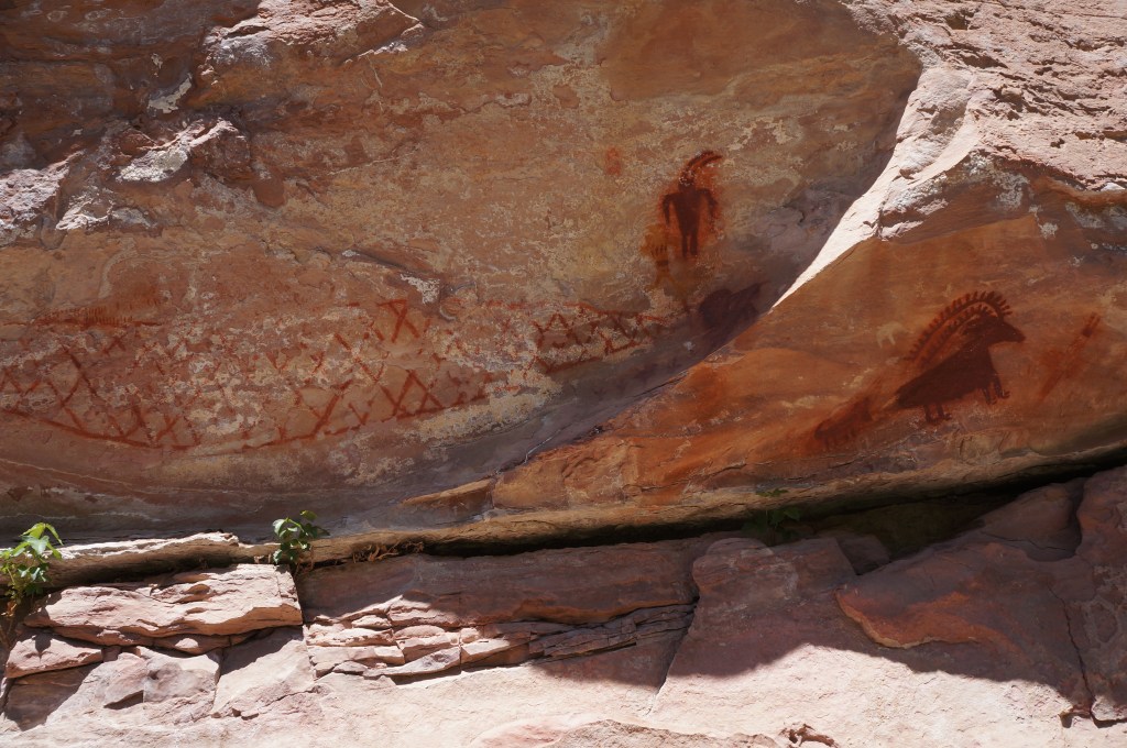 The spur trail continues for 1/10 mile or so and eventually connects back with the main trail. But soon after this initial foray, a second spur heads right again – this one leading to the much more impressive Deluge Shelter Pictographs. Unlike petroglyphs, which are carved into the rock, petroglyphs use pigments to “paint” the surface, producing more dramatic illustrations.