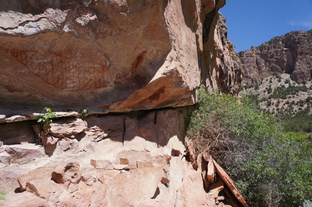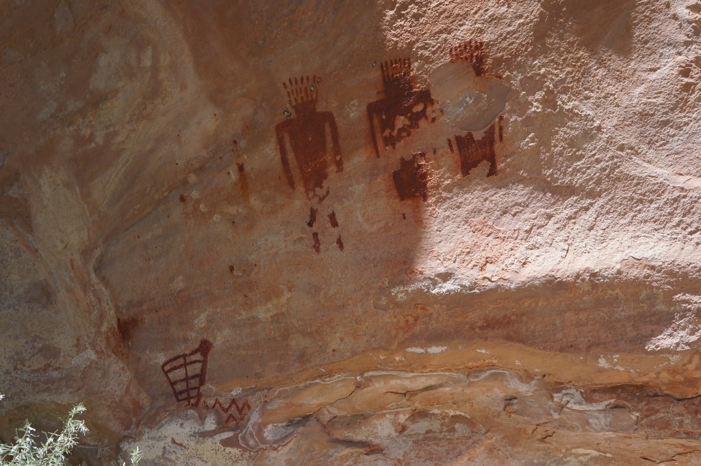 The Deluge Shelter is one of the best examples of pictographs in Dinosaur, with a representation of bighorn sheep (often found in the canyon today), an anthropoid figure, and what appears to be a large net or bed of straw. Farther down the trail, there is another depiction of what looks like three anthropoid figures.