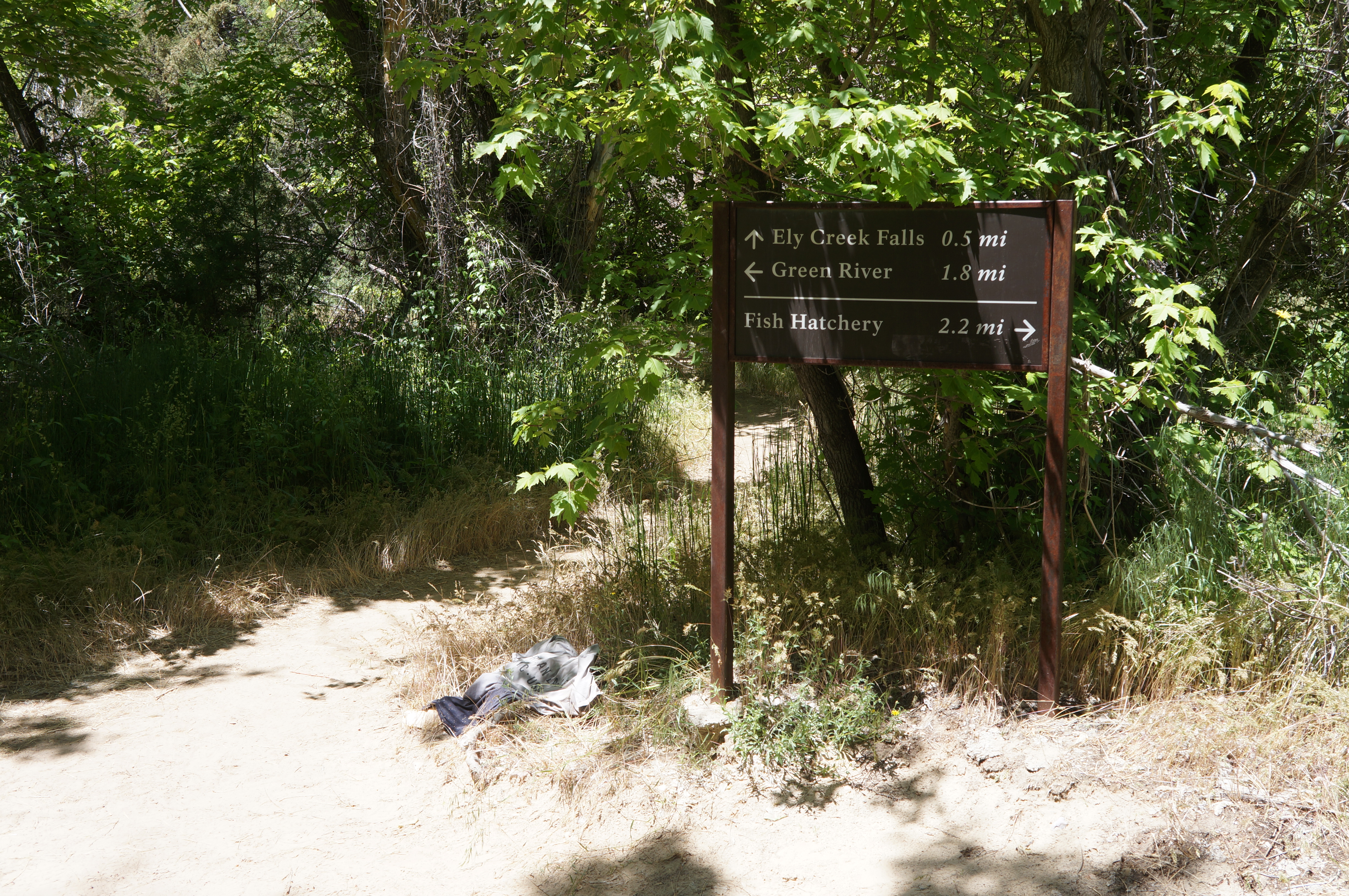 This second spur trail also loops back to the main trail, where the southward route continues between the riparian area on the left and the scrubby hillside below the towering walls on the right. It is a short walk from here to the only trail junction on the hike: here the Island Park Trail heads west toward Ely Creek Falls and beyond. (Note: The distances, however, are erratic: While the 1.8 miles to the Green River is more or less correct, the other two distances—2.2 miles to the fish hatchery and 0.5 miles to Ely Creek Falls—are gross exaggerations. I tracked 1.75 miles from the fish hatchery to this point and a mere .15 miles or so to the falls.)